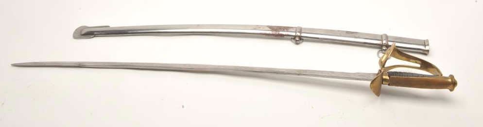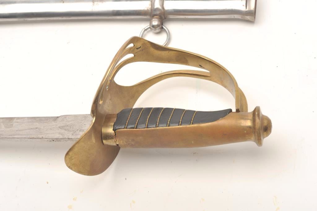 Reproduction sword marked India. The sword is in good overall condition with a 34” blade and an overall length of 39”. The blade shows scabbard and handling marks with light surface rust at the ricasso. The handguardis brass and grip is wire wrapped leather. A polished metal scabbard accompanies this reproduction. Est.: $15-30