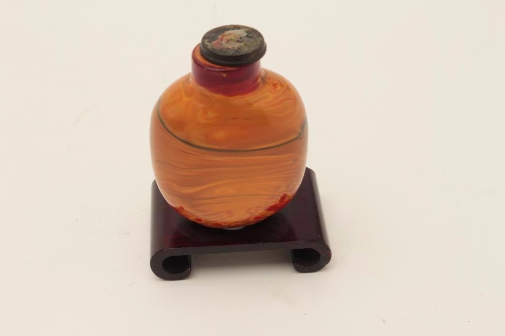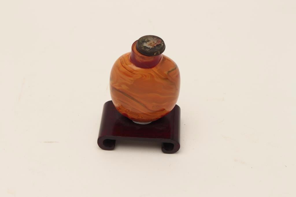 Lot 10 Carvede agate snuff bottle on rosewood stand; top stone missing but dipper retained; approximately