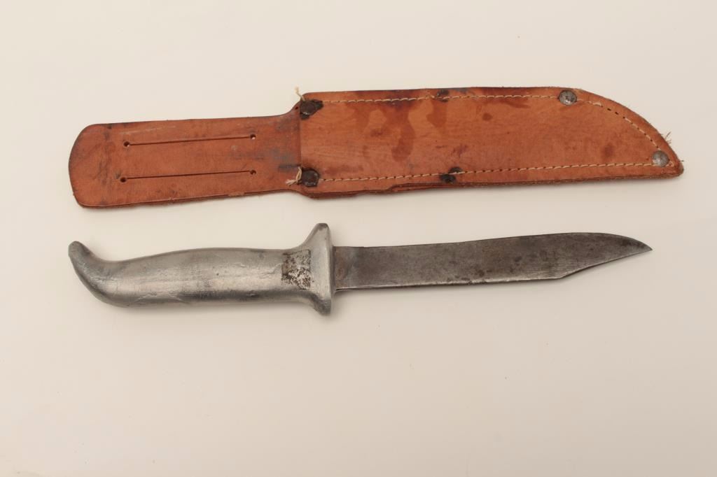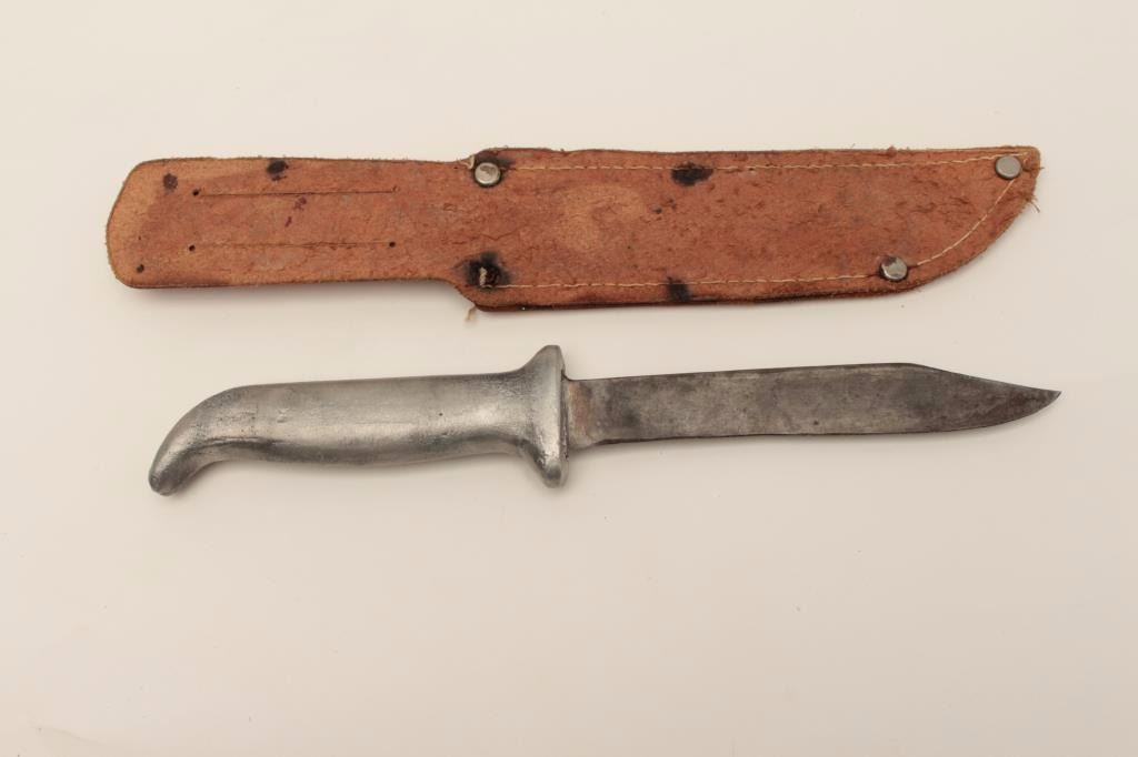 Lot 14 In-theater made WW II era fighting knife; aluminum grip; leather scabbard. Est.: $100-$200