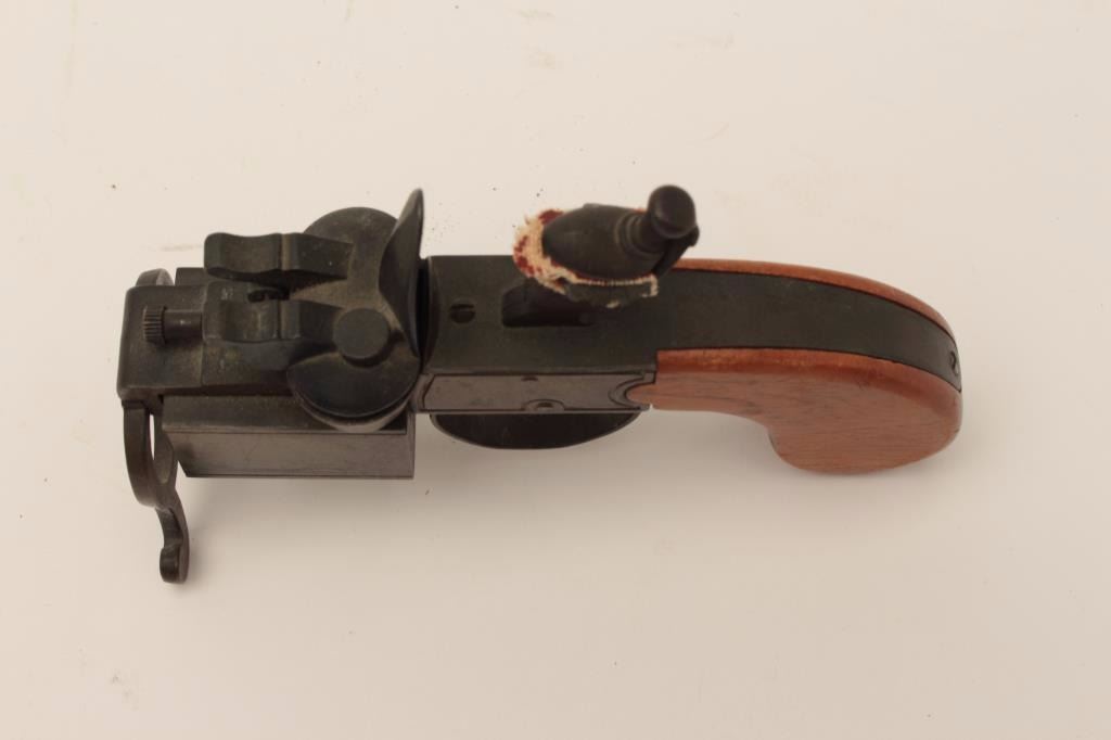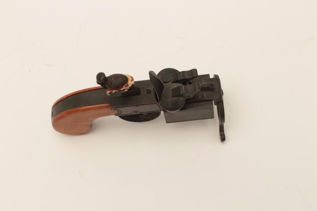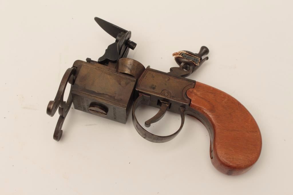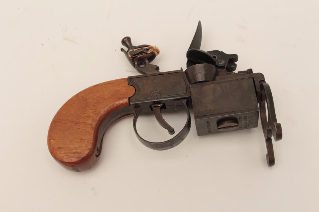 Dunhill-marked antique lighter in form of tinder lighter; made in U.S.A./patent applied for; intact but not quite working; otherwise good patina; approximately 50-80 years old. Est.: $75-$150.