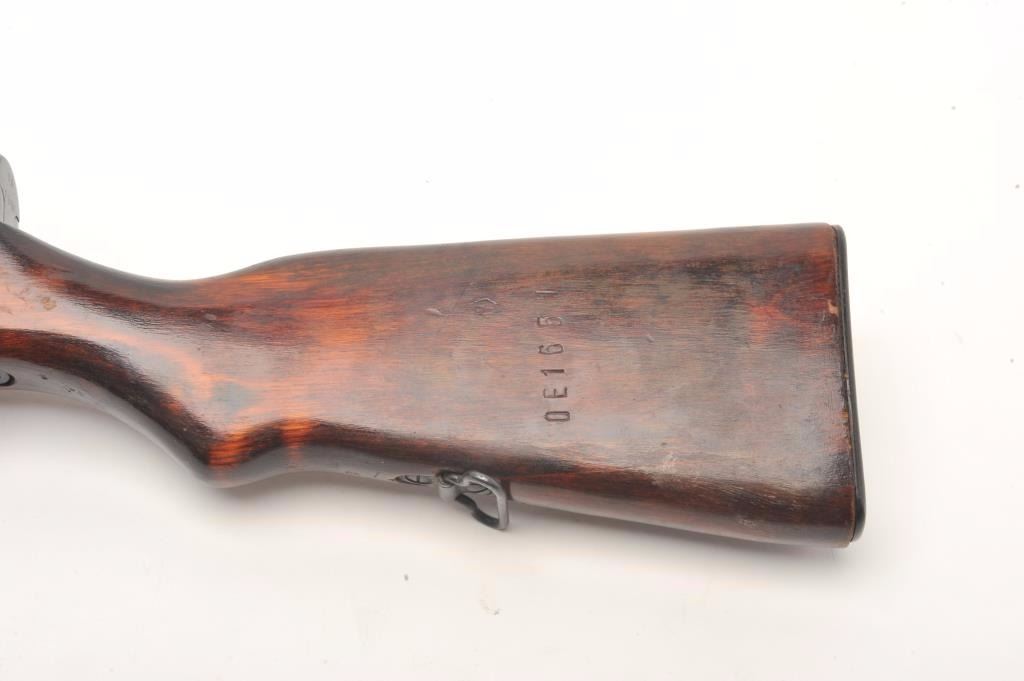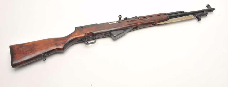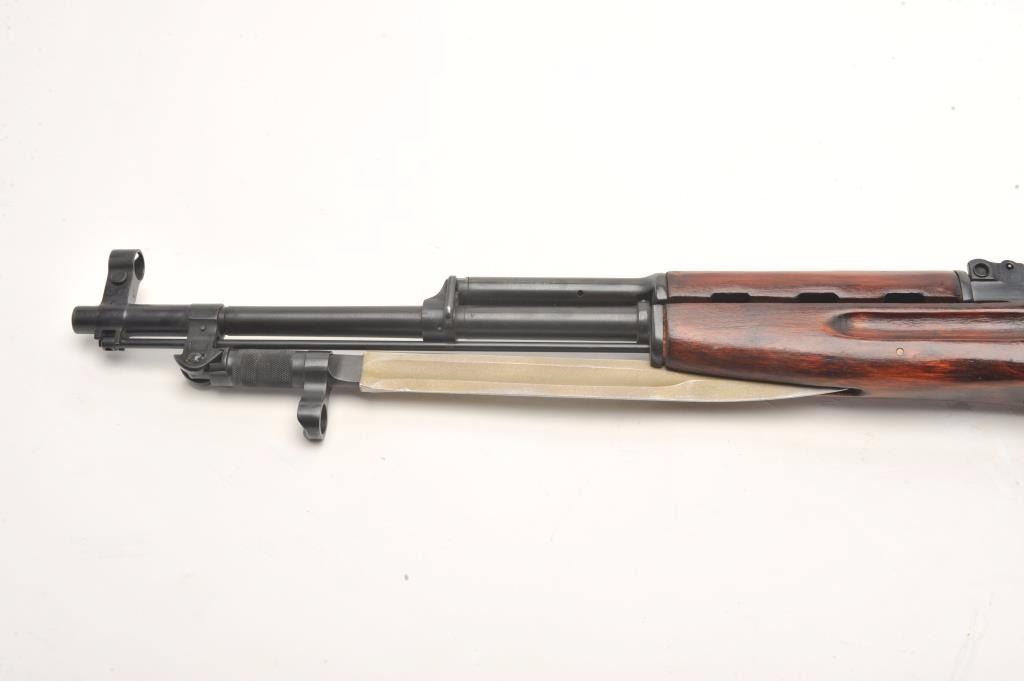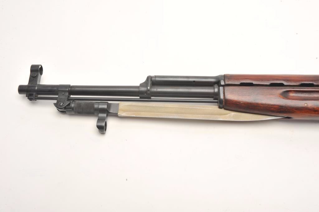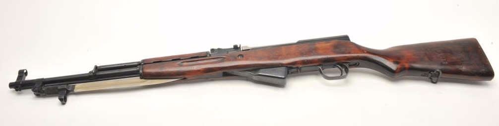 Russian SKS semi-auto rifle, 7.62 x 39 caliber, serial #OE1651. The rifle is in very good overall condition with a 20” barrel with hooded front and military style tangent rear sights. The barrel and receiver retain nearly all of their military finish with only minor storage marks noted. All visible serial numbers including the butt stock are matching. There is minor light surface rust on the bolt and the dust cover is dated 1953. The smooth wood stock is in good condition showing small mars and handling marks. The butt stock ends with a smooth steel butt plate with trap. The rifle includes a proprietary folding bayonet. The chromelined bore is very good, the action crisp and markings are sharp. A clean, lightly used SKS. (Modern) Est.: $150-300.