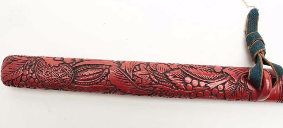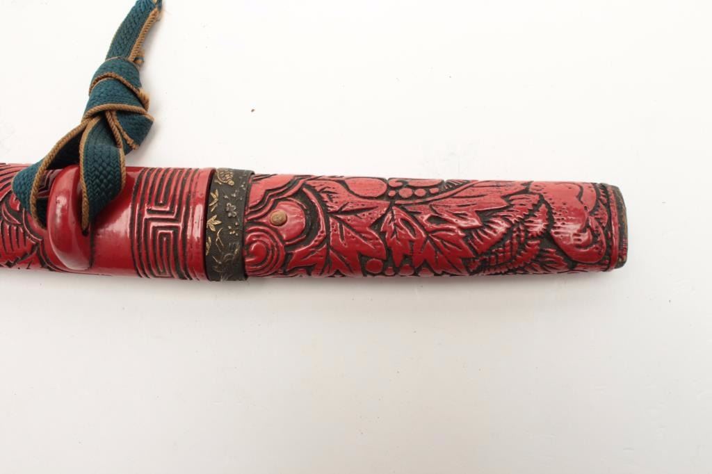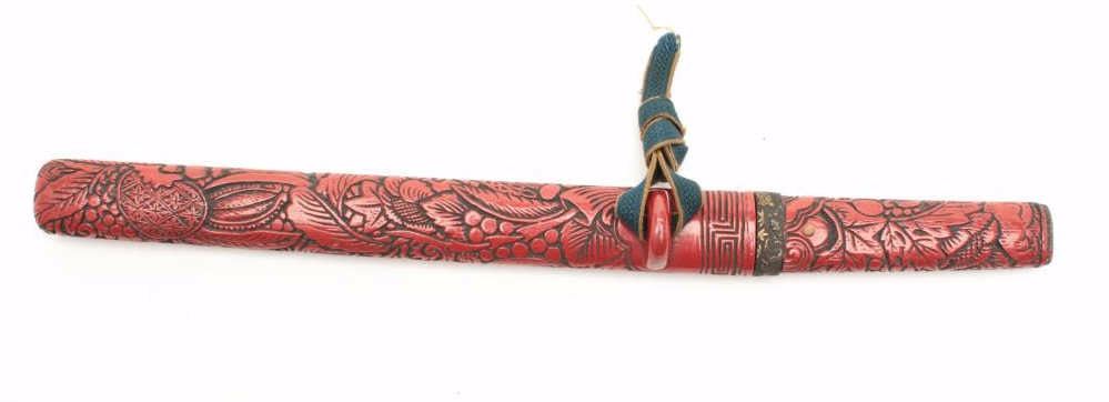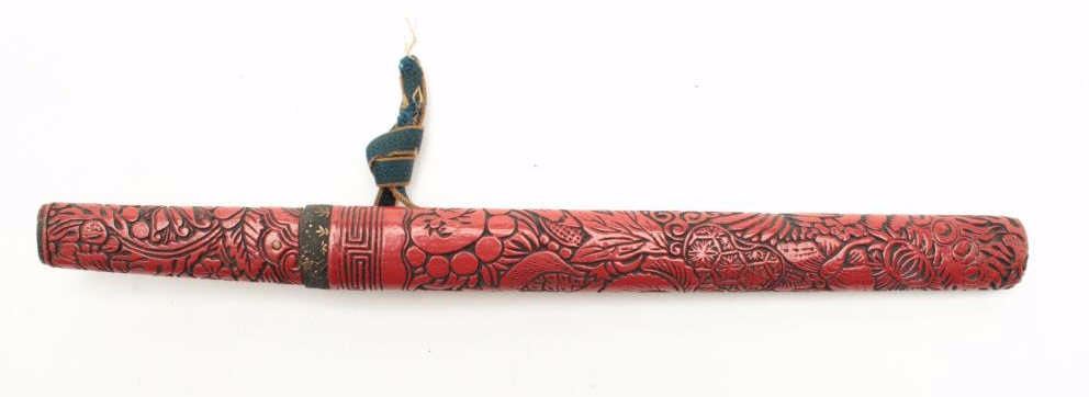 Japanese Cinnibar mounts for a Tanto sword. The lot includes the mounts without blade. Ornately carved with an overall length of 15 ½”, the mounts and scabbards are in good condition. Est.: $125250