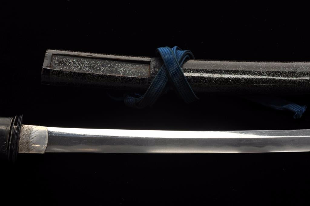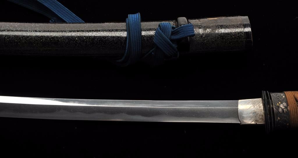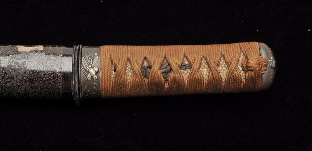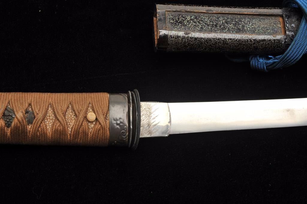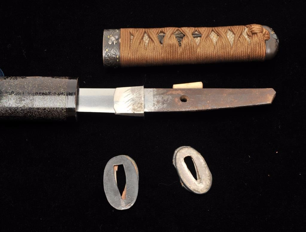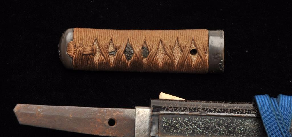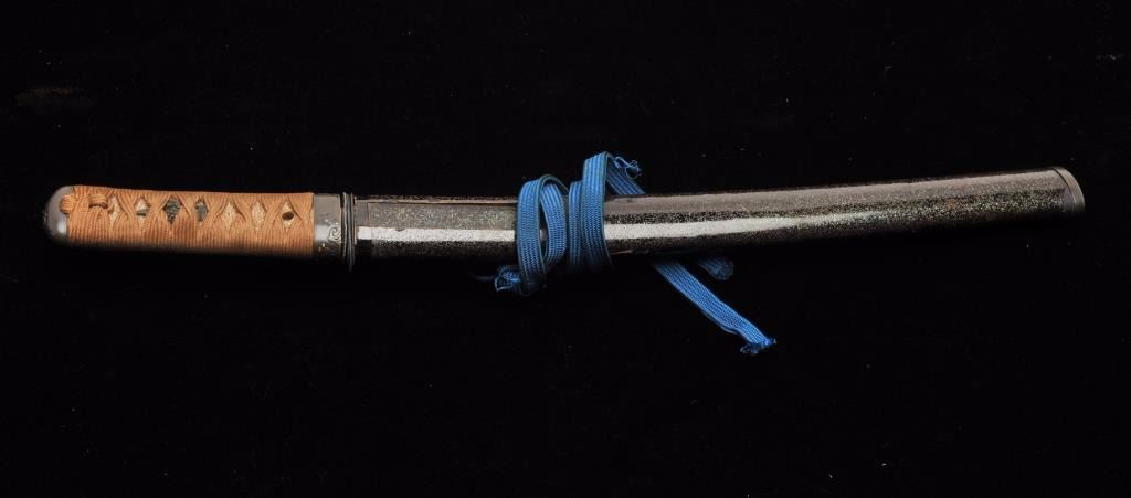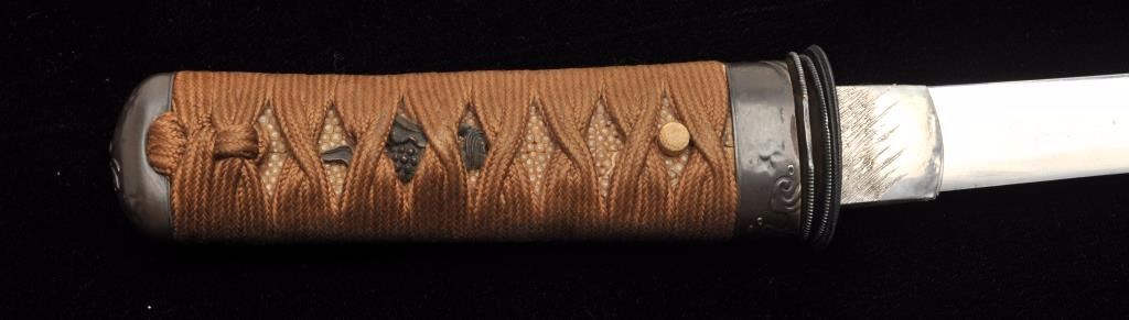 Koto to Shinto period tanto (Short sword) unsigned in traditional mounting missing kozuka knife in the scabbard. 12” blade of good quality and fresh polish. The mounts are 19th century or earlier with soft metal andfancy inlays. Some minor damage to the scabbard. Est.: $250-500