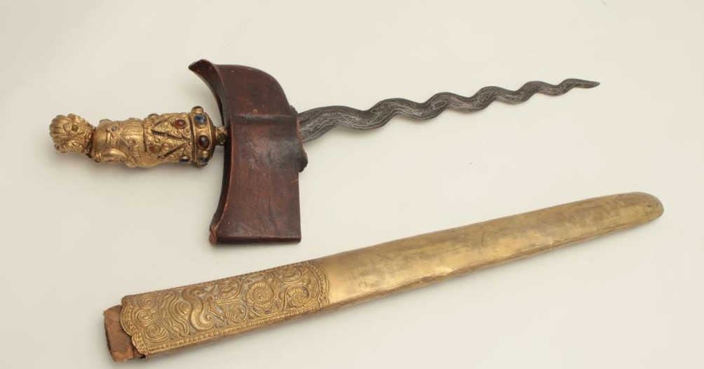 Lot 35 Beautiful Jeweled Malaysian Kris with carved deity handle. The Kris is in good condition with an