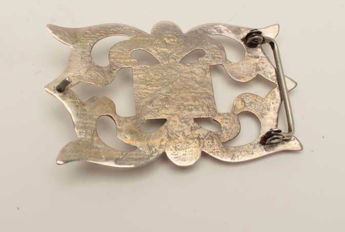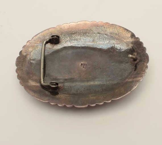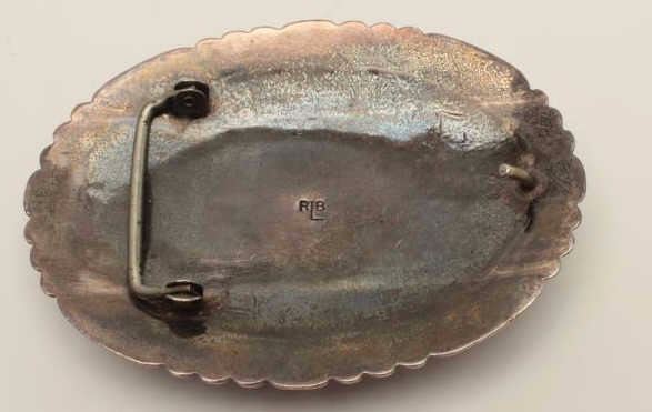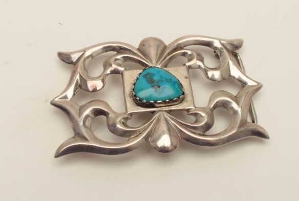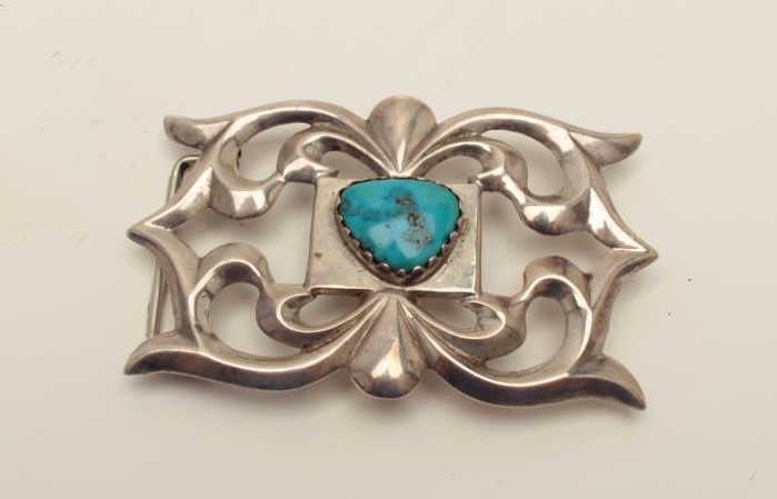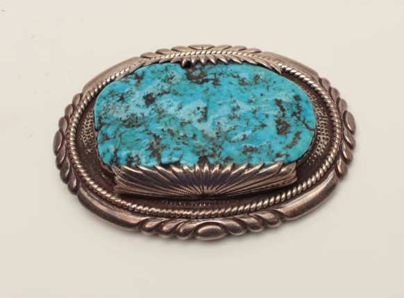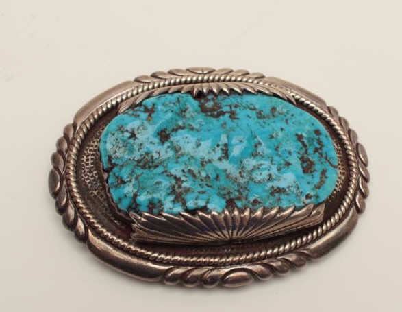 Lot 41 Huge turquoise nugget in silver buckle signed “R.L.B.” (Begay family?) along with a classic sandca
