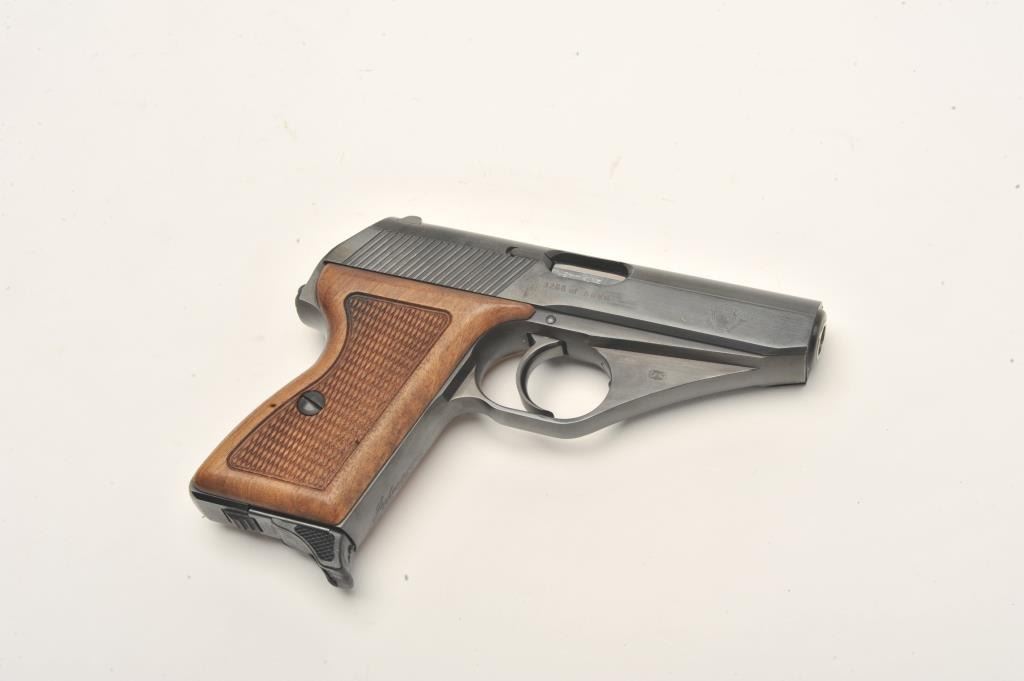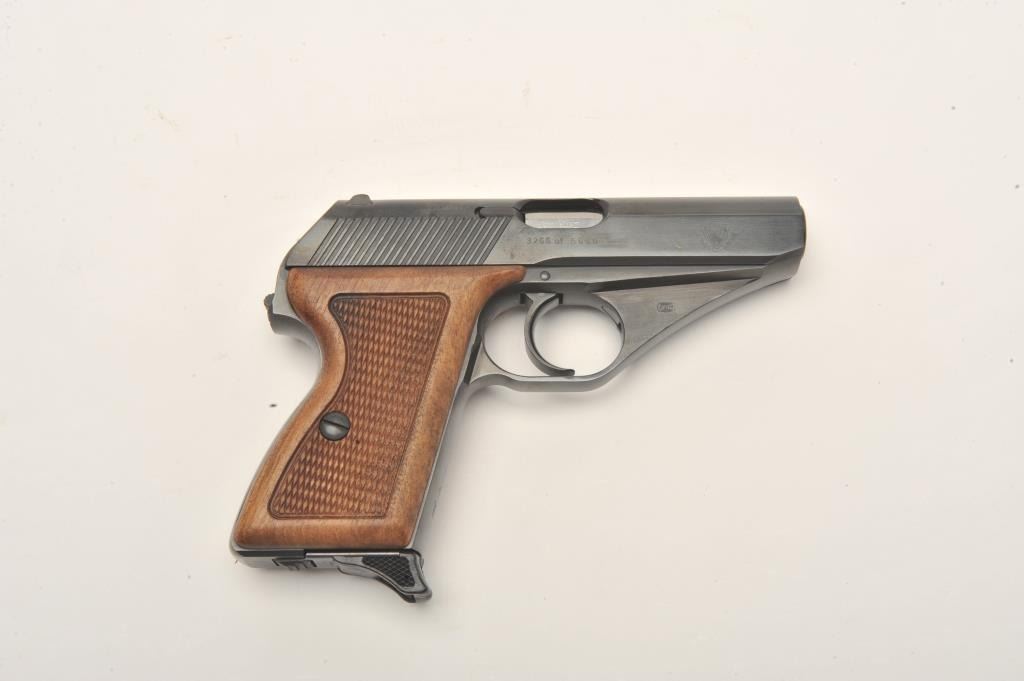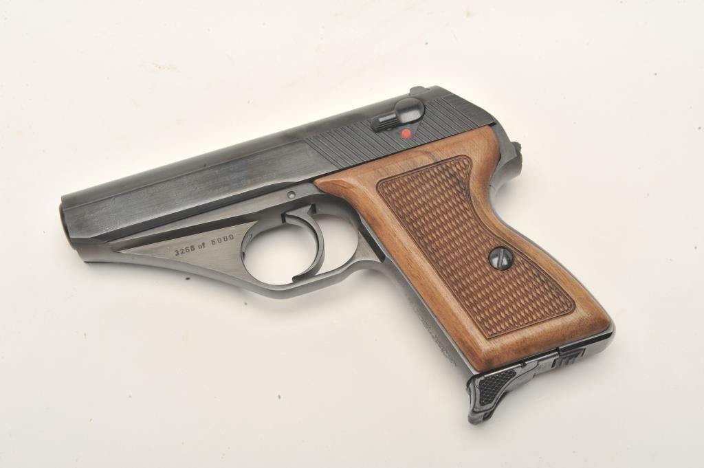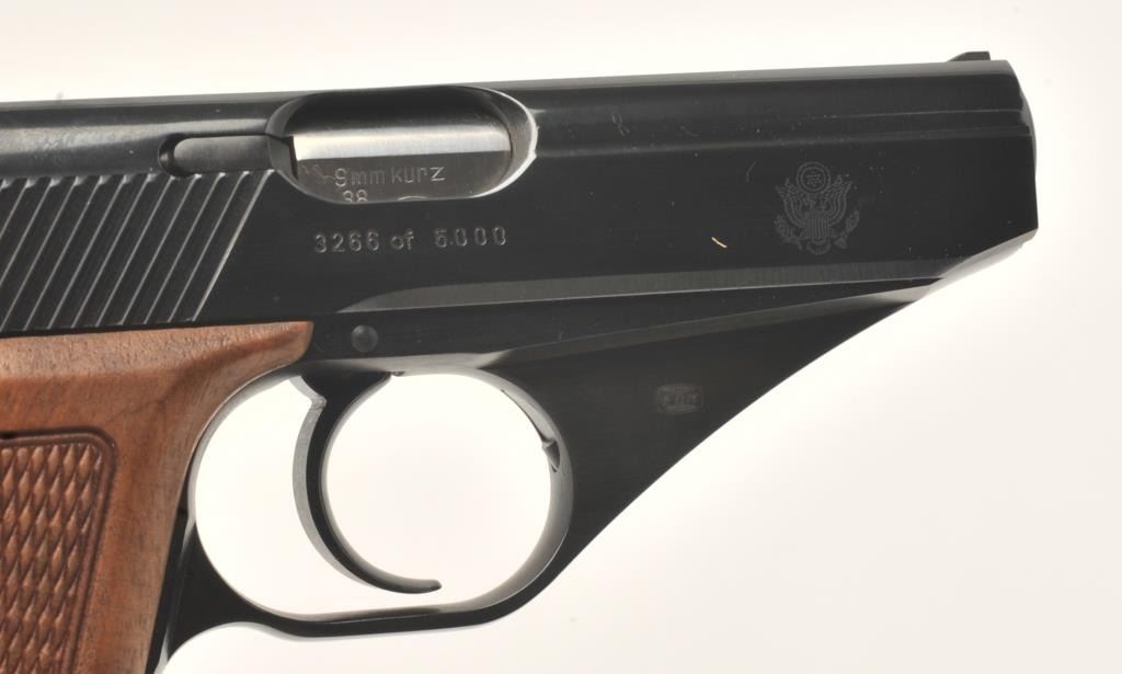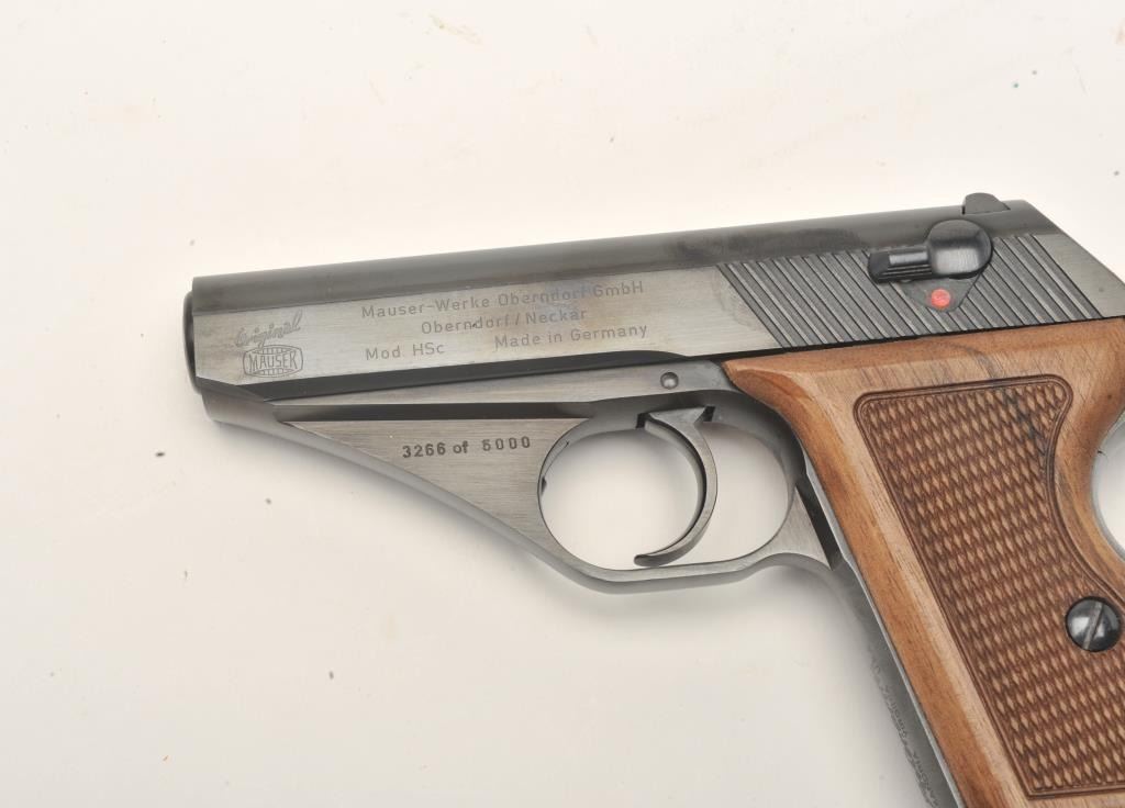 Mauser Model HSc American Eagle “one of five thousand” special edition made for Interarms, 9mm kurz caliber, 3.25” barrel, blued finish, checkered wood grips, S/N 3266 of 5000 in overall like new condition withfactory box and cardboard sleeve, instructions and one extra magazine. Est.: $600-$1,200.