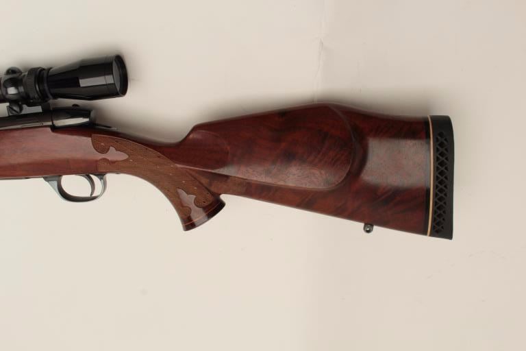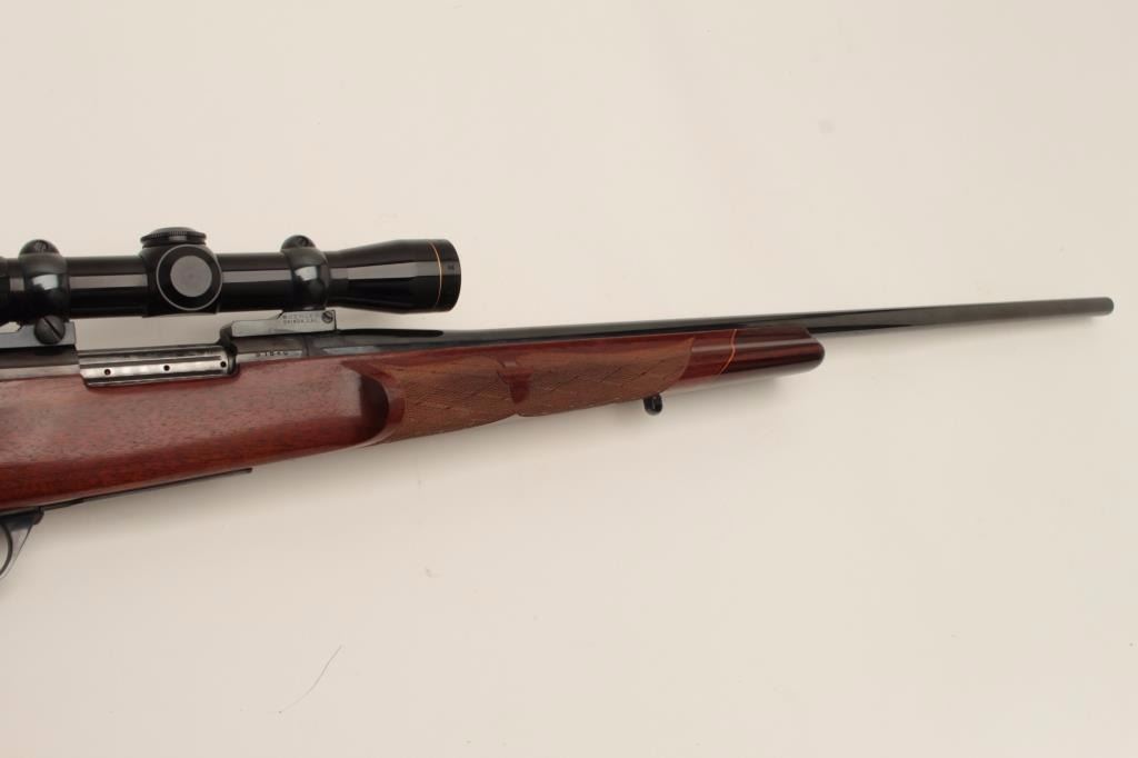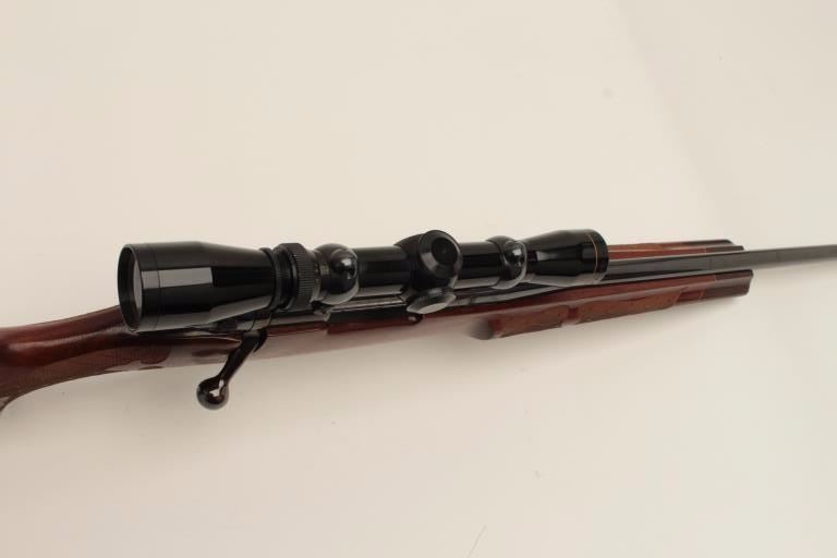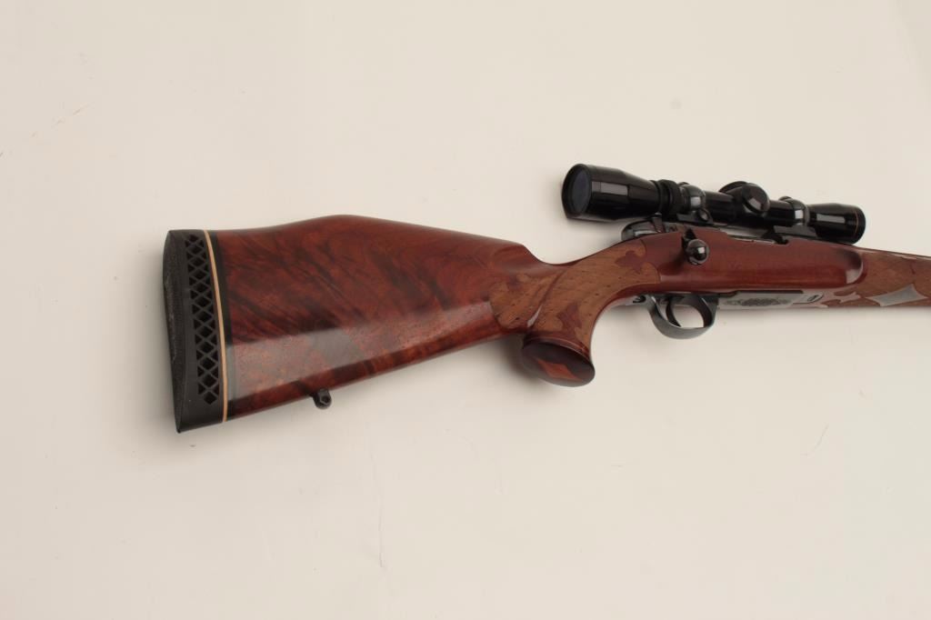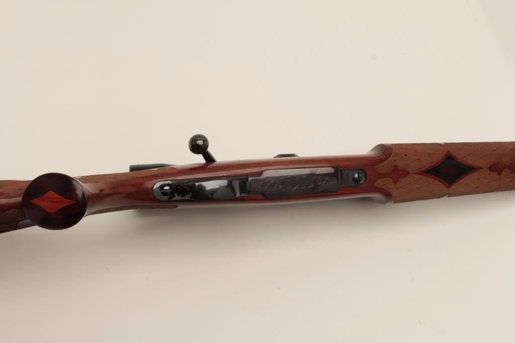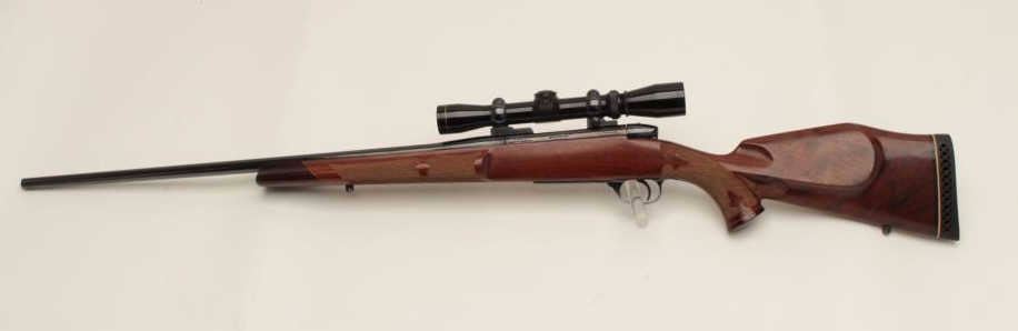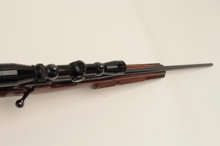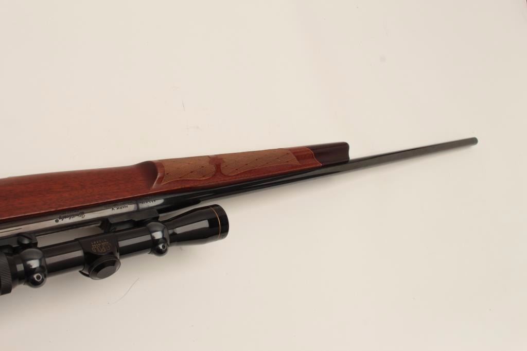Weatherby Mark V Varmintmaster bolt action rifle, .243 caliber, 24” barrel, blued finish, custom checkered deluxe wood stock, S/N 51640, in overall fine condition displaying the majority of its originalfinish, fine bore, action, markings and custom stock. (Modern/PPT). Est.: $700-$1,400.