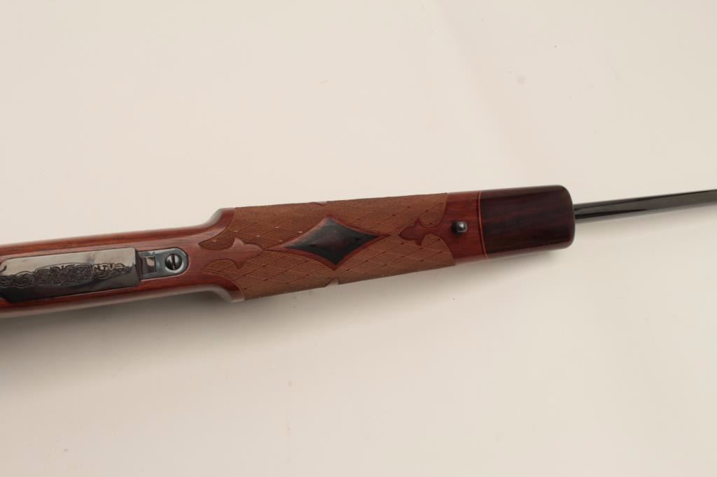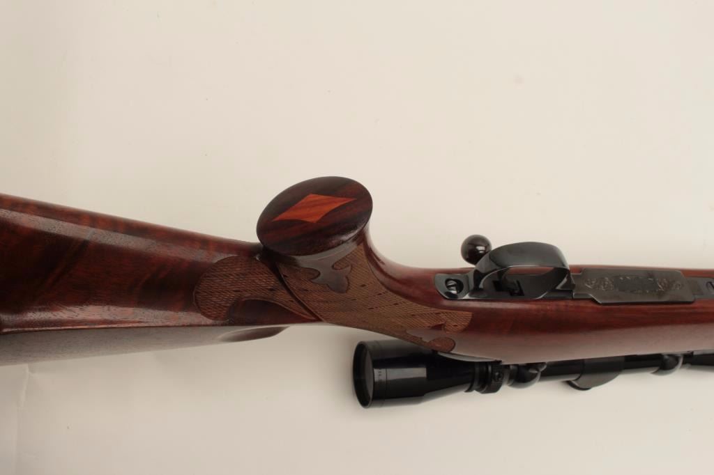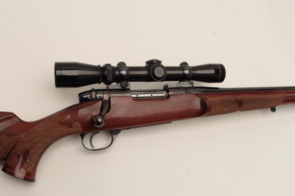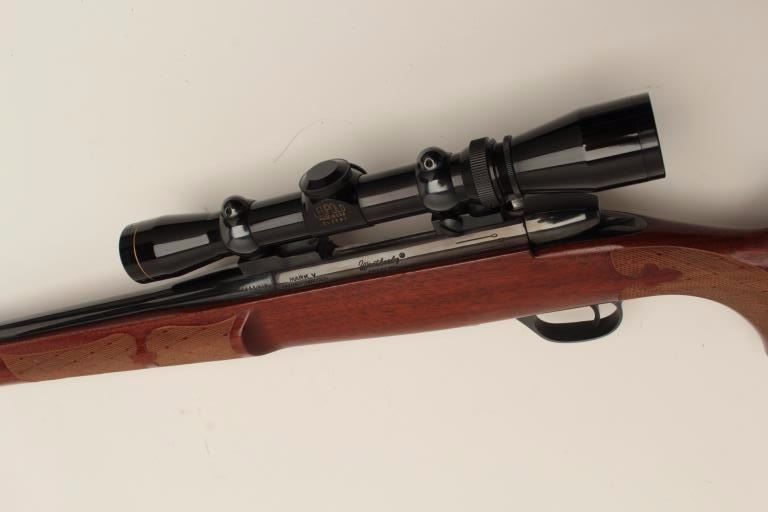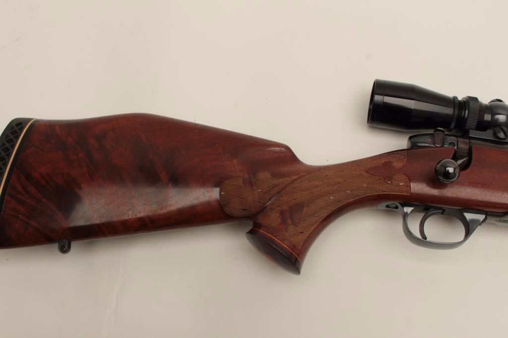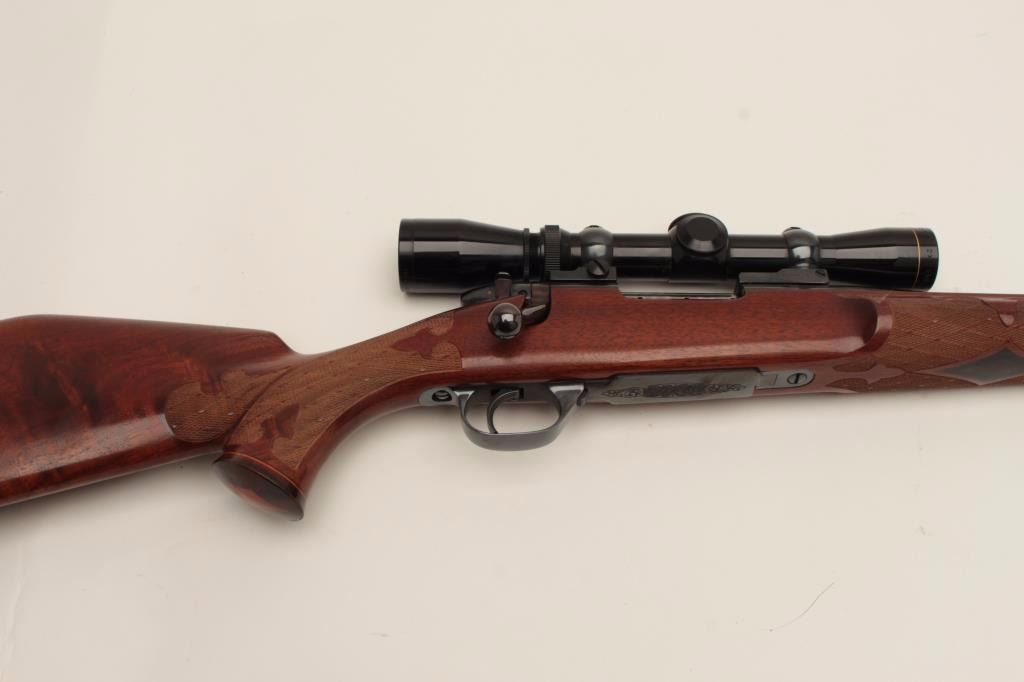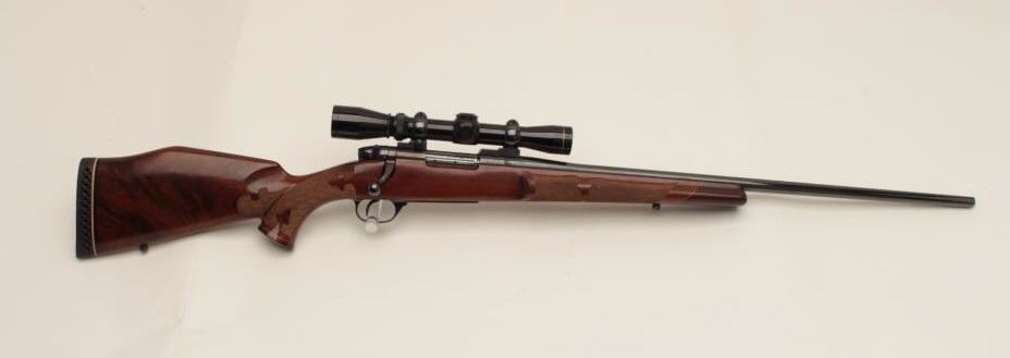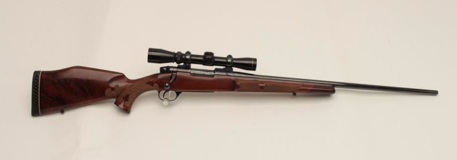 Weatherby Mark V Varmintmaster bolt action rifle, .243 caliber, 24” barrel, blued finish, custom checkered deluxe wood stock, S/N 51640, in overall fine condition displaying the majority of its originalfinish, fine bore, action, markings and custom stock. (Modern/PPT). Est.: $700-$1,400.