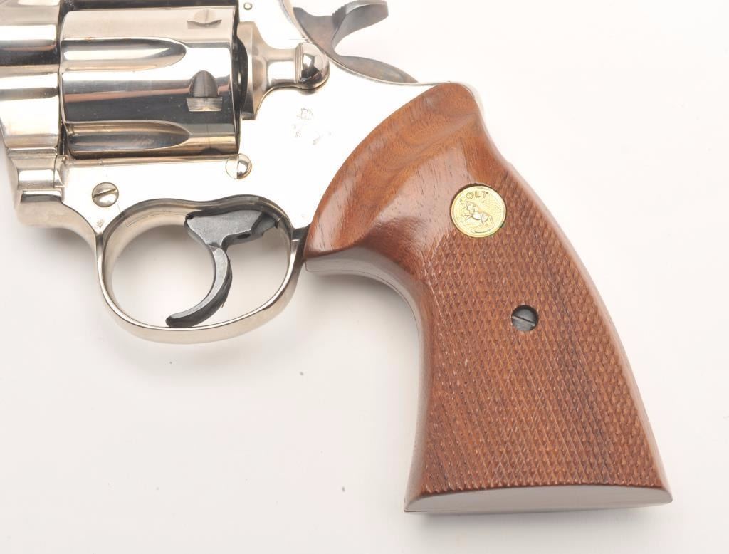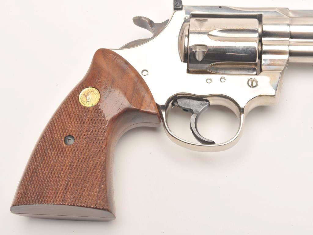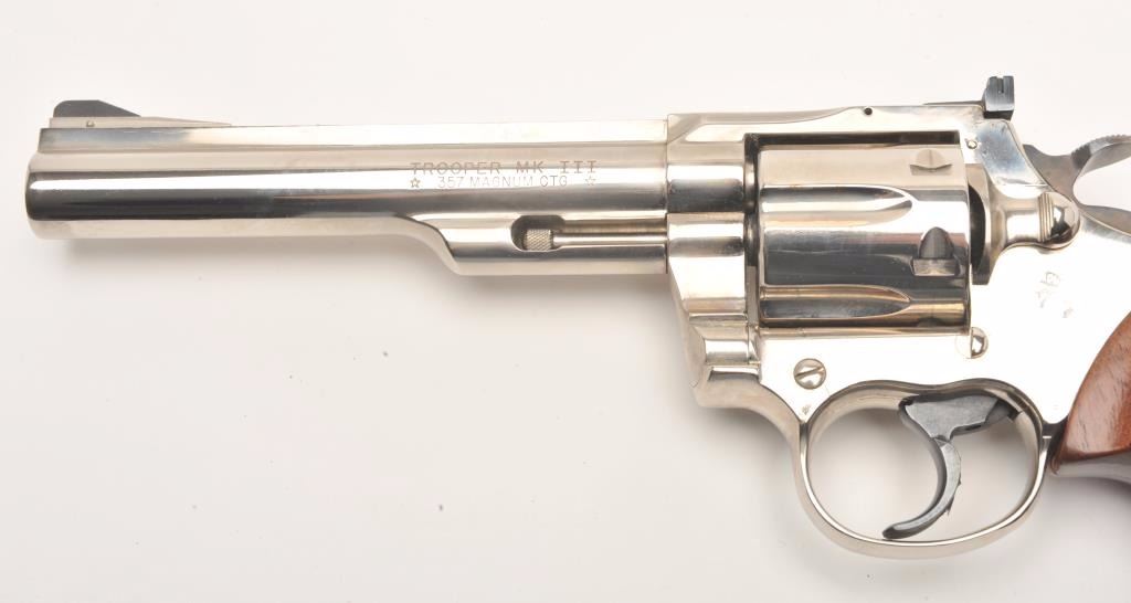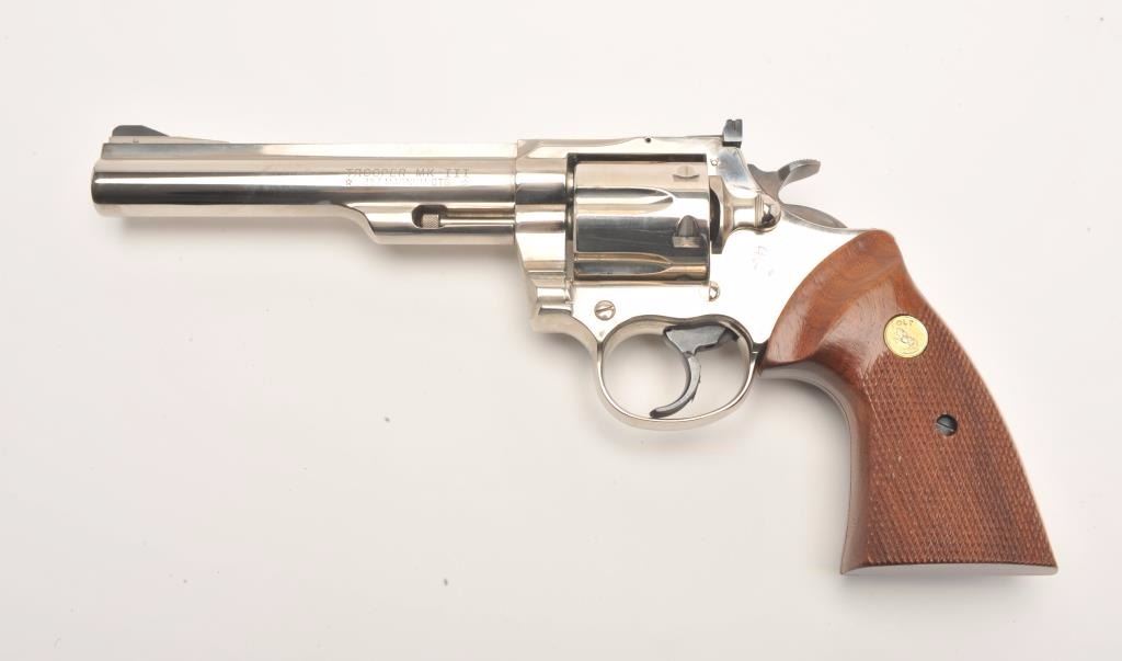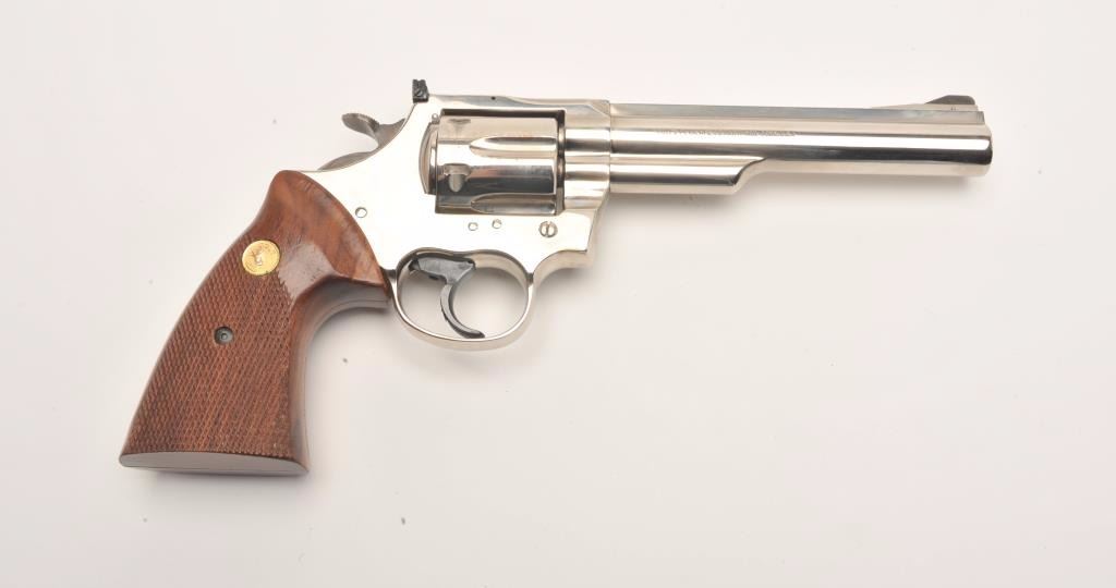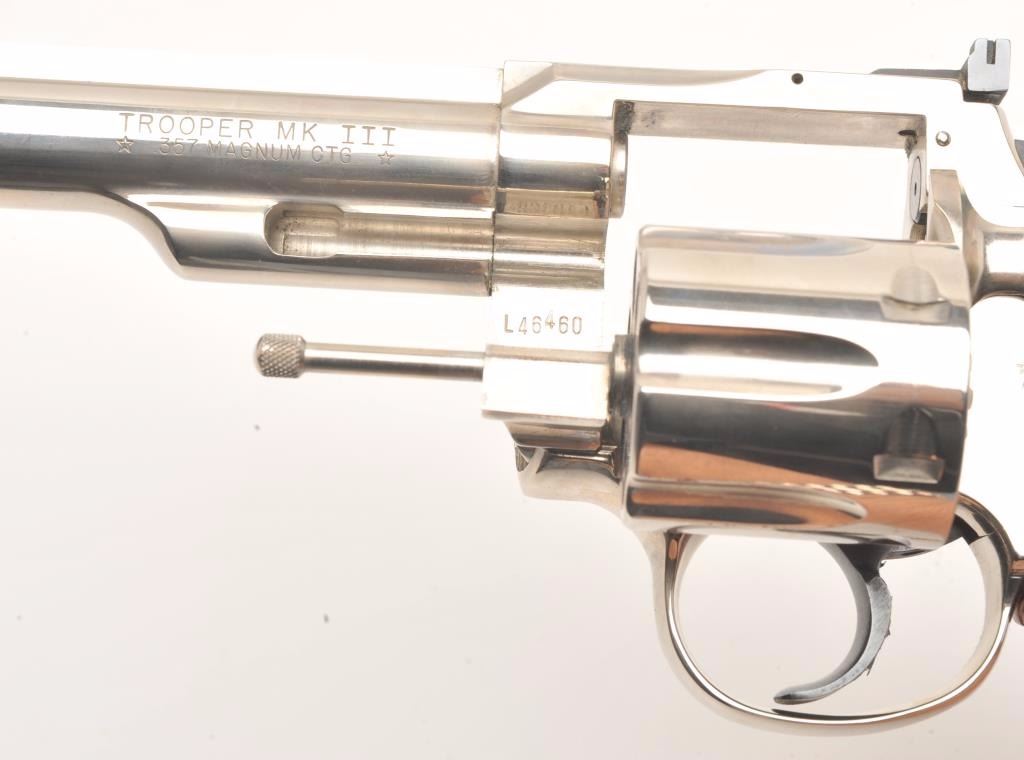 Colt Trooper MK III DA revolver, .357 Magnum caliber, 6” barrel, factory nickel finish, checkered wood medallion combat grips, S/N L46460, in overall fine condition showing the majority of its original nickel finish, fine bore, action, markings and grips. (Modern/PPT). Est.: $700-$1,400.