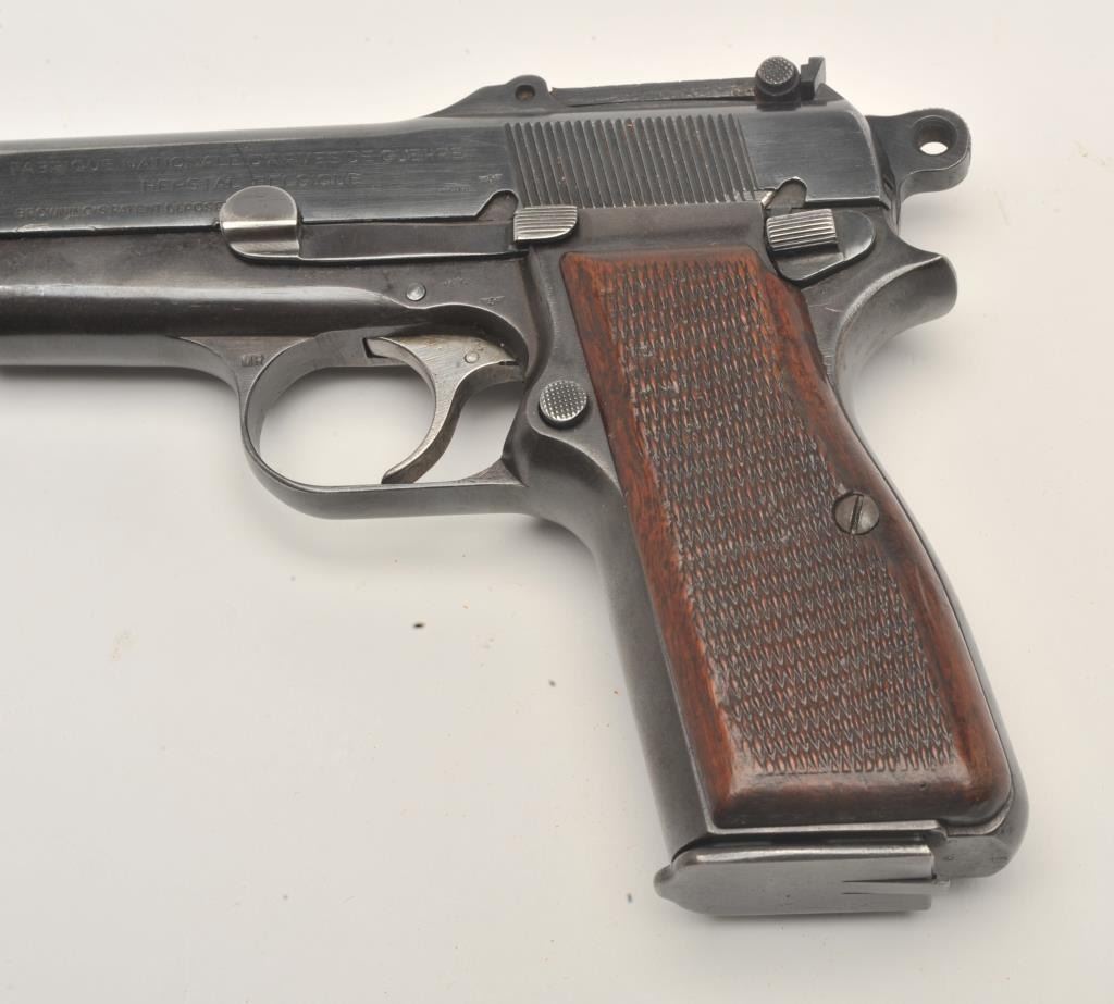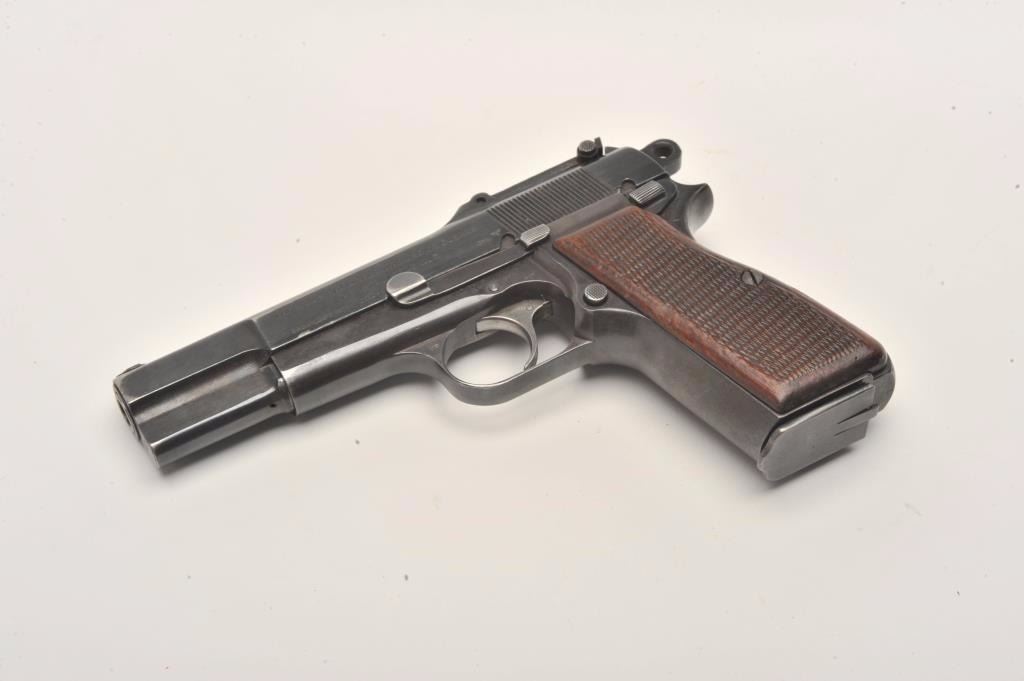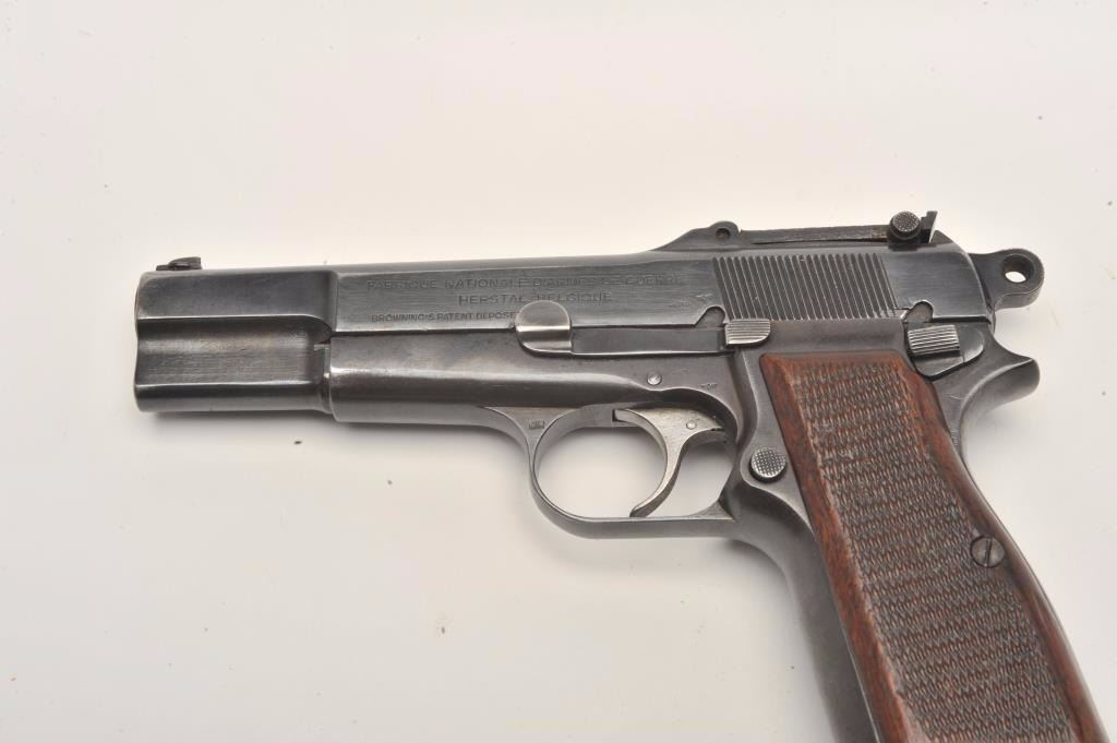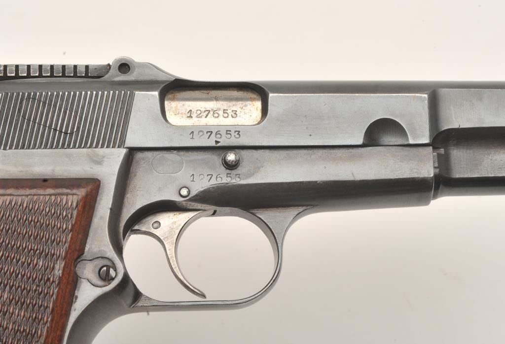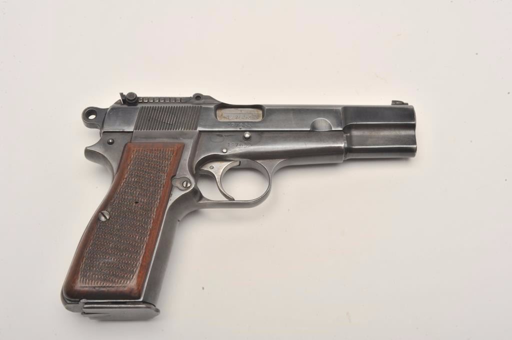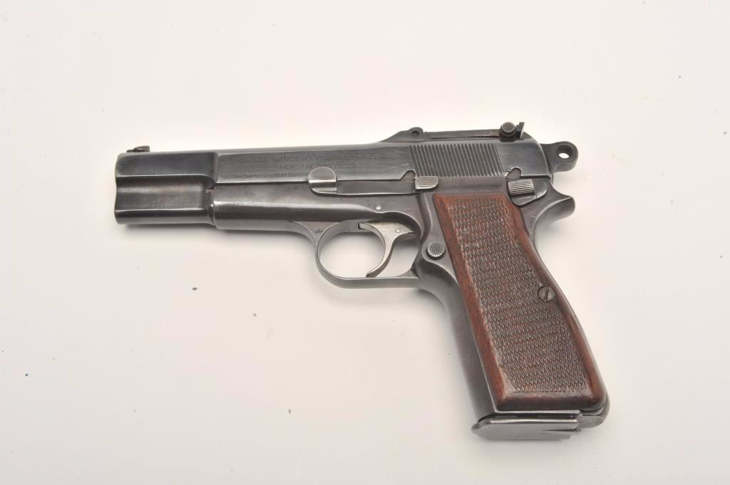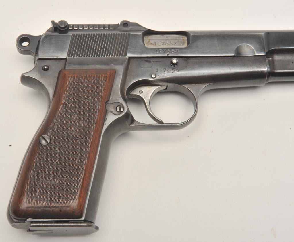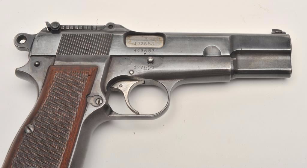 FN Browning Hi-Power semi-automatic pistol, Tangent sight, nazi proofed, 9mm caliber, blued finish, checkered wood grips, S/N 127653, in overall very good condition displaying the majority of its militaryfinish, crisp action and markings, very good grips, good bore. (C&R/PPT). Est.: $700-$1,400.