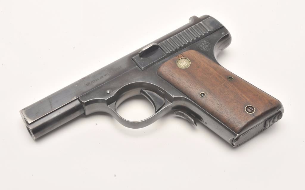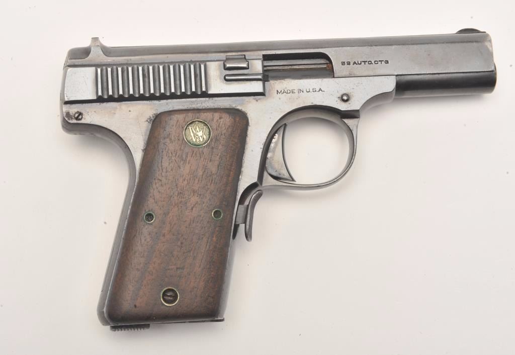 Lot 65 Scarce Smith & Wesson .32 caliber semi-automatic pistol, 3.5” barrel, blued finish, smooth wood me