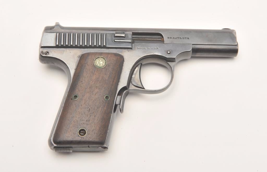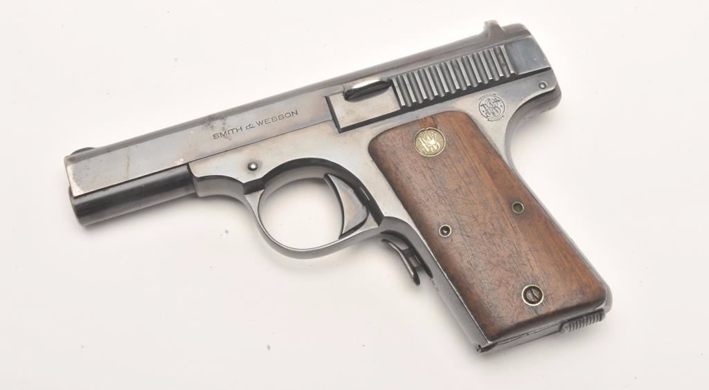 Scarce Smith & Wesson .32 caliber semi-automatic pistol, 3.5” barrel, blued finish, smooth wood medallion grips, S/N 199, in overall very good + condition showing the majority of its original finish with somemuzzle and high point wear, near fine bore, crisp action, sharp markings and good grips with a small old chip out of the top left grip. Only 957 of this Model were manufactured between 1924 and 1936 perFlayderman’s Guide. (C&R/PPT). Est.: $800-$1,600.