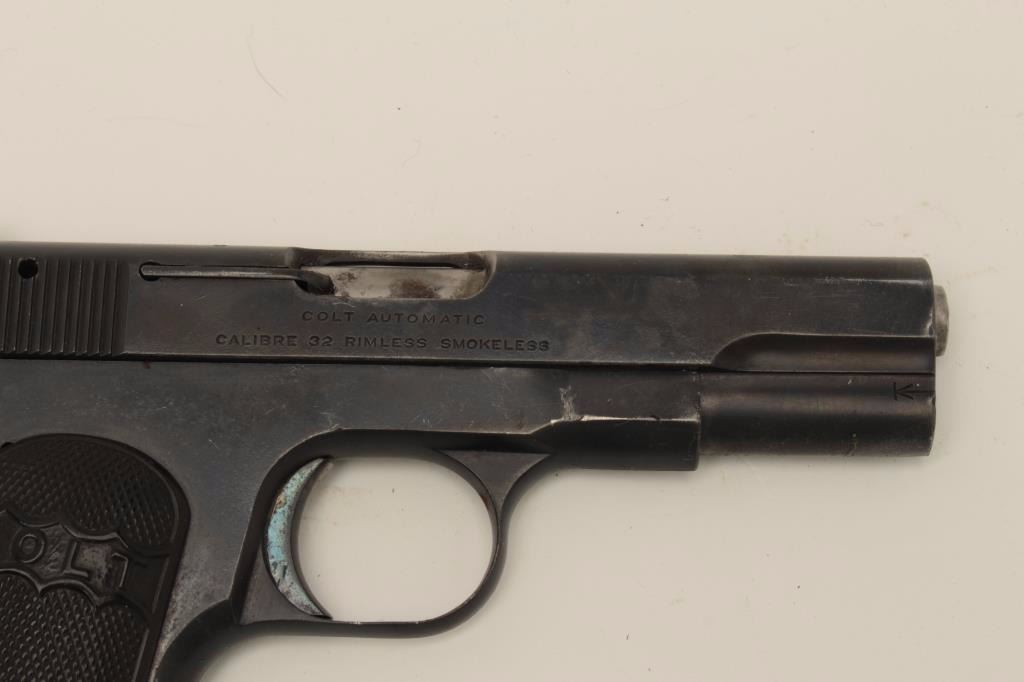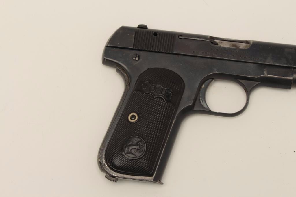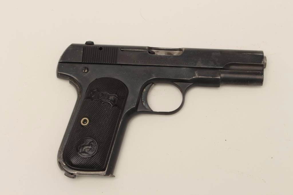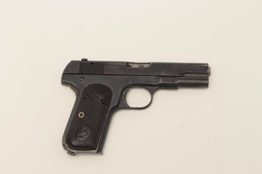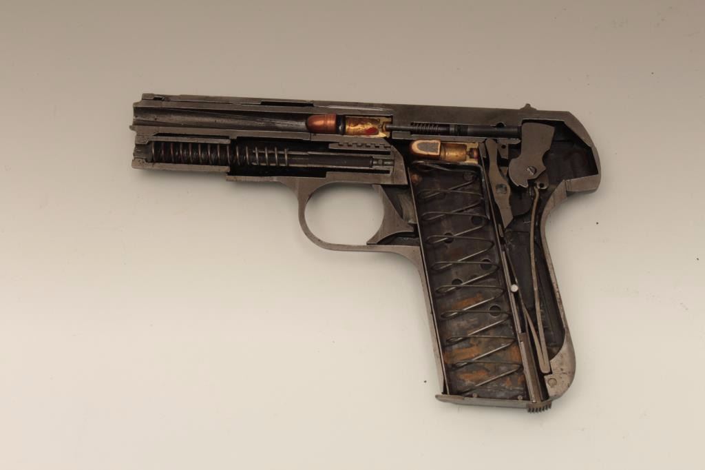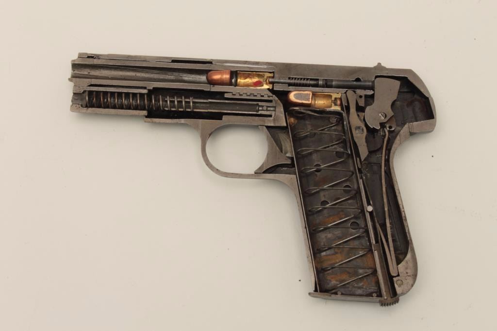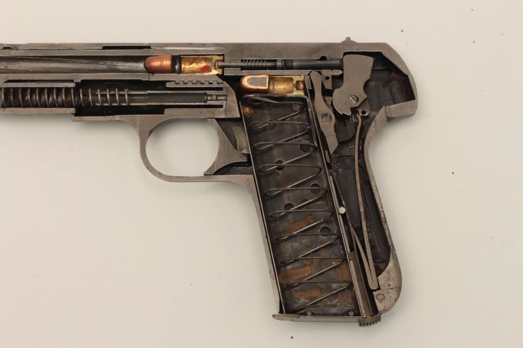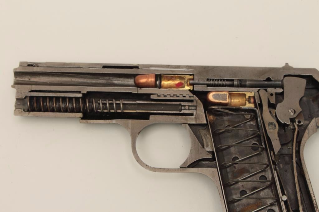Cutaway of a Colt Pocket Model semi-automatic pistol, no visible serial number; in protective plastic case; blued finish, checkered black hard rubber grips. Est.: $900-$1,800.
