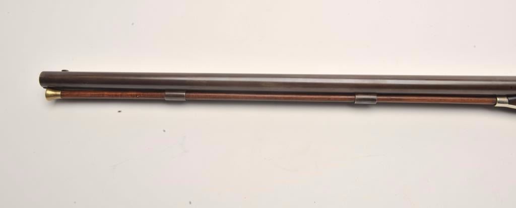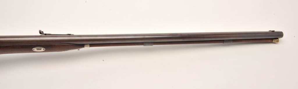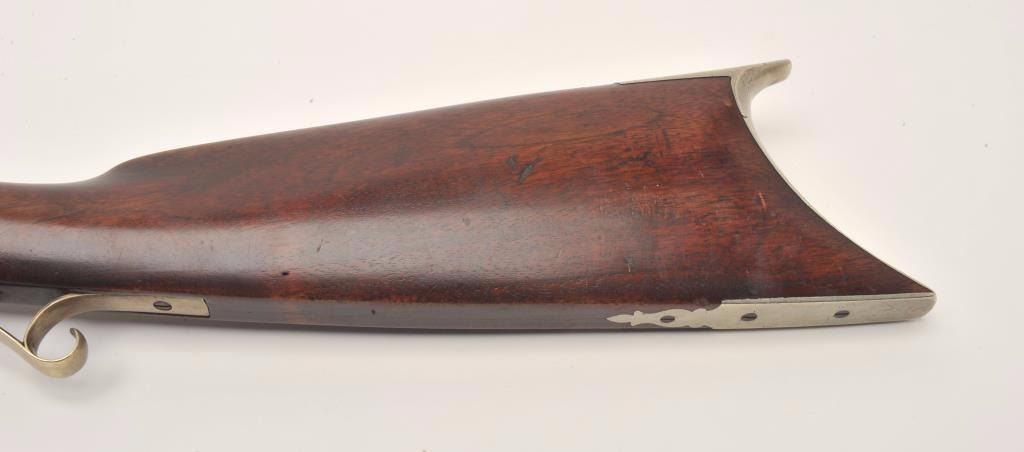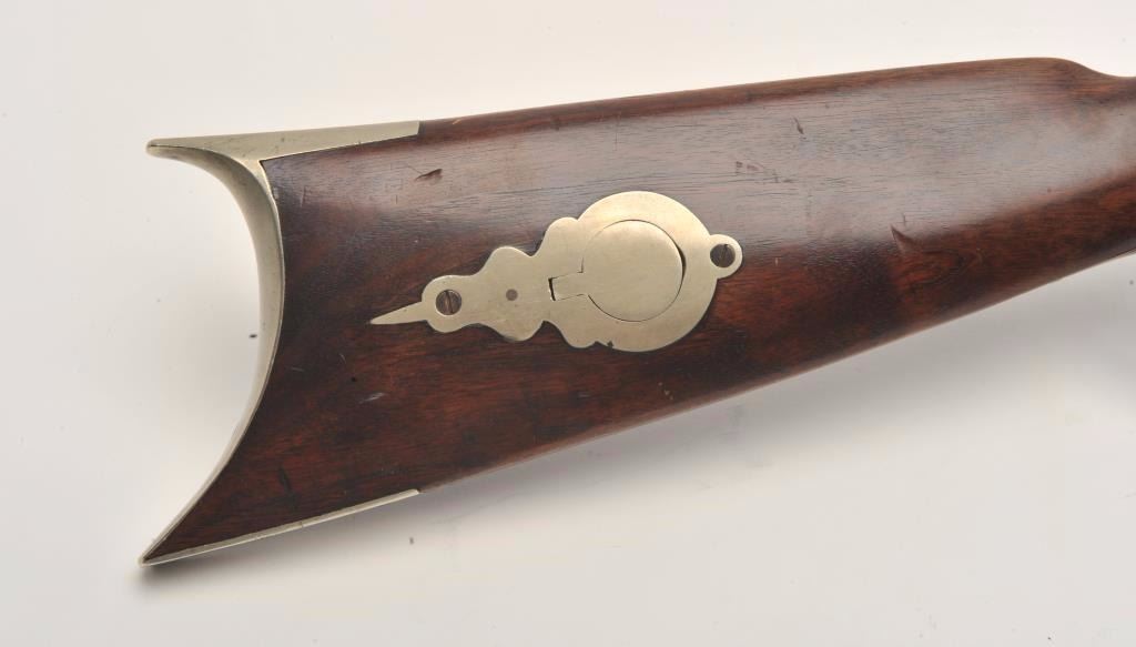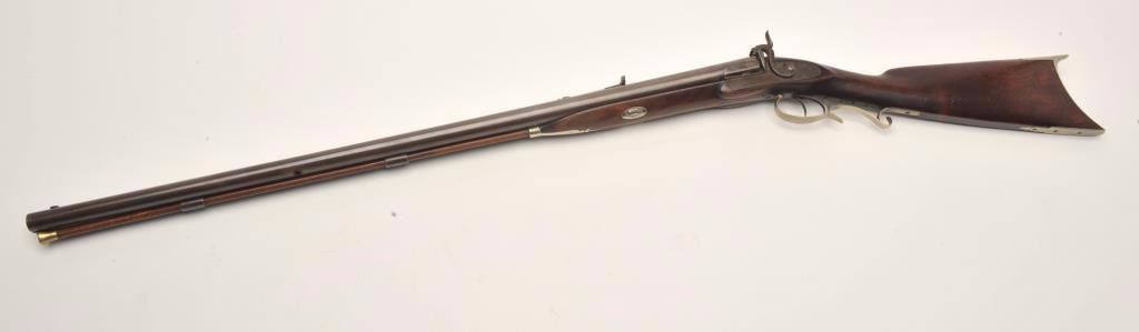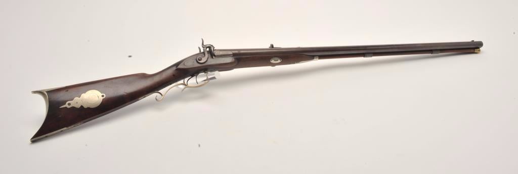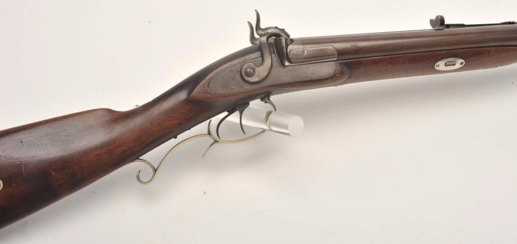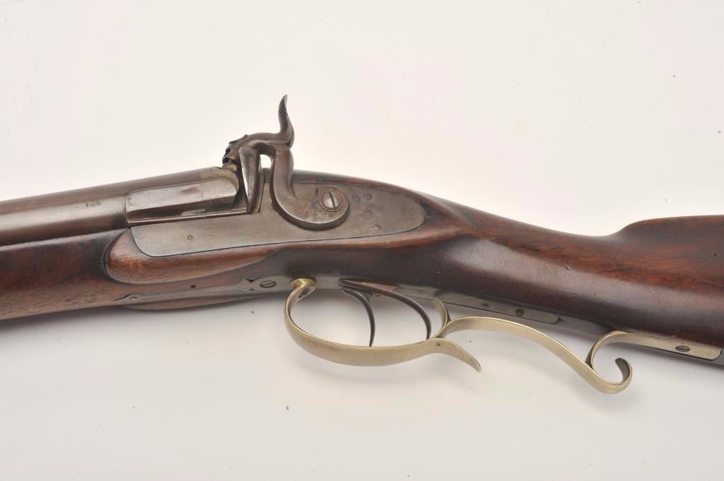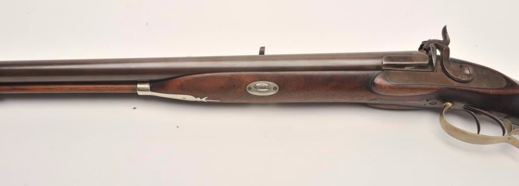 American percussion double rifle/shotgun SxS combination by J. Rogers, Elkhart, Ind., 12 gauge/.45 caliber, 33” barrels, wood stock with circular patchbox, German silvered brass mounts, brass tipped wood ramrod; in overall very good condition displaying tobacco brown finish, crisp actions, very good wood. (Antique). Est.: $1,400-$2,800.