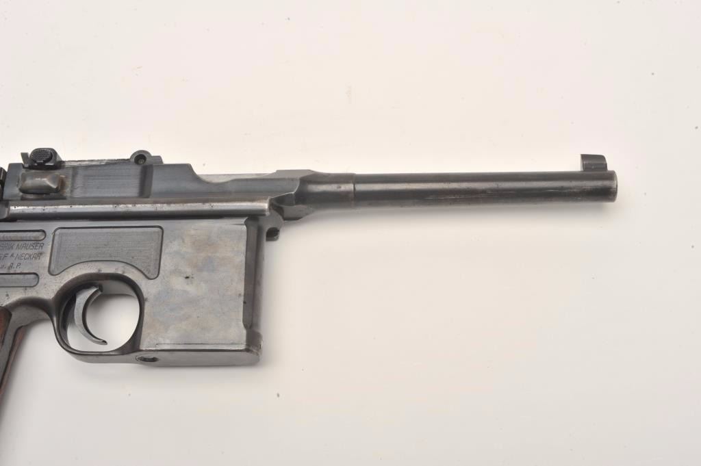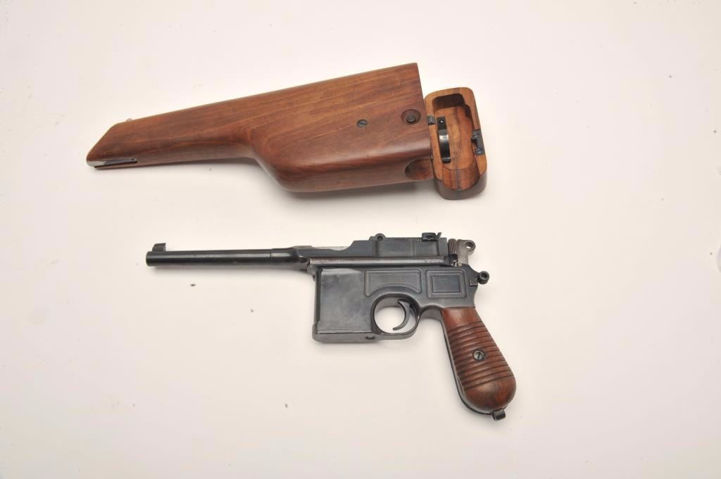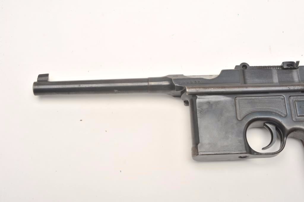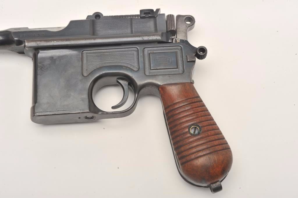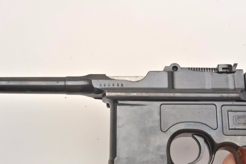 Mauser Broomhandle 1930 step barrel semi-automatic pistol with wood shoulder stock/holster, 7.65mm caliber, 5.5” barrel, blued finish, wood grips, S/N 890936, in overall very good to near fine conditionshowing the majority of its blued finish, near fine bore, crisp action and markings, very good + grips; stock is overall very good with stamped Mauser “banner”. (C&R/PPT). Est.: $1,400-$2,800.