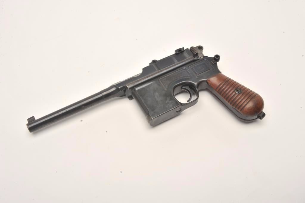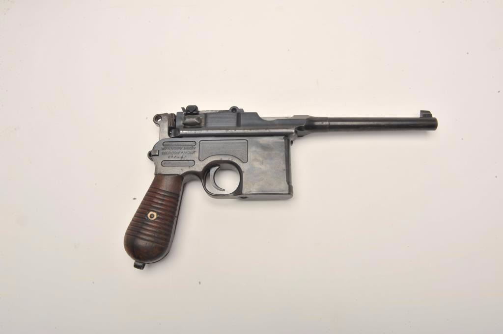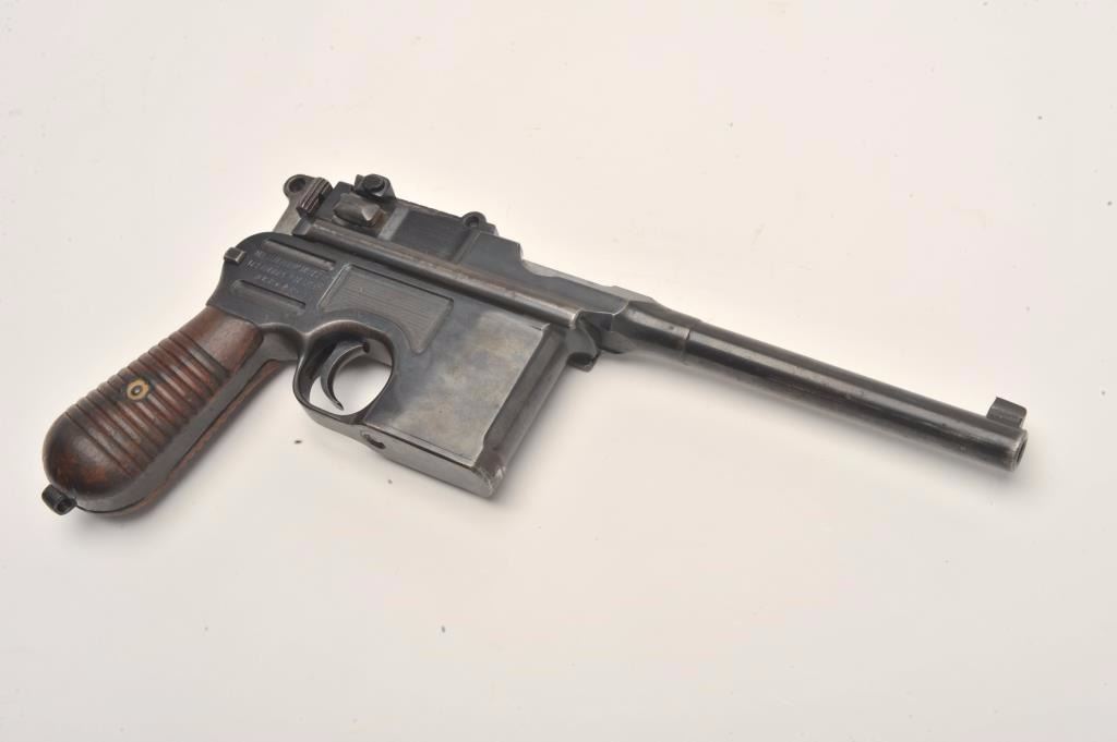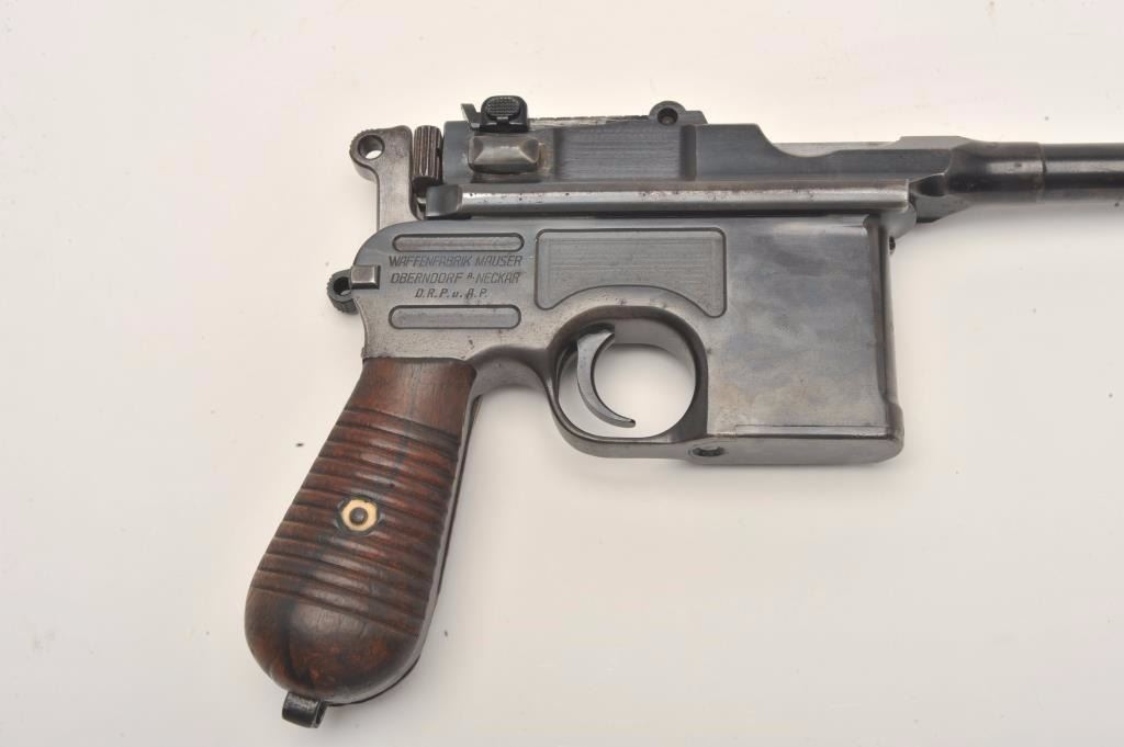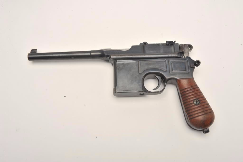 Mauser Broomhandle 1930 step barrel semi-automatic pistol with wood shoulder stock/holster, 7.65mm caliber, 5.5” barrel, blued finish, wood grips, S/N 890936, in overall very good to near fine conditionshowing the majority of its blued finish, near fine bore, crisp action and markings, very good + grips; stock is overall very good with stamped Mauser “banner”. (C&R/PPT). Est.: $1,400-$2,800.