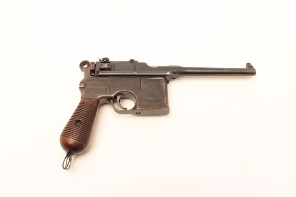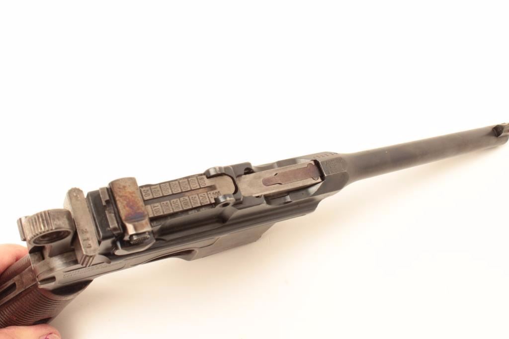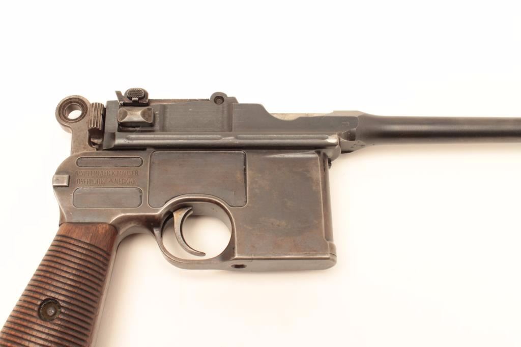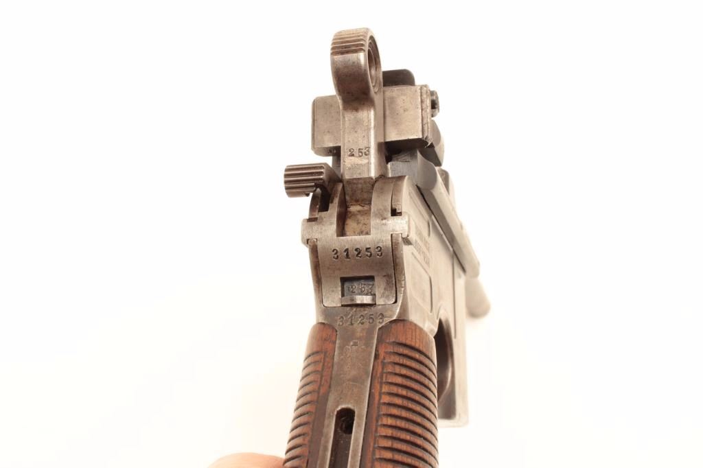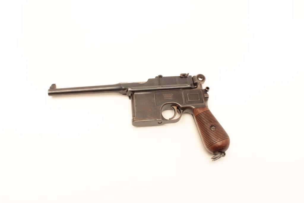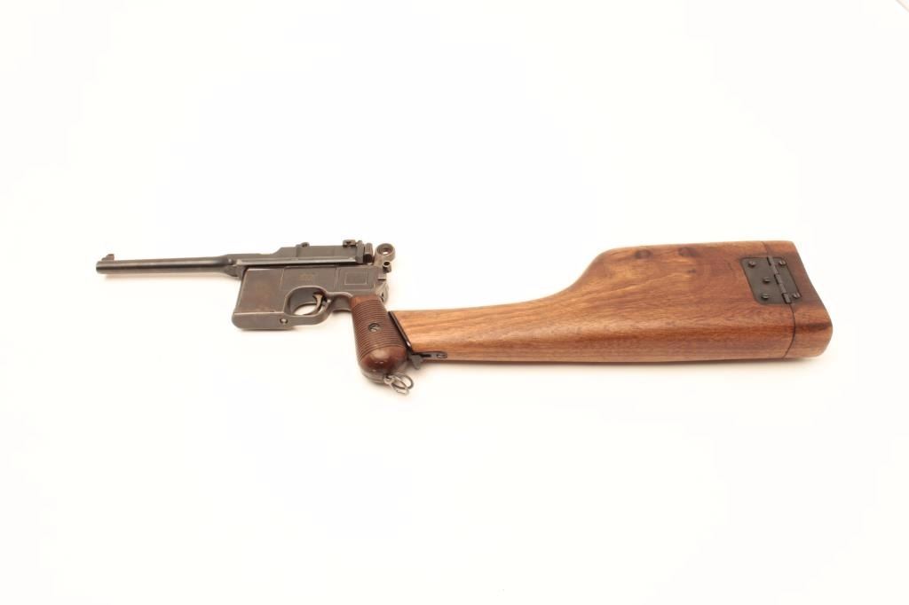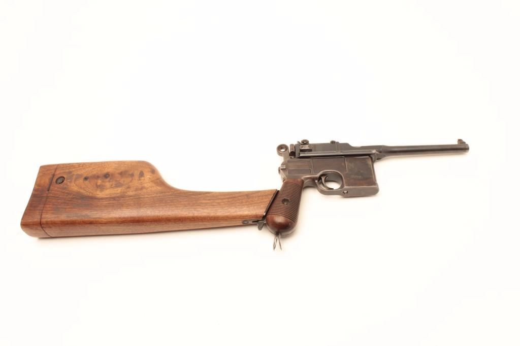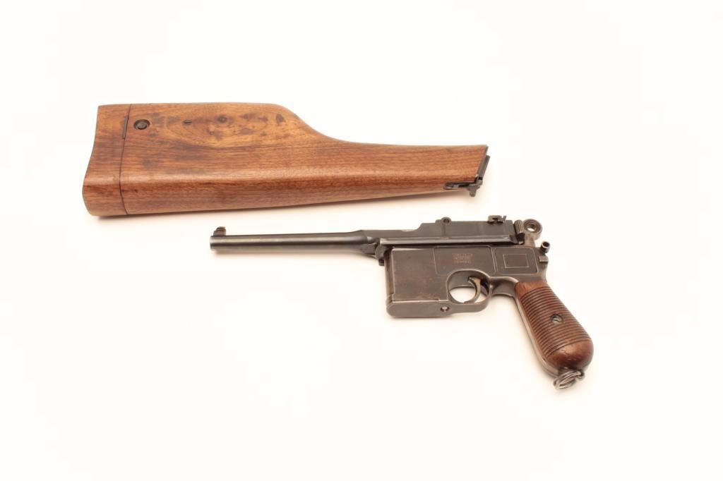 Lot 94 Mauser large ring broomhandle semi-automatic pistol with wooden stock/holster, 7.65mm caliber, 5.5