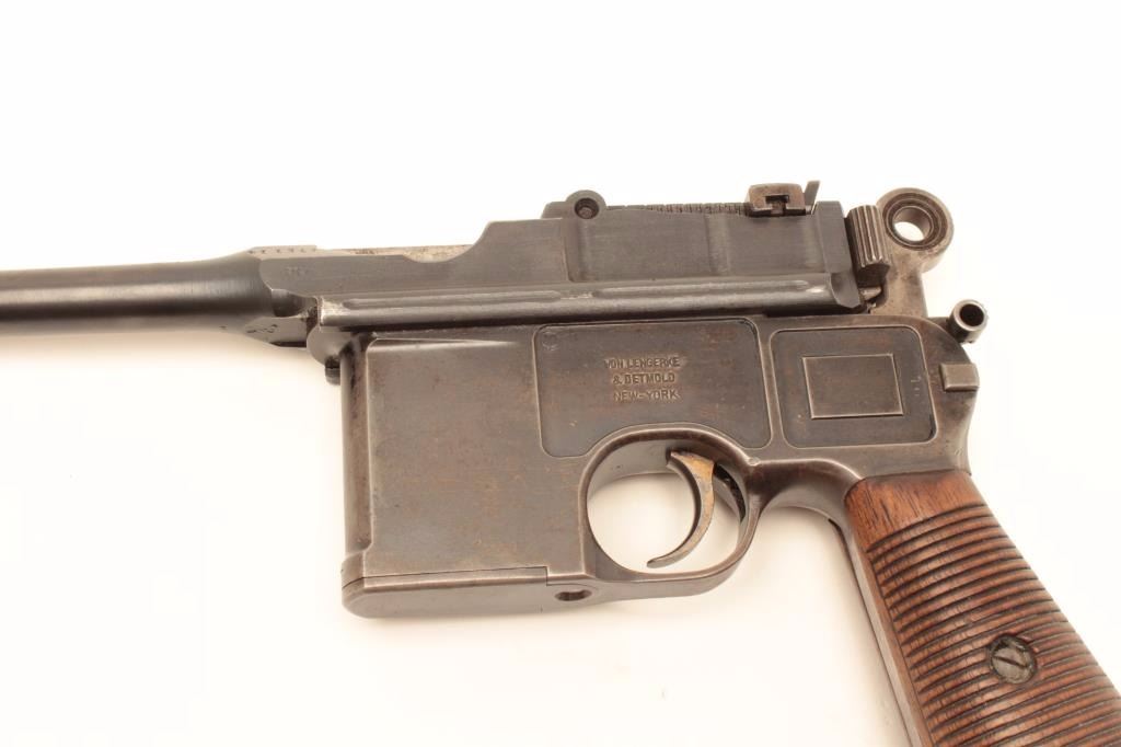 Mauser large ring broomhandle semi-automatic pistol with wooden stock/holster, 7.65mm caliber, 5.5” barrel, blued finish, wood grips, S/N 31253 (barrel #411219); in overall very good condition with considerableremaining blued finish, crisp action, near fine bore, crisp markings including agent’s stamp “VON LENGERKE & DETMOLD/NEW YORK” on left side of frame; good grips; stock is overall good (C&R/PPT). Est.:$1,400-$2,800.