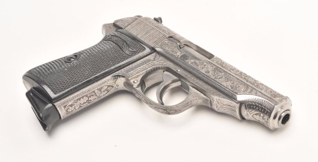 Factory engraved Walther Model PP semi-automatic pistol, nazi era, .32 caliber, presentation grade, S/N 215298P. This particular Walther was likely in the factory at the time of its capture by Allied forcesand was for many years in the world famous Rankin collection (author of several definitive books on German and particularly Walther semi-automatic pistols). The pistol is in the white, having never been finishedor proofed. It was likely awaiting presentation by the factory to a government official, as was generally the case with these high grade engraved pistols. Excellent unused, as found condition, one of only 3known in this unfinished and un-proofed state. (C&R/PPT). Est.: $2,000-$4,000.