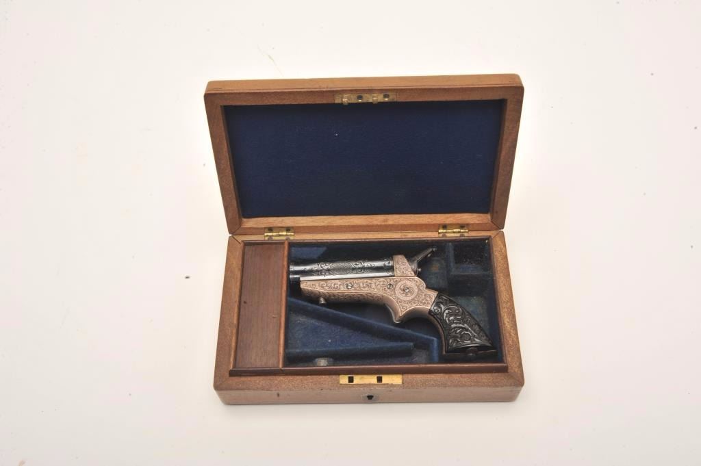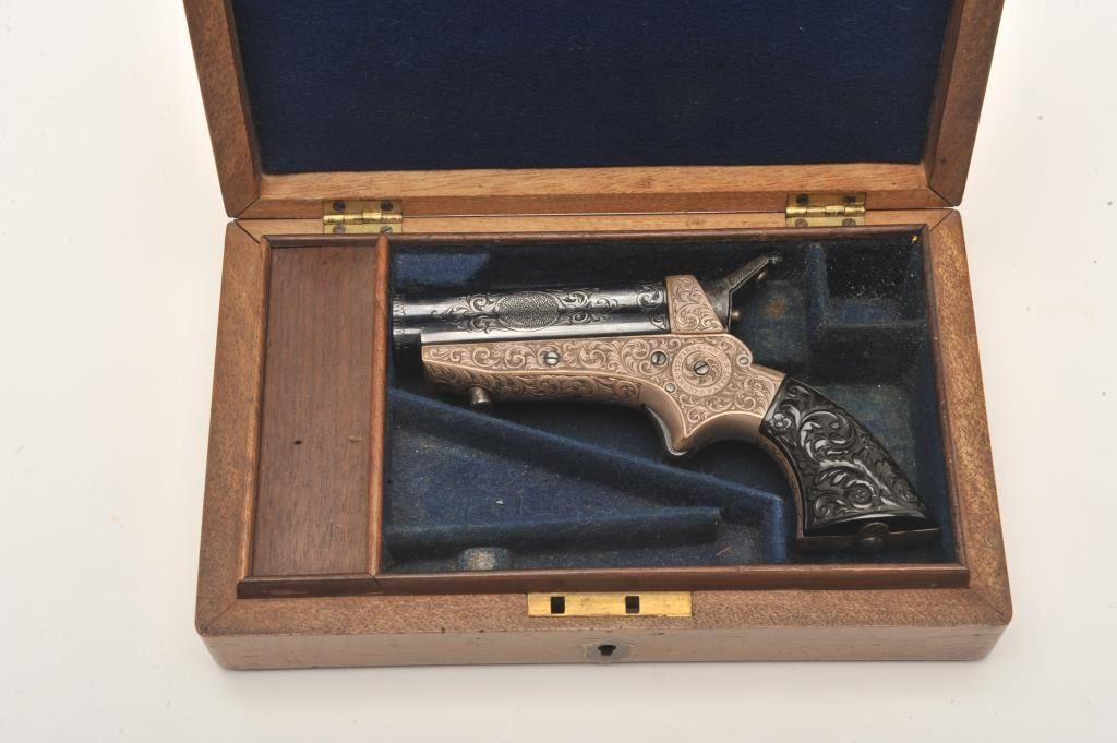 Tipping & Lawden Sharps four barrel derringer, finely and extensively scroll engraved, blued finish, deluxe floral relief hard rubber grips, no visible S/N, with fancy wooden presentation case. The gun is inoverall fine condition displaying the majority of its original blued finish on the barrel assembly, the brass frame retains some silver wash in protected areas, crisp action, sharp markings and fine grips. Thewood presentation case is also in overall fine condition. (Antique). Est.: $2,500-$5,000.