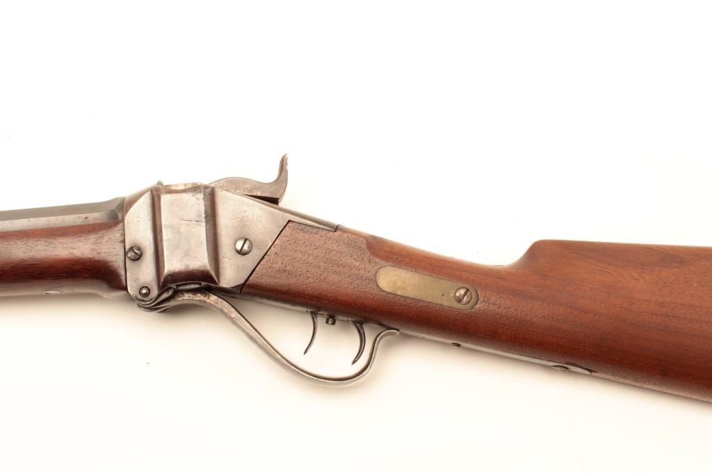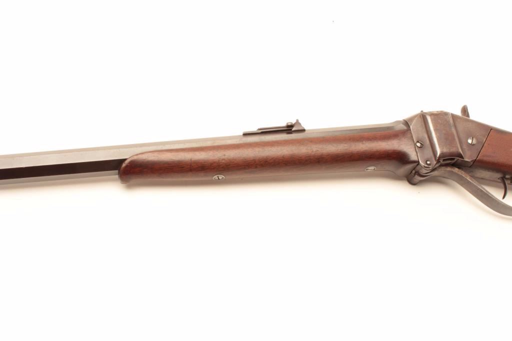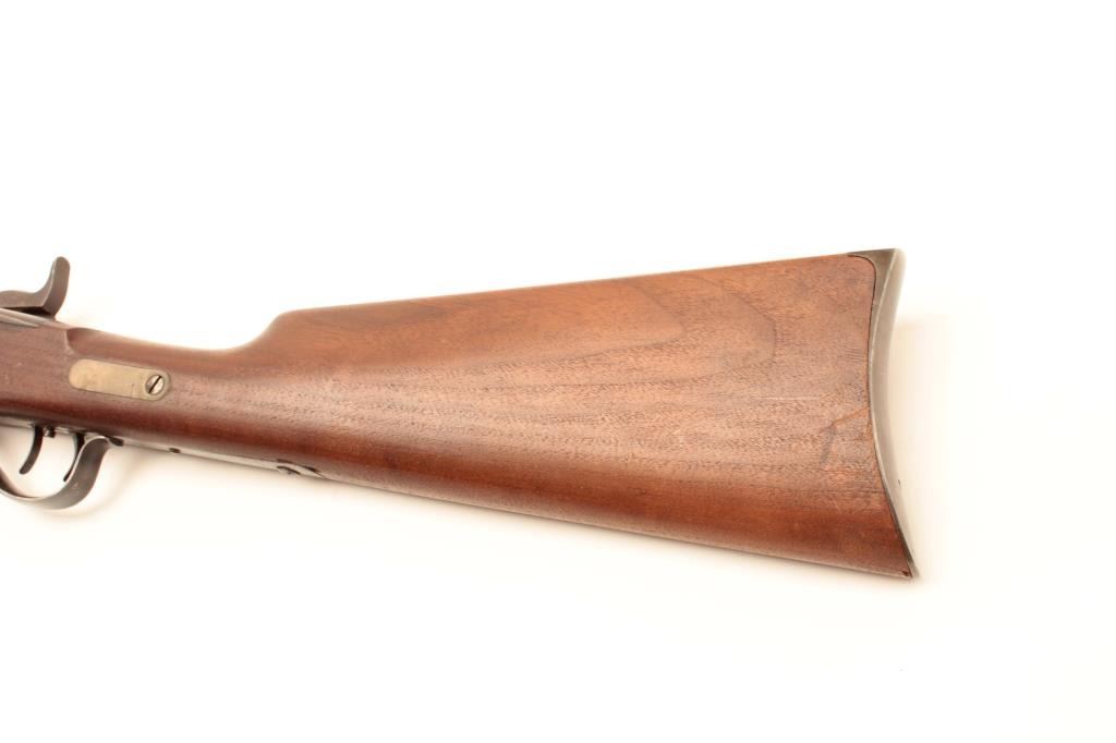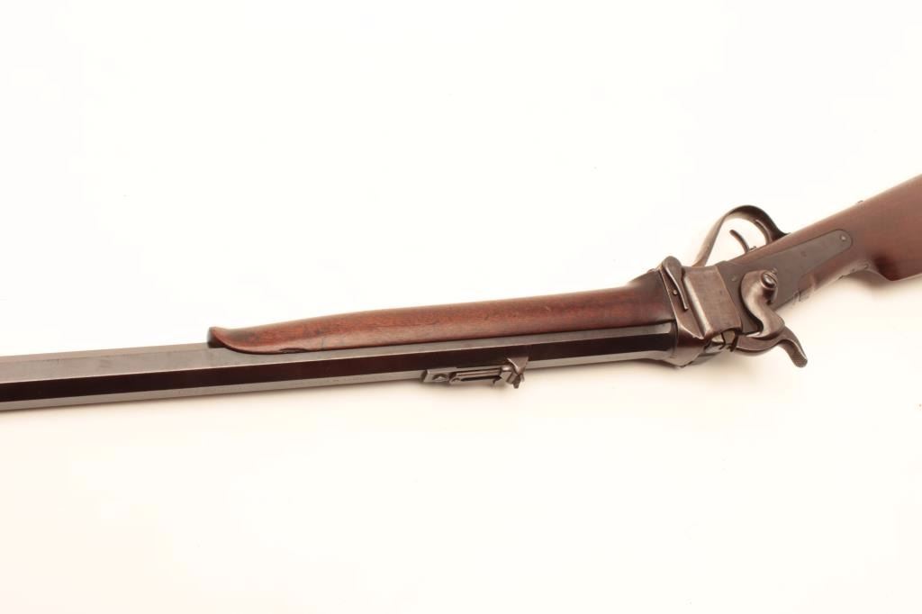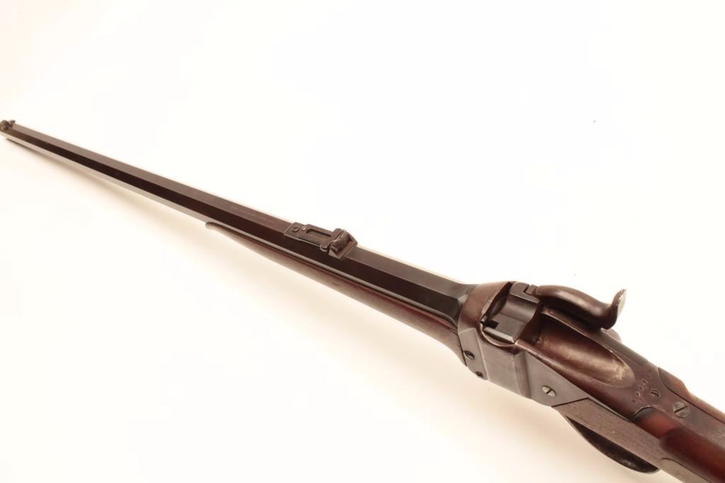 Sharps Meacham conversion of a carbine to rifle, .45 caliber, 30” octagon “Old Reliable” marked barrel, wood stocks, S/N 200069, in overall good condition with a mixture of muted blued finish on barrel withbalance gone to a pleasing brown patina; bore is overall good with some erosion at breech, good action, good to very good stocks. (Antique) Est.: $2,000-$4,000.