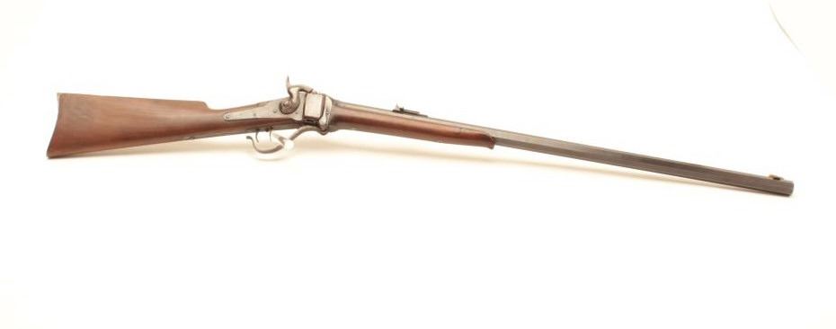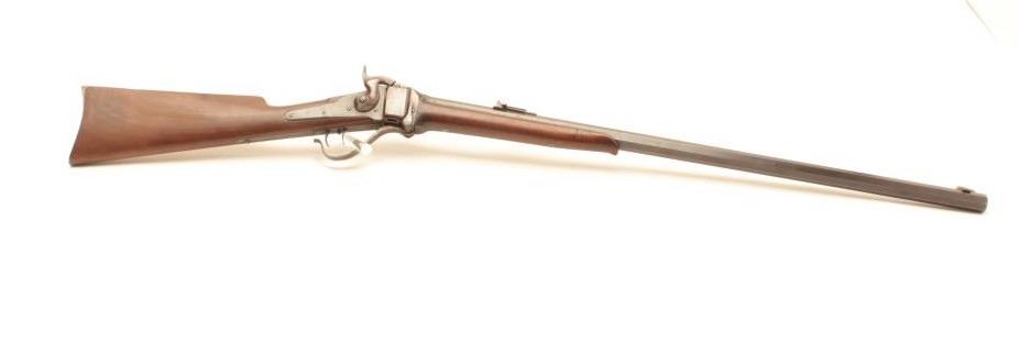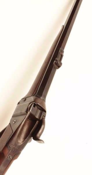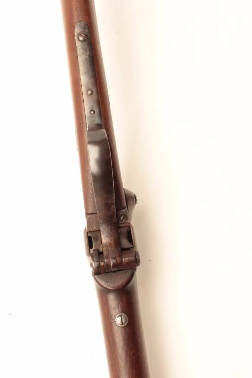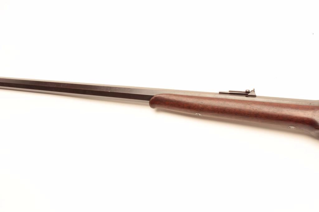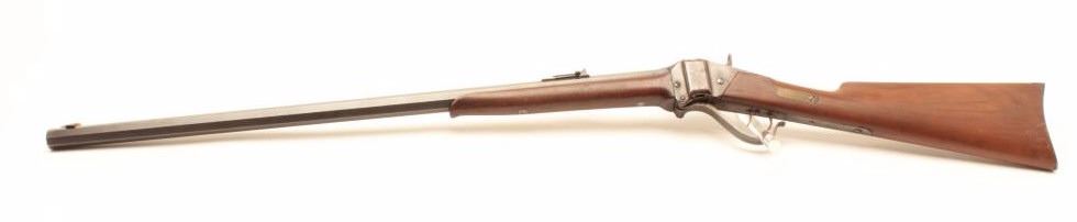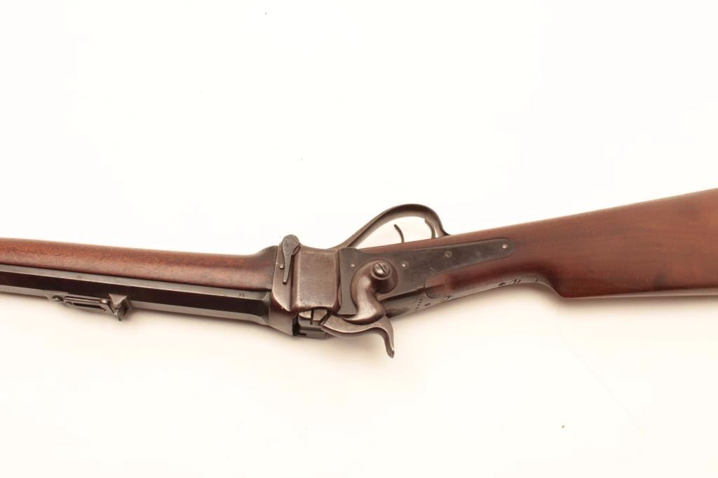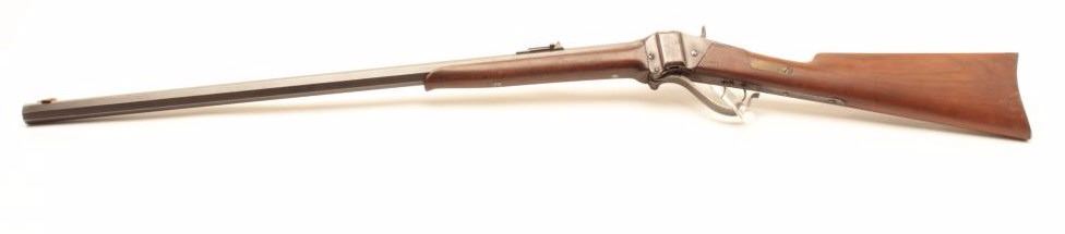 Sharps Meacham conversion of a carbine to rifle, .45 caliber, 30” octagon “Old Reliable” marked barrel, wood stocks, S/N 200069, in overall good condition with a mixture of muted blued finish on barrel withbalance gone to a pleasing brown patina; bore is overall good with some erosion at breech, good action, good to very good stocks. (Antique) Est.: $2,000-$4,000.