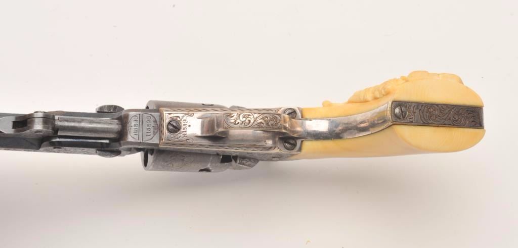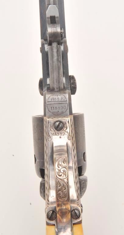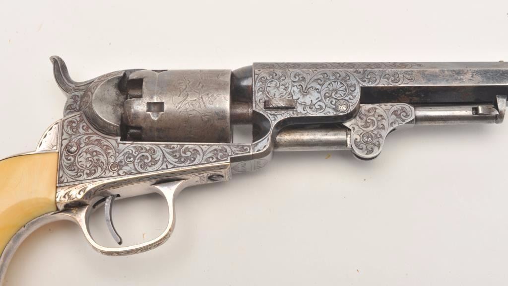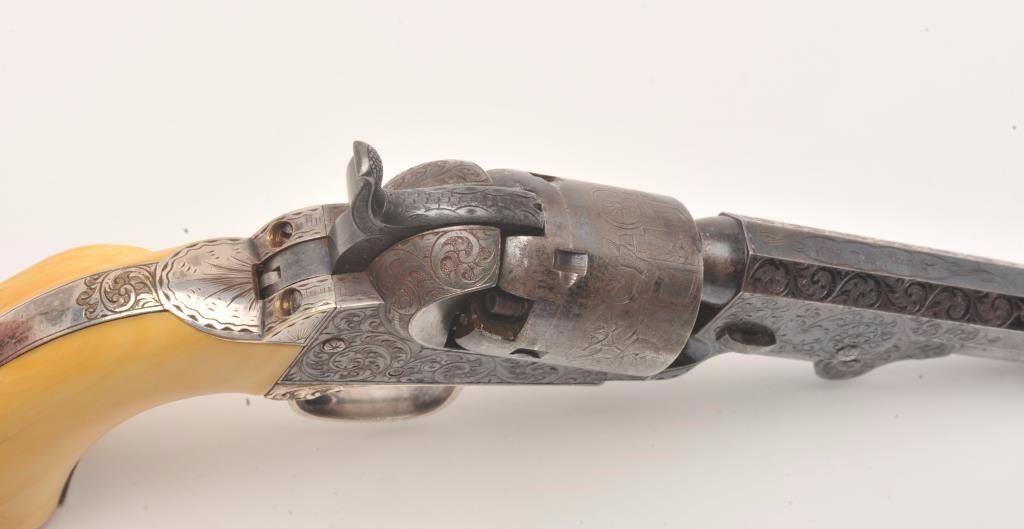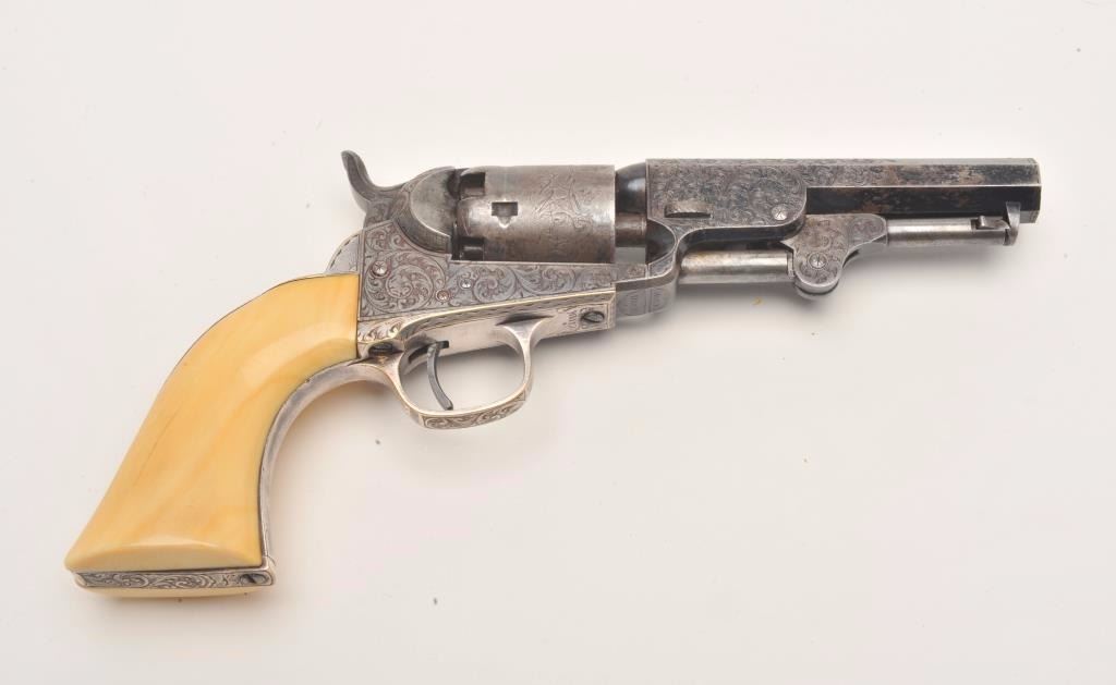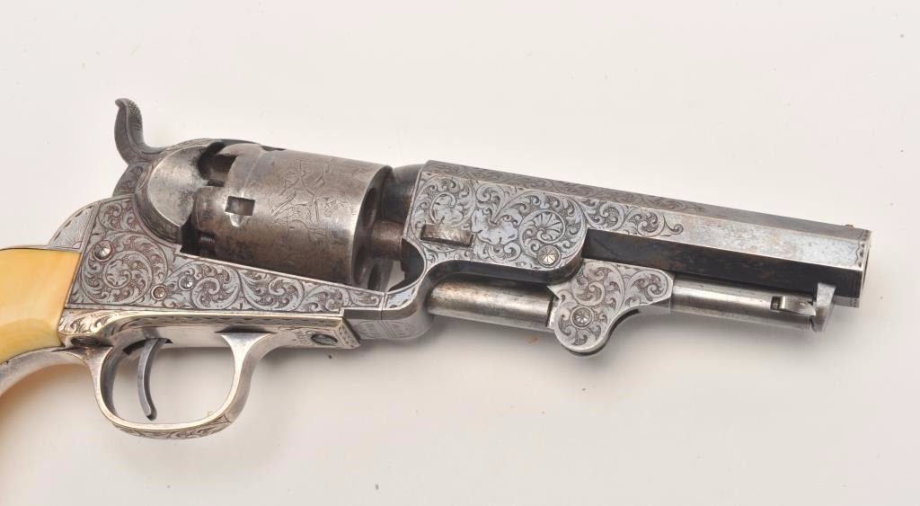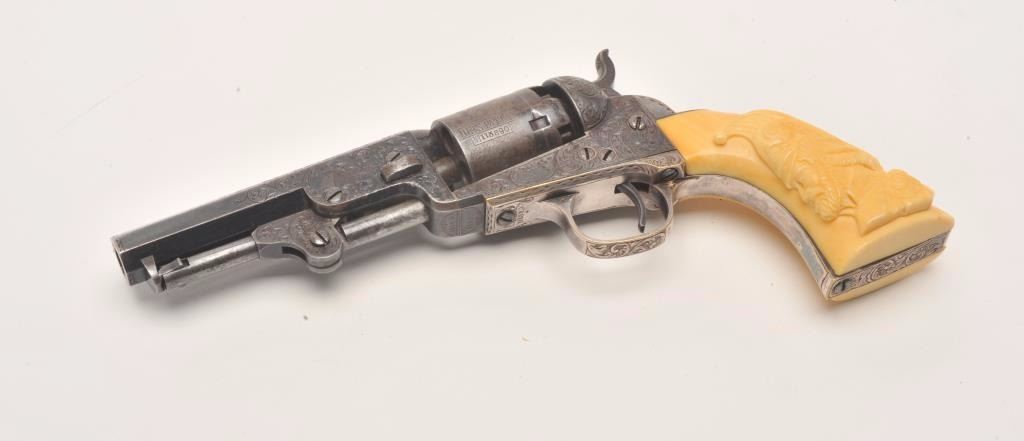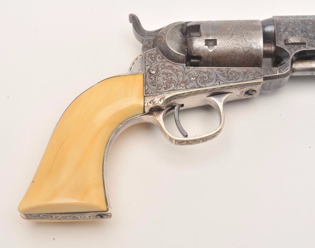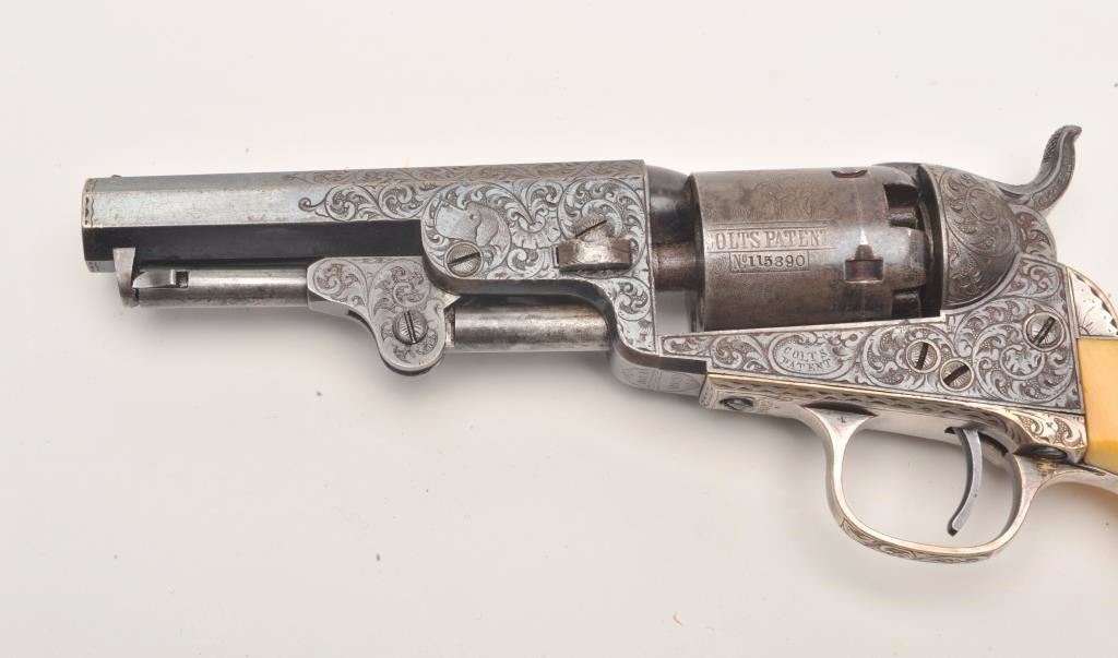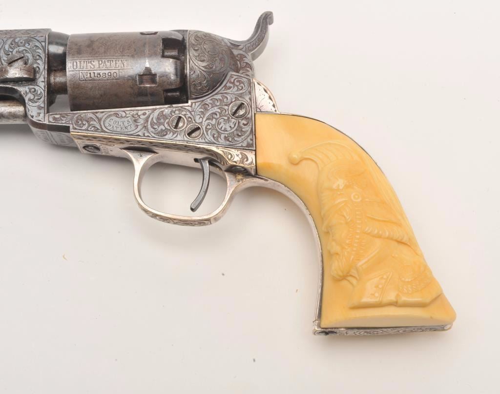 Beautifully and finely period scroll and vine engraved Colt Model 1849 Pocket percussion revolver, .31 caliber, 4” octagon barrel, blued finish, silver wash to trigger guard and backstrap, outstanding raised carvedivory grips with head of military soldier, S/N 115890, all matching visible numbers including wedge; this Colt is in overall very good to fine condition displaying a dog head panel scene on the left side of the barrelassembly, hand cut “Colts Patent” on left side of frame and hand cut “Sam’l Colt” barrel address, considerable original blue finish on the barrel assembly with the majority of original cylinder sceneremaining; majority of silver wash remaining on straps, crisp action, sharp markings and engraving, very good bore and finely executed raised carved ivory grips. (Antique). Est.: $12,500-$25,000.