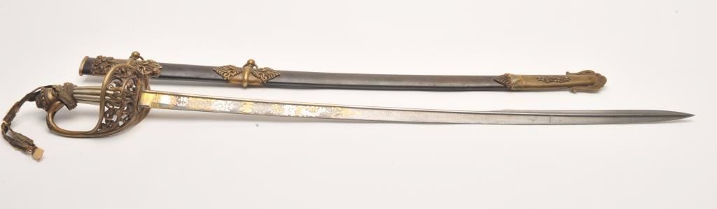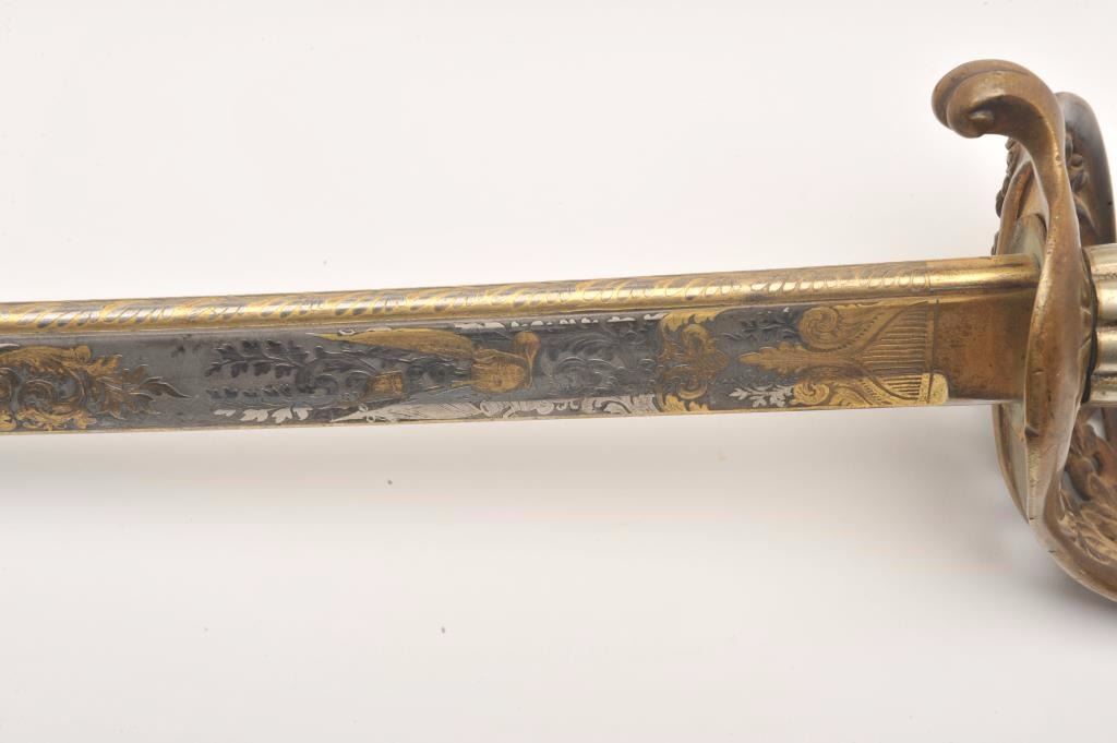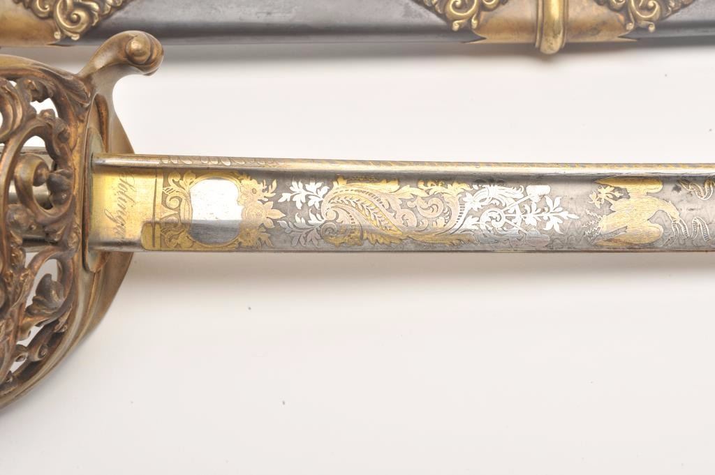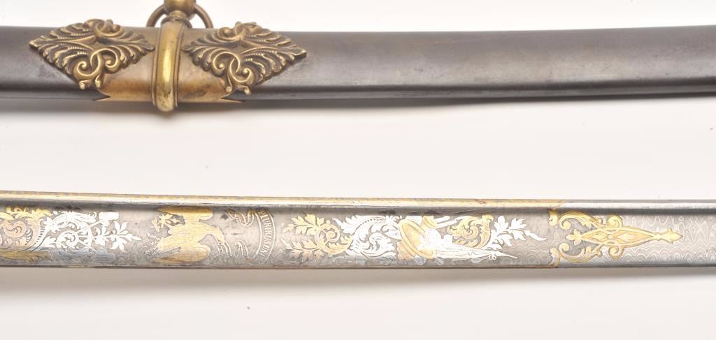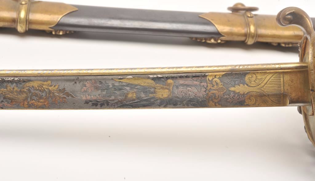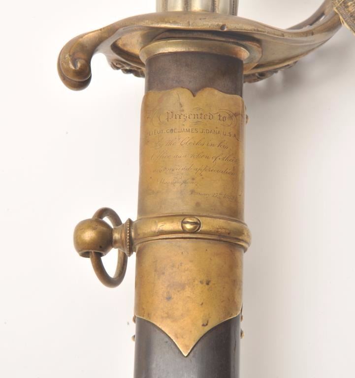Presentation Civil War sword and scabbard inscribed on left side brass mount at throat “Presented to/Lieut. Col. James J. Dana, U.S.A./by the Clerks in his/Office as a token of their/esteem &appreciation/Washington/Jan. 17th, 1863”; beautifully etched and gold washed blade marked “Solingen”, damascene pattern on blade front above etching, fancy brass “US” guard, partial woven sword knot remaining, brassmounts to metal scabbard with pleasing patina. Definitely a high grade sword with fancy grip and pommel; blade is near fine with considerable gold wash and original polish remaining in the etched areas. Should be further researched as to the history of this Union Officer. Est.: $9,000-$18,000.