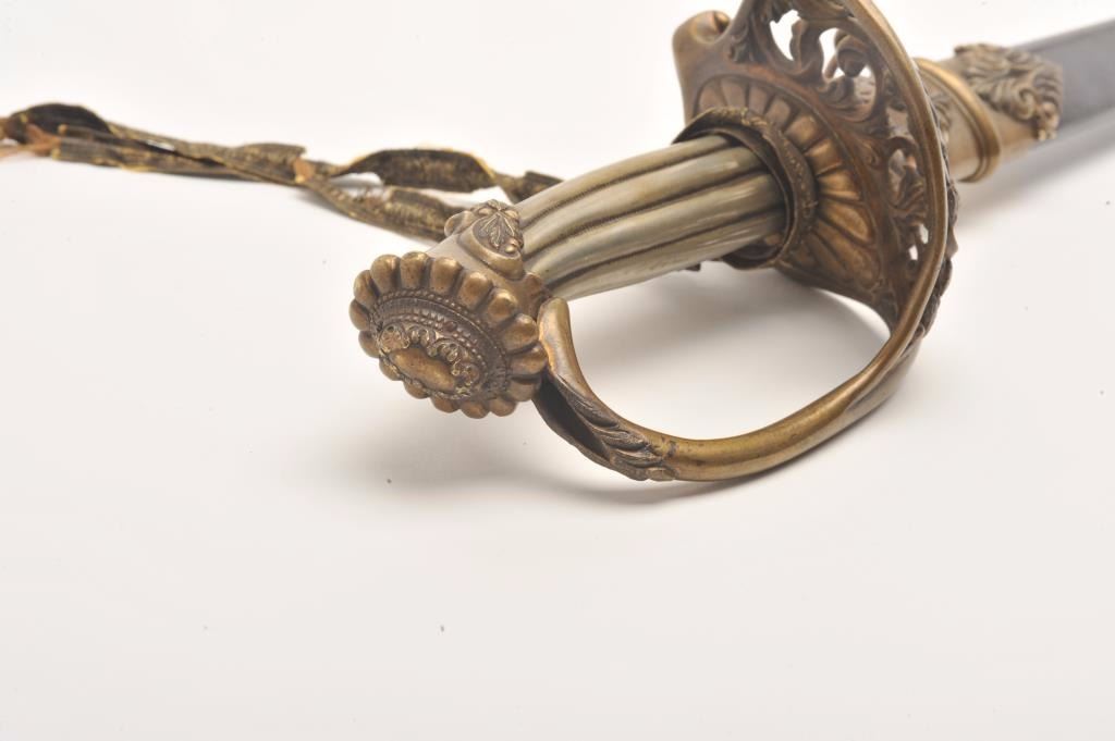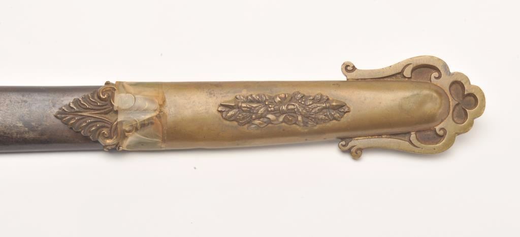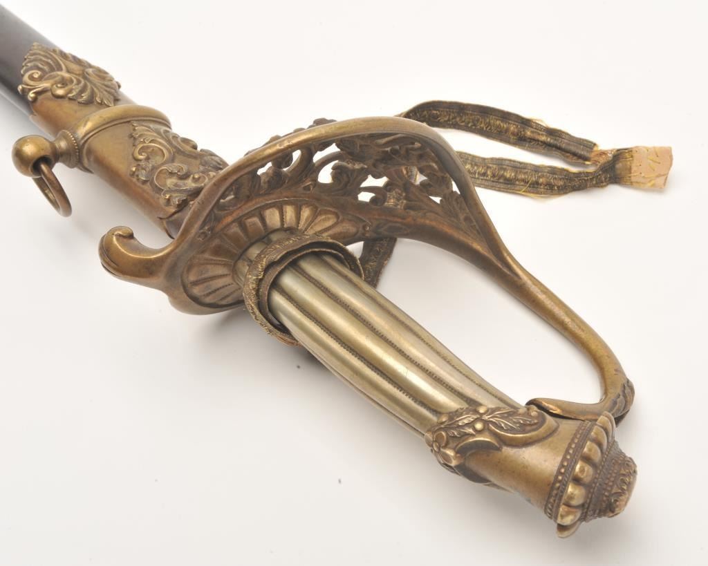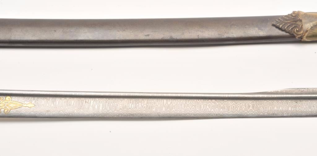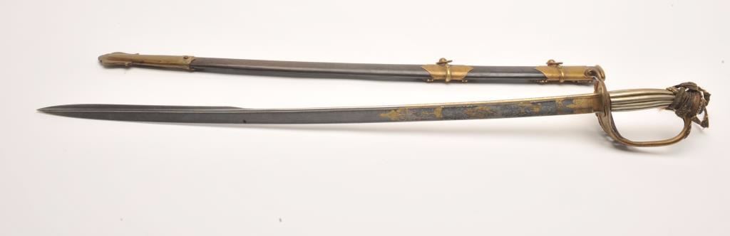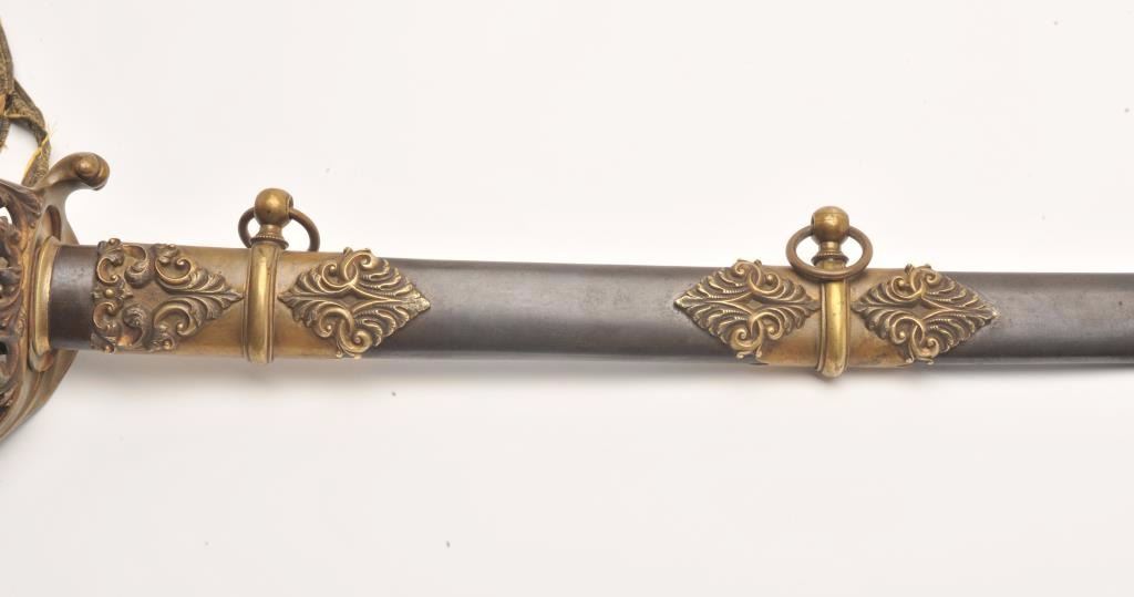 Presentation Civil War sword and scabbard inscribed on left side brass mount at throat “Presented to/Lieut. Col. James J. Dana, U.S.A./by the Clerks in his/Office as a token of their/esteem &appreciation/Washington/Jan. 17th, 1863”; beautifully etched and gold washed blade marked “Solingen”, damascene pattern on blade front above etching, fancy brass “US” guard, partial woven sword knot remaining, brassmounts to metal scabbard with pleasing patina. Definitely a high grade sword with fancy grip and pommel; blade is near fine with considerable gold wash and original polish remaining in the etched areas. Should be further researched as to the history of this Union Officer. Est.: $9,000-$18,000.