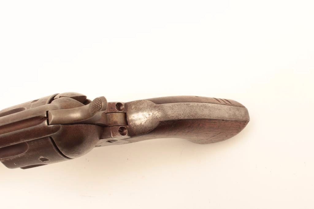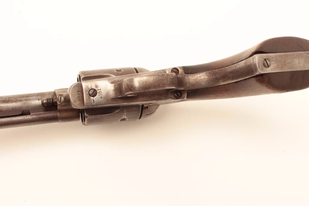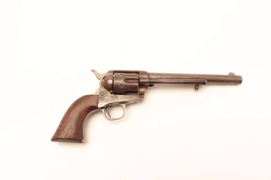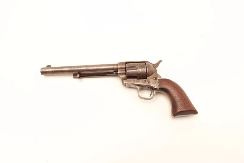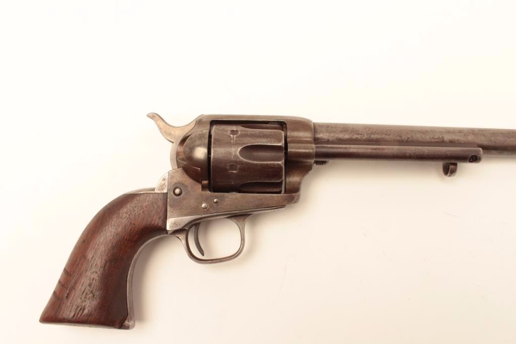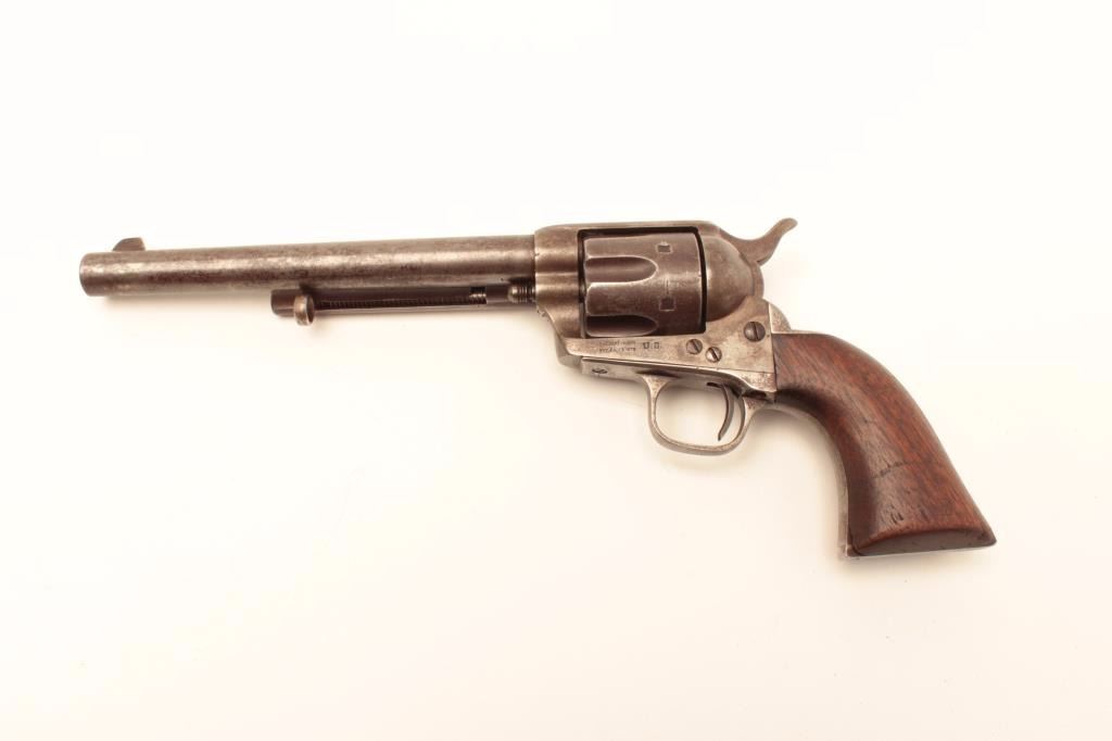 Colt SAA U.S. Ainsworth-inspected Cavalry Model revolver, .45 caliber, 7.5” barrel, grey/brown patina with scattered areas of pinprick pitting, wood grips, S/N 8551, all matching visible #s; italicized barreladdress. This desirable martial gun is in overall good condition with a good bore, crisp action, good markings and overall good grips showing traces of an inspector’s cartouche on the left side of the grips and 3 old hash marks on the back of the right grip. Est.: $5,000-$10,000. (Antique).
