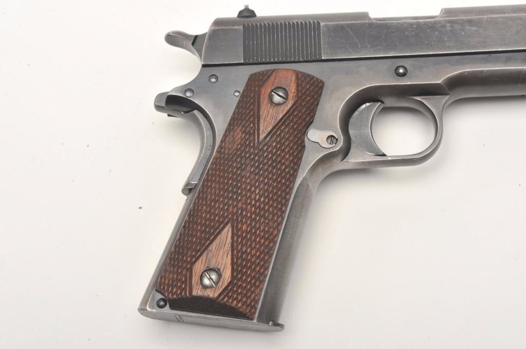 Extremely rare and desirable North American Arms Co. Model 1911 semi-automatic pistol, .45 caliber, 5” barrel, blued finish, checkered wood grips, two-tone magazine, S/N 22, in overall fine condition displayingconsiderable blue finish with some areas of flaking and with balance gone to a pleasing brown patina; fine bore, crisp action, sharp markings and visible S/N “22” marked on back left side of slide and on left rear side oftrigger. Per Standard Catalog of Military Firearms, North American Arms Co. (of Canada) made 1911’s for the U.S. but none were delivered to the Army. Less than 100 pistols are believed to have been assembled fromparts; rarely seen and few sold publically. A key piece for the serious military pistol collector! (C&R/PPT). Est.: $20,000-$40,000.