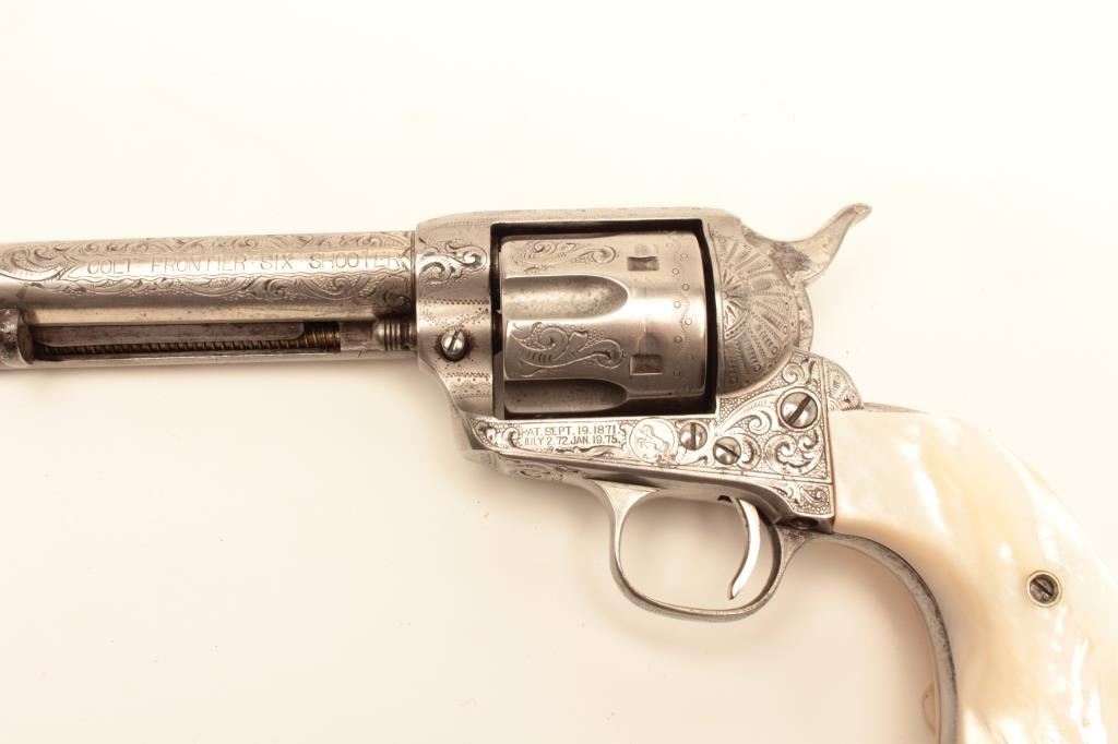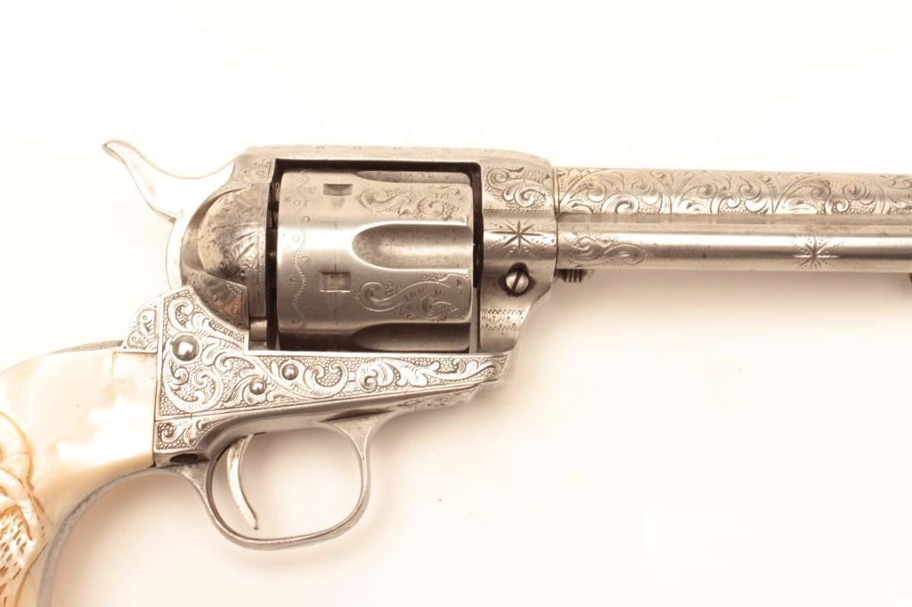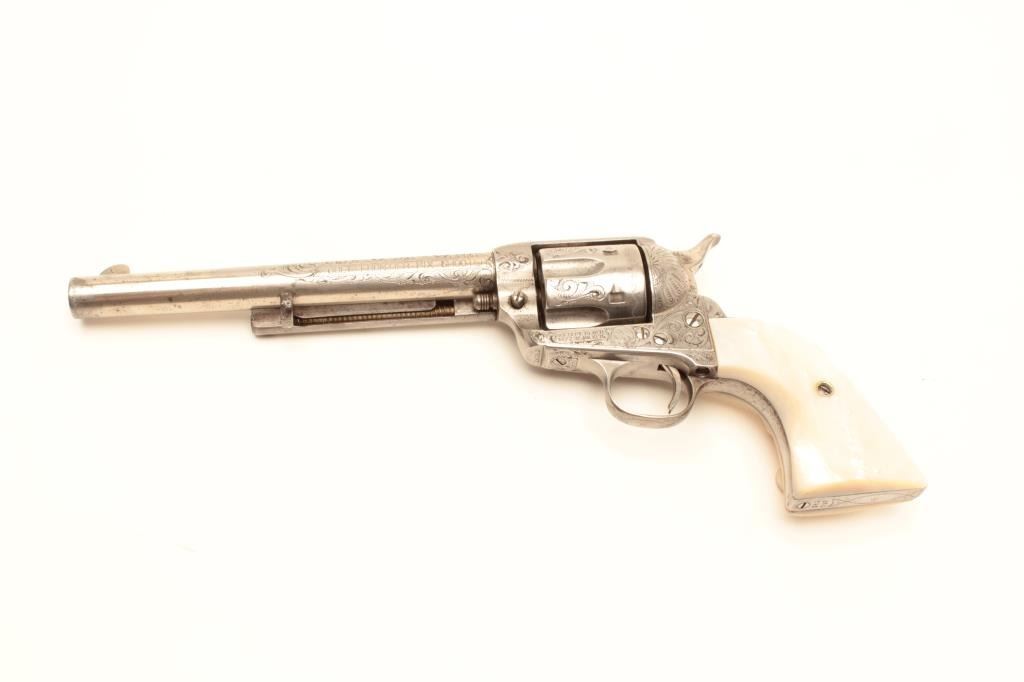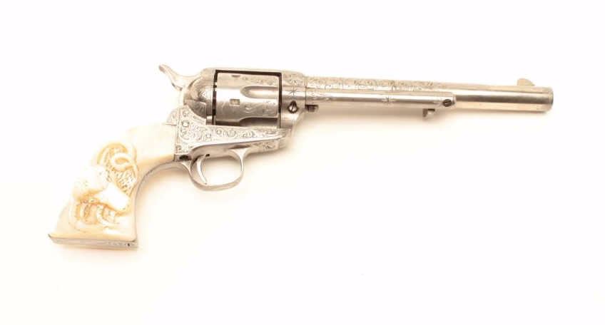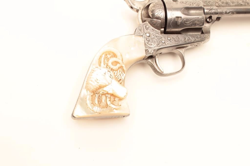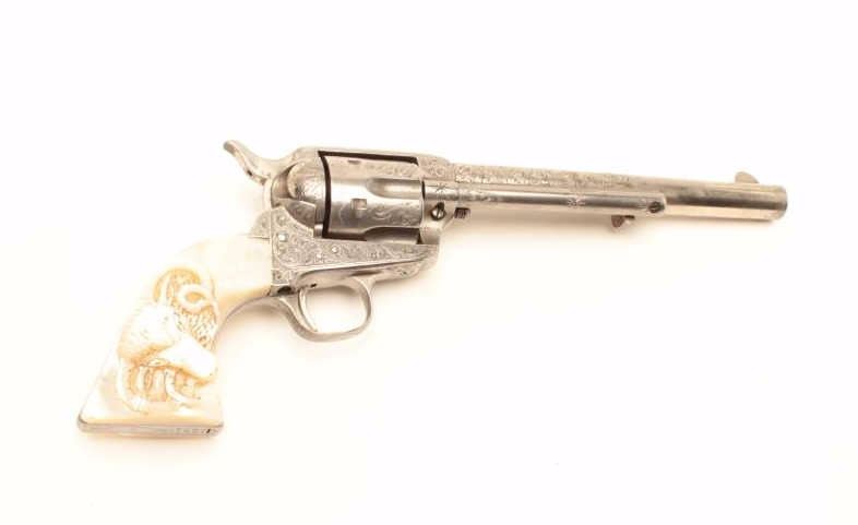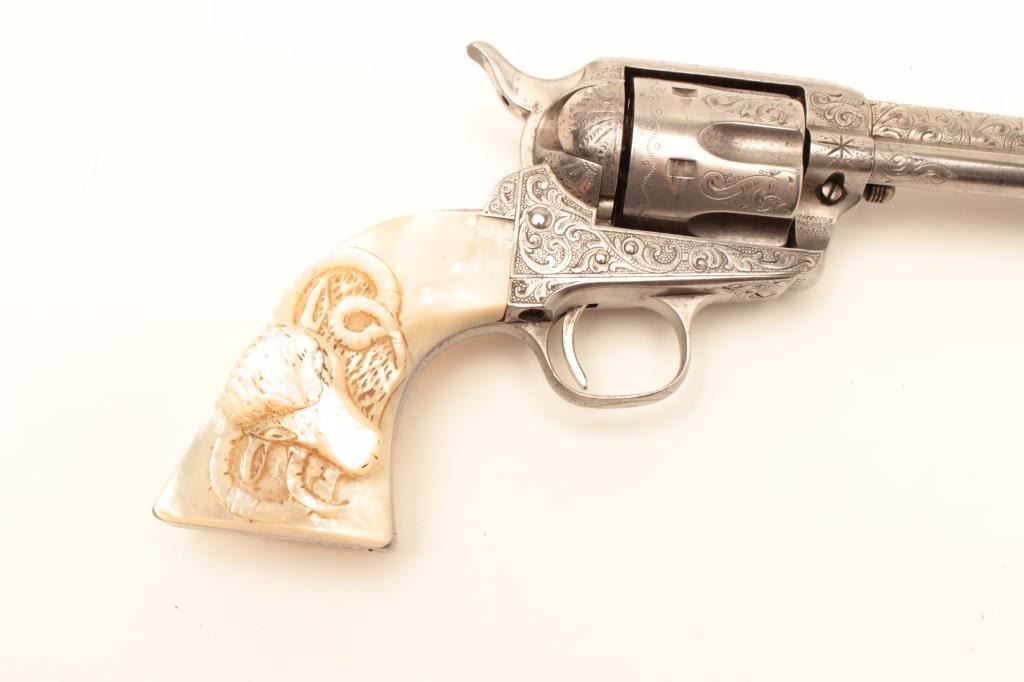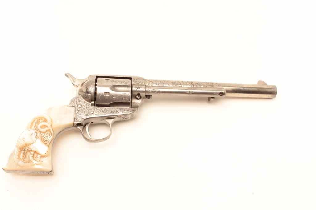 Colt Single Action Army revolver, .44-40 caliber, 7 ½” barrel, factory engraved, nickel finish, authentic to the period raised carved pearl grips in form of rams head, S/N 262020. The engraving is deluxe and probably by Master Colt engraver Cuno Helfrict. Factory letter confirms features and factory engraving and lists stocks as pearl. Shipped to Simmons Hardware Co, C/O Shelton Payne Arms Co, Jan 19, 1905 with 1 gun in shipment(Probably a special order). Shelton Payne Arms co. was located in El Paso, Texas and received many arms for Pancho Villa and his lieutenants during the border war era. This Colt remains in very good condition with30%-50% plus original nickel within a natural patina. The grips are exceptional and finely detailed with only a few other known showing ram of which several documented to the elder chiefs of Navajo nation. (C&R/No PPT) Est.:$35,000-$70,000
