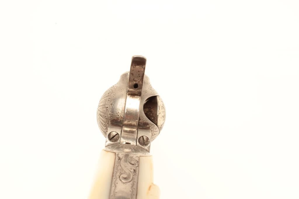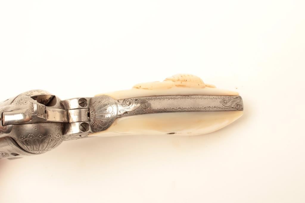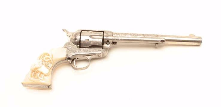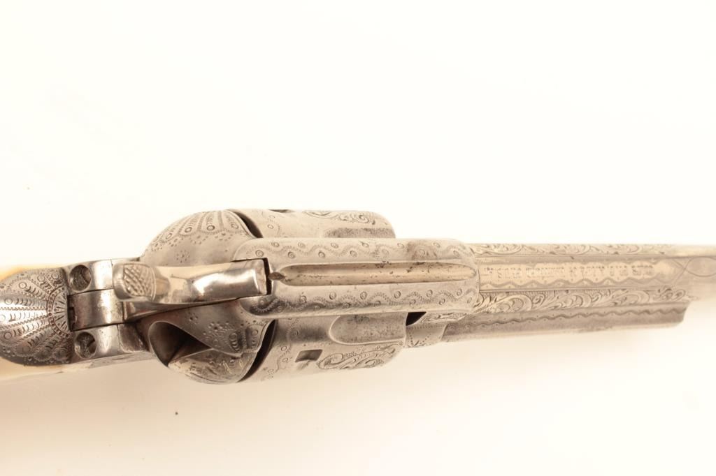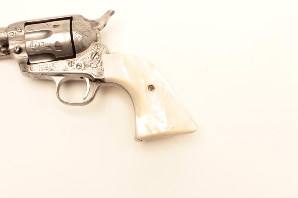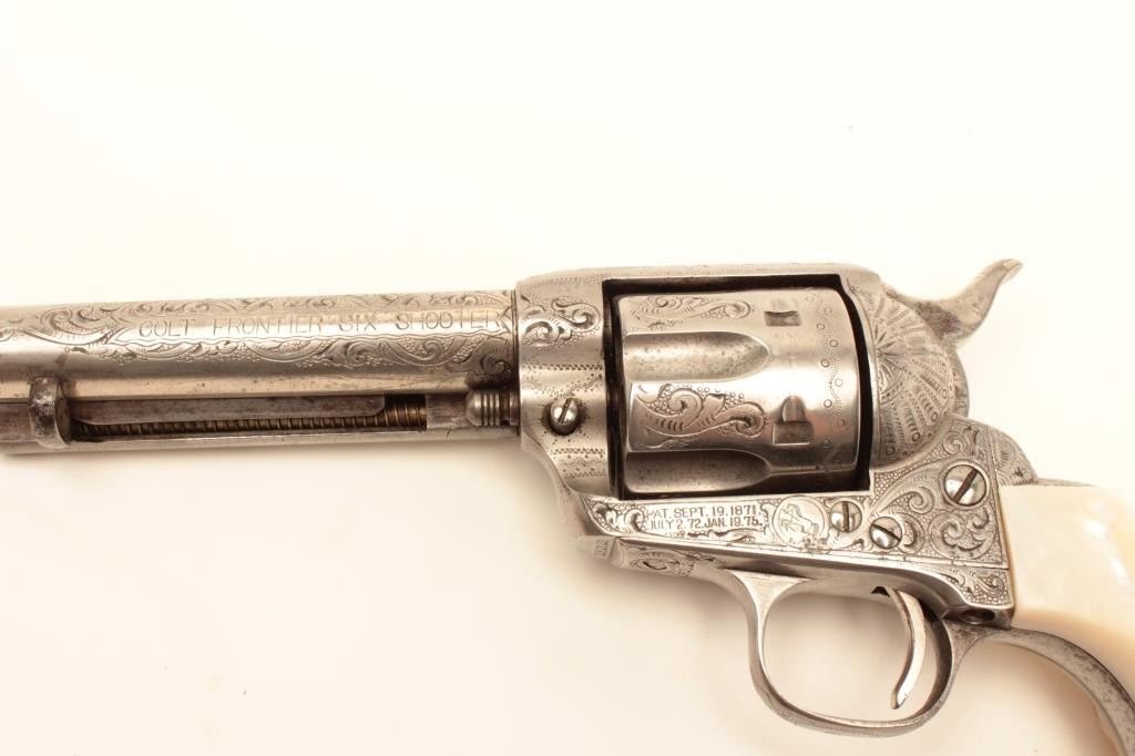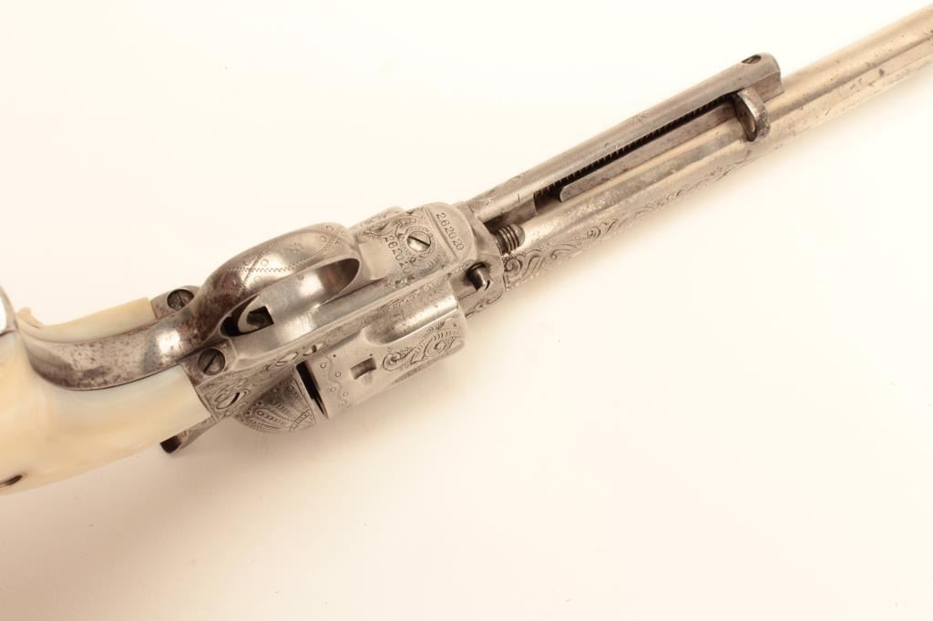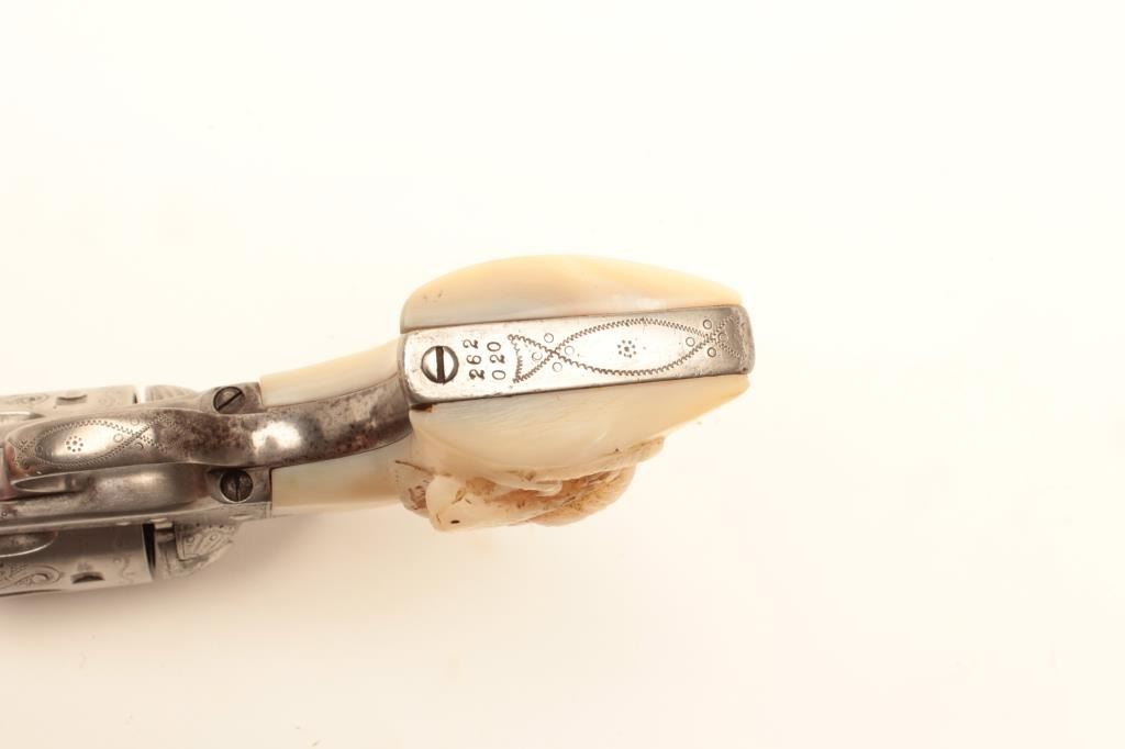 Colt Single Action Army revolver, .44-40 caliber, 7 ½” barrel, factory engraved, nickel finish, authentic to the period raised carved pearl grips in form of rams head, S/N 262020. The engraving is deluxe and probably by Master Colt engraver Cuno Helfrict. Factory letter confirms features and factory engraving and lists stocks as pearl. Shipped to Simmons Hardware Co, C/O Shelton Payne Arms Co, Jan 19, 1905 with 1 gun in shipment(Probably a special order). Shelton Payne Arms co. was located in El Paso, Texas and received many arms for Pancho Villa and his lieutenants during the border war era. This Colt remains in very good condition with30%-50% plus original nickel within a natural patina. The grips are exceptional and finely detailed with only a few other known showing ram of which several documented to the elder chiefs of Navajo nation. (C&R/No PPT) Est.:$35,000-$70,000