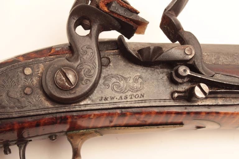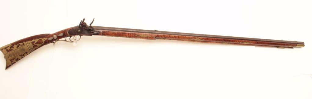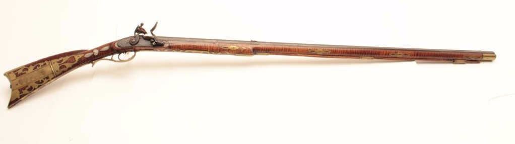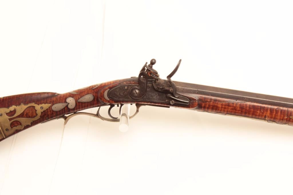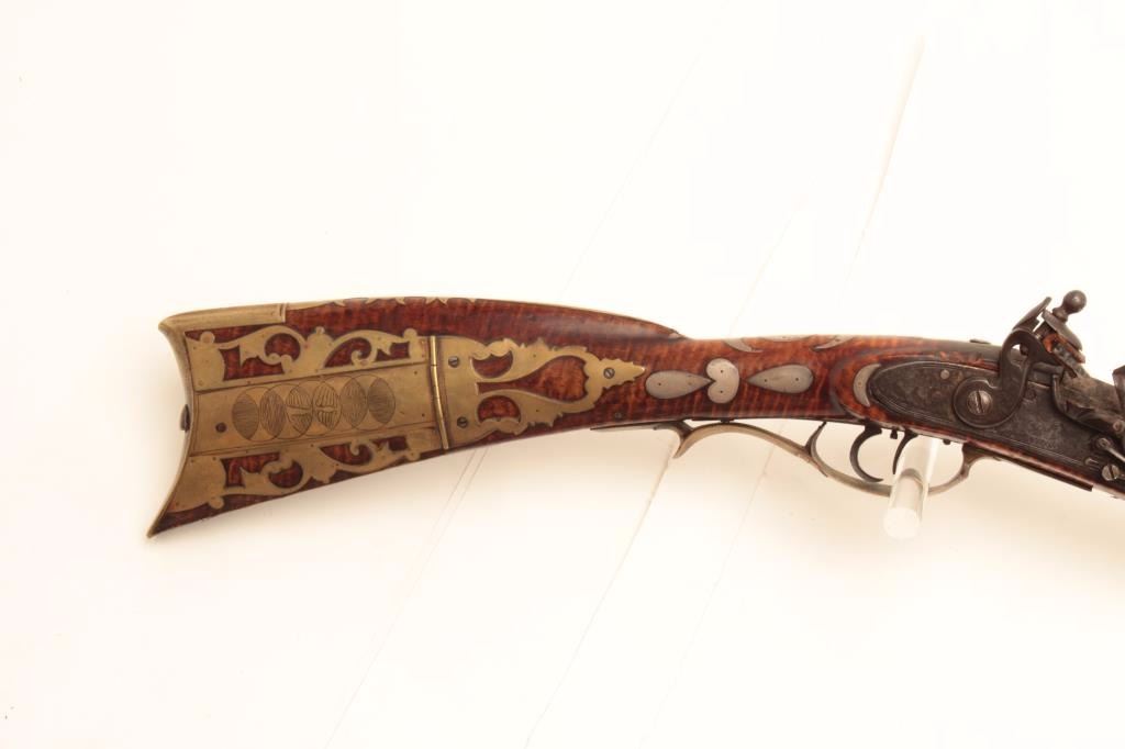 Western Pennsylvania style Kentucky rifle, .50 caliber, 42” octagon barrel marked “H D”, “J & W Aston” marked engraved lockplate, double set triggers (working at time of description), beautifultiger striped wood stock with brass mounts/patchbox and extensive pierced silver inlays including an American eagle on left side of butt stock along with bone and horn inlays plus carving at the rear of the leftside of butt stock. The condition of this fine piece of early American firearm artistry is very good to fine with an undisturbed rich patina to metal and wood surfaces; the architecture of the stock from the actionback is classic; there is an old repair to a sliver of wood in front of the lock plate. (Antique). Est.: $8,000-$16,000.