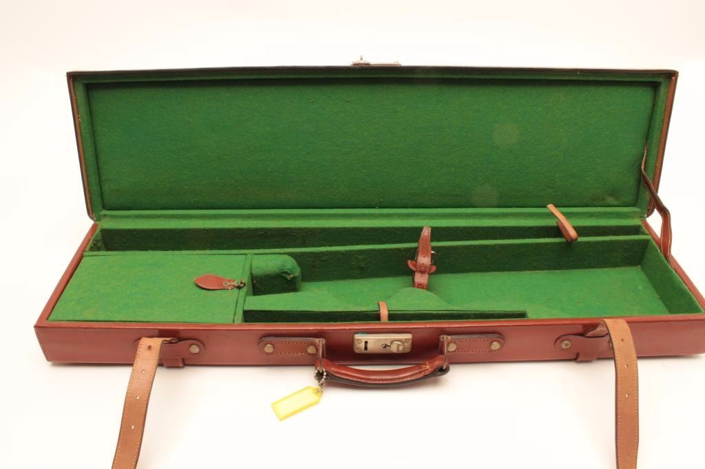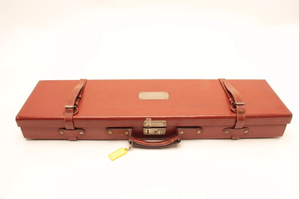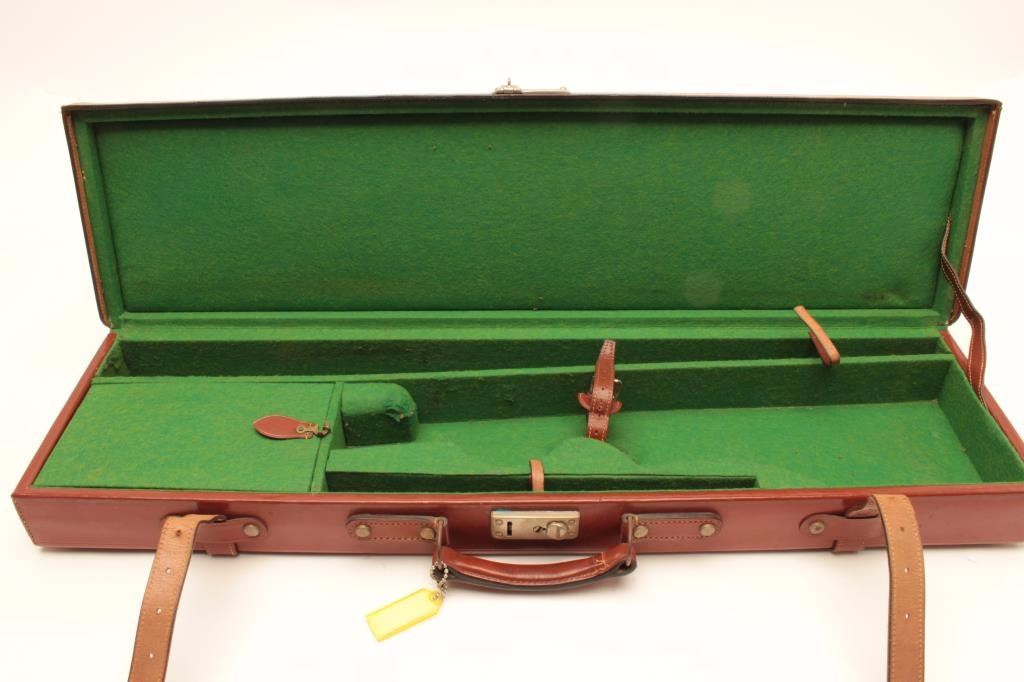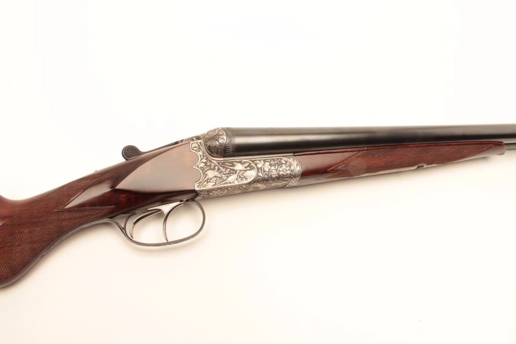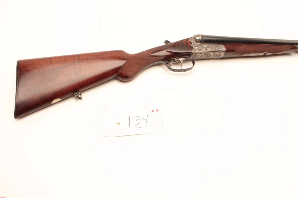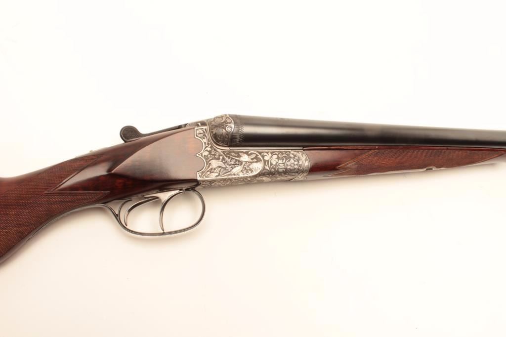 Abesser & Merkel SxS hammerless engraved shotgun, 12 gauge, 12 gauge, 30” barrels, blued finish to barrels, 3 panel game scenes on receiver, double triggers, cocking indicators, crossbolt lock, auto ejectors,checkered wood stocks, S/N 22111 with luggage style leather covered casing; in overall minty condition with finely accomplished engraving, fine bores, actions and finish; beautifully grained deluxe wood stocks.(Modern/PPT). Est.: $3,000-$6,000.
