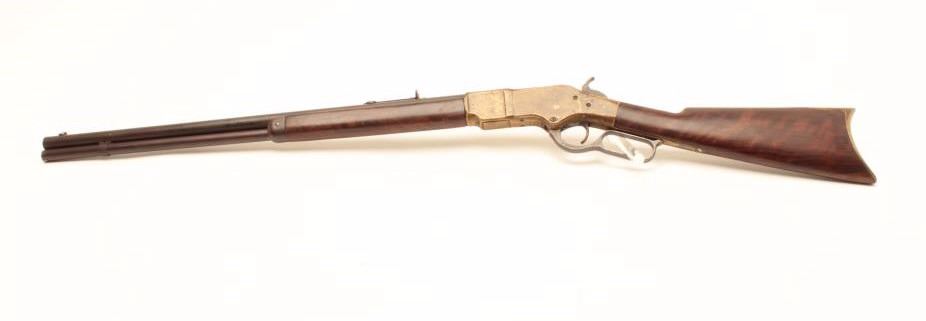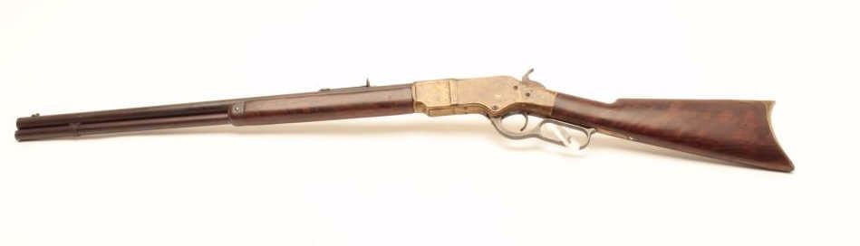 Winchester Model 1866 lever action rifle, .44 caliber, 24” round barrel, brass frame, wood stocks, no visible S/N; considerable restoration and replaced stocks. (Antique) Est.: $2,500-$5,000.