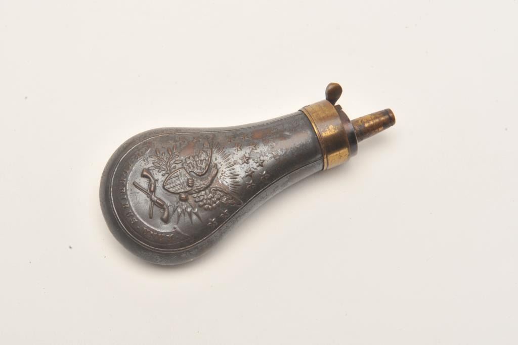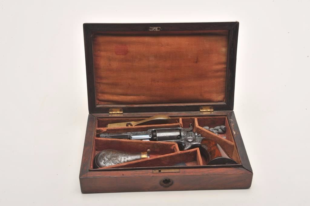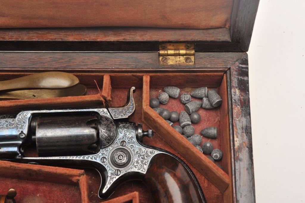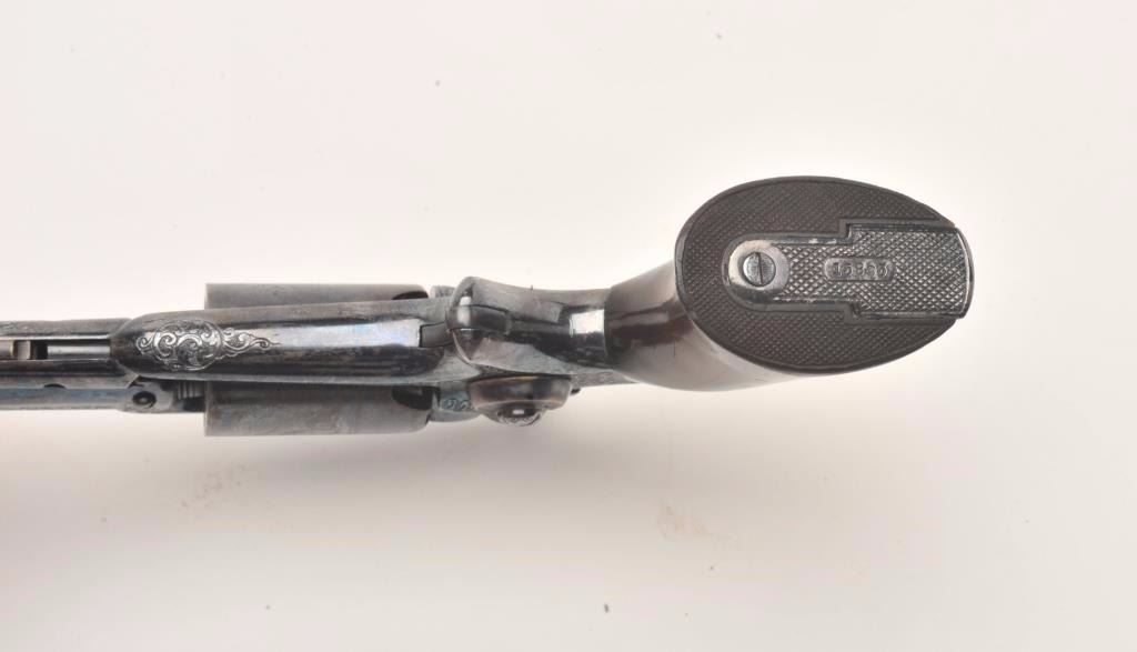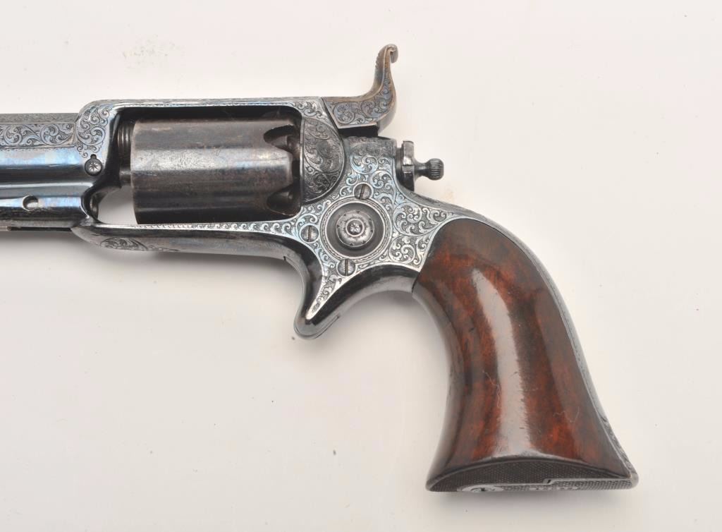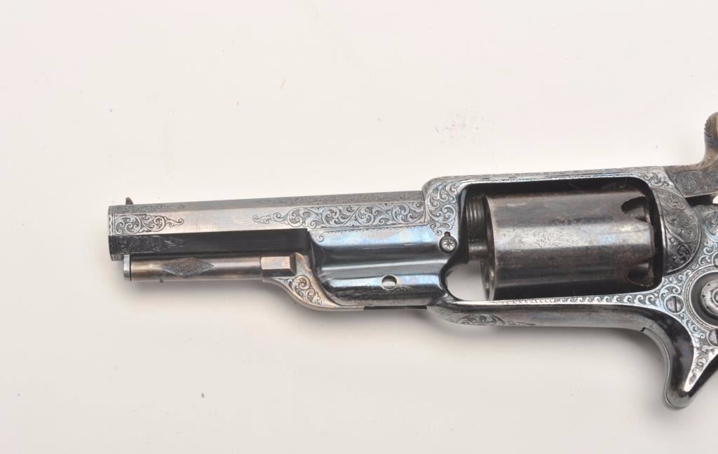 One of the most deluxe engraved Colt Root percussion revolvers we have ever encountered for sale. This 2nd Model Root, S/N 15895, is elaborately banknote scroll engraved by the master firearms engraver Gustav Young and has a hand checkered ramrod and cross hatched checkered butt with matching finish to bottom of grips (both of which are extremely unusual and deluxe features). The gun retains approximately 95%-98% of theoriginal high polish blue finish with only slight drifting as high polish specimens do. All of the original cylinder scene is visible with brilliant case hardening on hammer, very little or no use apparent on the arm. Cased in original partition style deluxe rosewood deep casing, with proper Colt’s patent flask retaining 80%-90%lacquer, original nipple wrench with most blue, original bullet mold showing 40% blue. Anexceptional deluxe Root! (Antique). Est.: $8,000-$16,000.