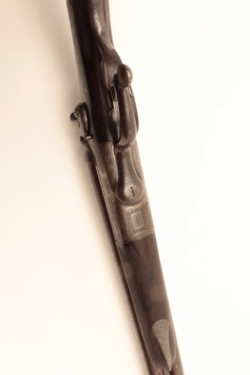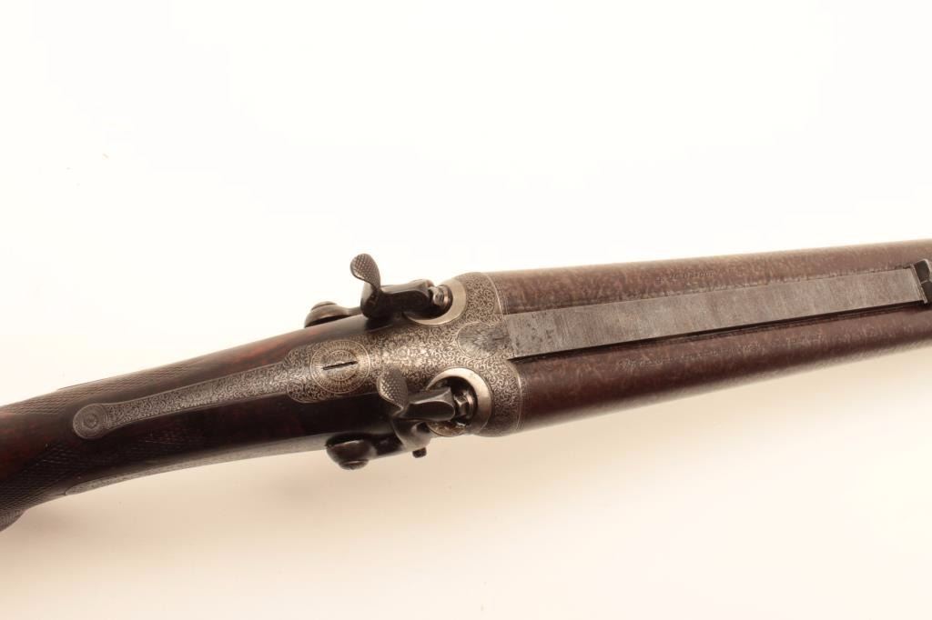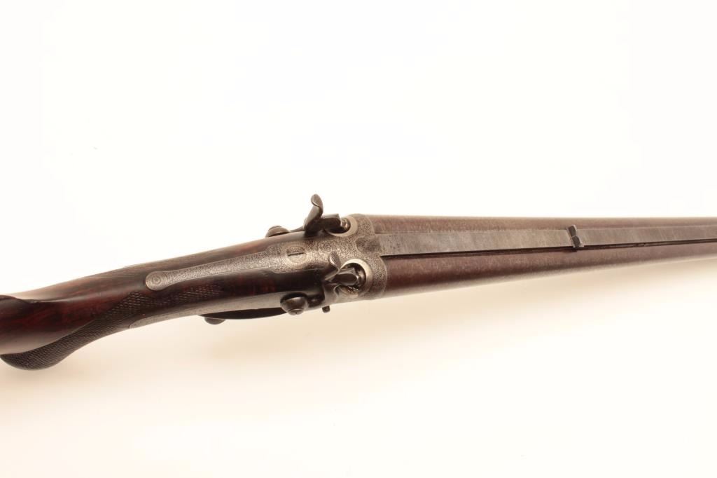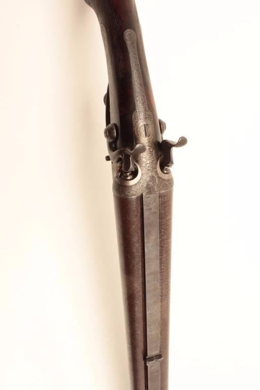 SxS black powder big game rifle by E.M. Reilly of London in .500 calibre with 28” Damascus twist barrels, London B.P. proofs, finely and fully “Best” quality engraving with select wood stock showing nice grain and hand cheek piece. Crisp action with tight lock up on under lever action. Bright bores and no mechanical problems. Very good plus overall condition with minor imperfections and normal use. Hand filed and raised ribwith 2 leaf express rear sight. A classic British colonial era big game rifle of the time used in India and Africa. (Antique) Est.: $5,000-$10,000