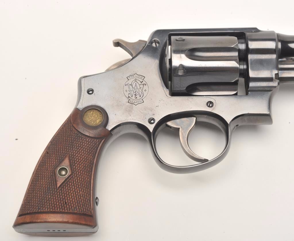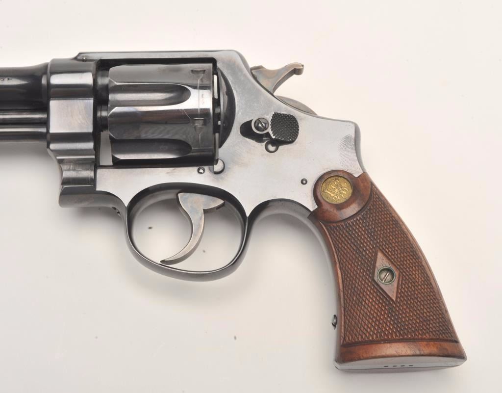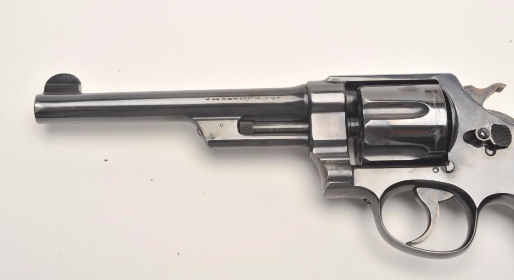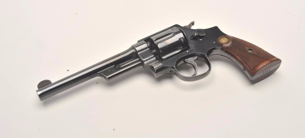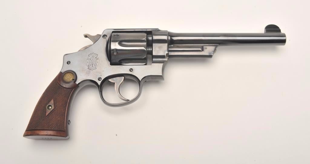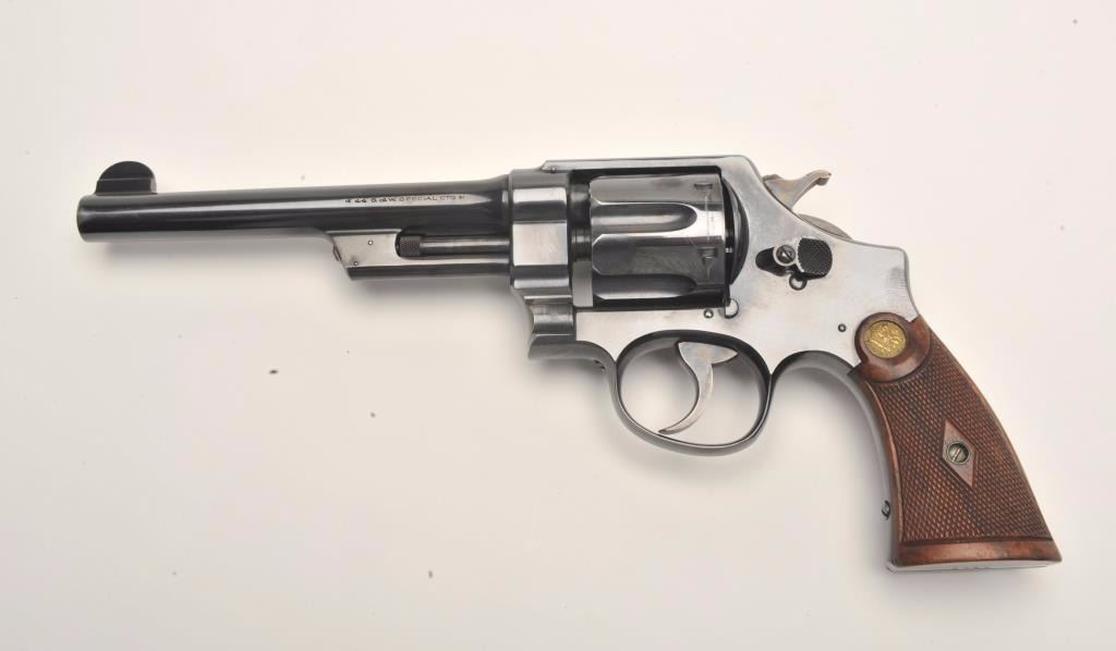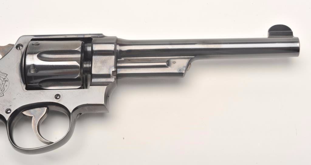 Smith and Wesson 1st Model Hand Ejector revolver, .44 S&W Special caliber, Serial #8223. The pistol is in fine overall condition with a 6 ½” barrel. The pistol retains approximately 95% of its muted bluefinish with light wear at the muzzle and a drag line on the cylinder. The pistol features vivid case coloring of the hammer and trigger. The checkered wood medallion grips are in very good condition with smallmars and storage wear noted. The bore is very good, the action crisp and markings are sharp. The pistol includes a Smith and Wesson factory letter confirming all features and indicating that the pistol was shippedto Bruce Wright, address not listed, on May 28, 1913. Also known as the .44 New Century Triple Lock, 1st Model Hand Ejectors were introduced in 1908 and manufactured until 1915. From the estate of Larry Gaertner.Est.: $2,000-$4,000. (C+R)