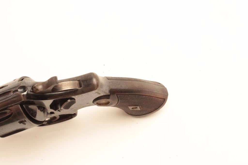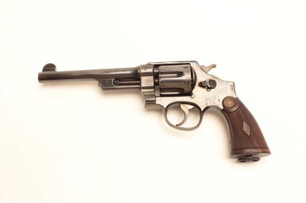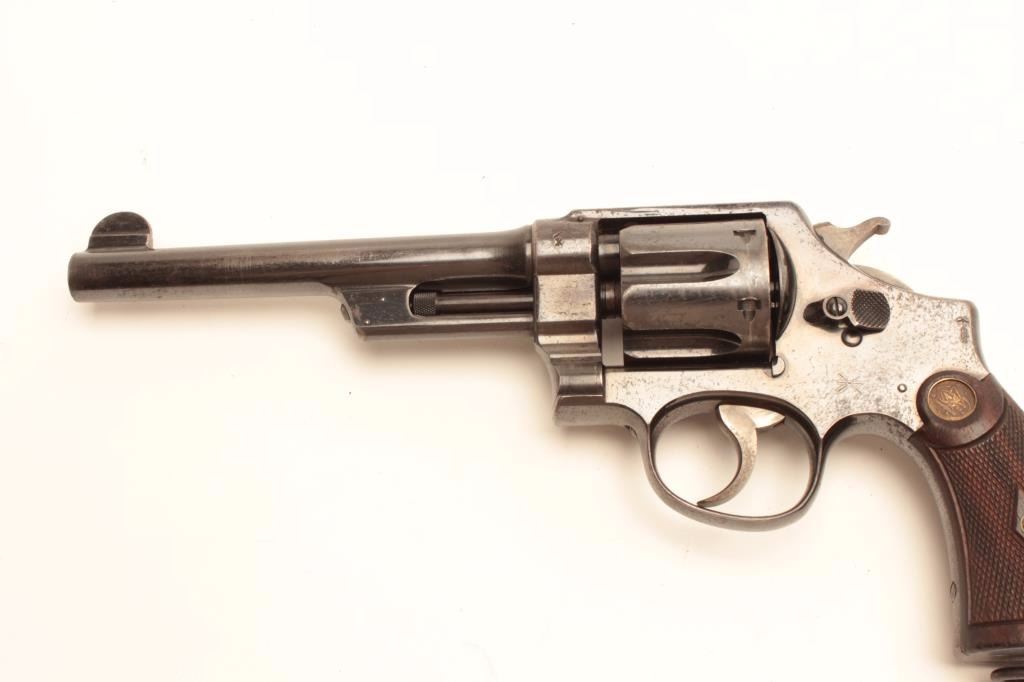 Smith and Wesson .455 Hand Ejector 1st Model revolver, .455 Mark II caliber, Serial #852. The pistol is in very good overall condition with a 6 ½” barrel. The pistol retains approximately 85% of its blue finish withhigh point edge wear, a loss of finish along the barrel and some light surface rust evident on the frame. The pistol features a five screw frame with muted case coloring on the hammer and trigger. There are multipleEnglish proofs, including the Broad Arrow on the pistol frame. The checkered wood medallion grips are in very good condition with small mars, compressions and a lanyard ring in the butt. The bore is good, theaction is crisp and markings are sharp. The pistol includes a Smith and Wesson factory letter confirming all features indicating that the pistol was shipped to Remington Union Metallic Cartridge Company, New YorkCity on October 21, 1914. A World War I era Triple Lock that went to England. From the estate of Larry Gaertner. Est.: $1,400-$2,800. (C+R)