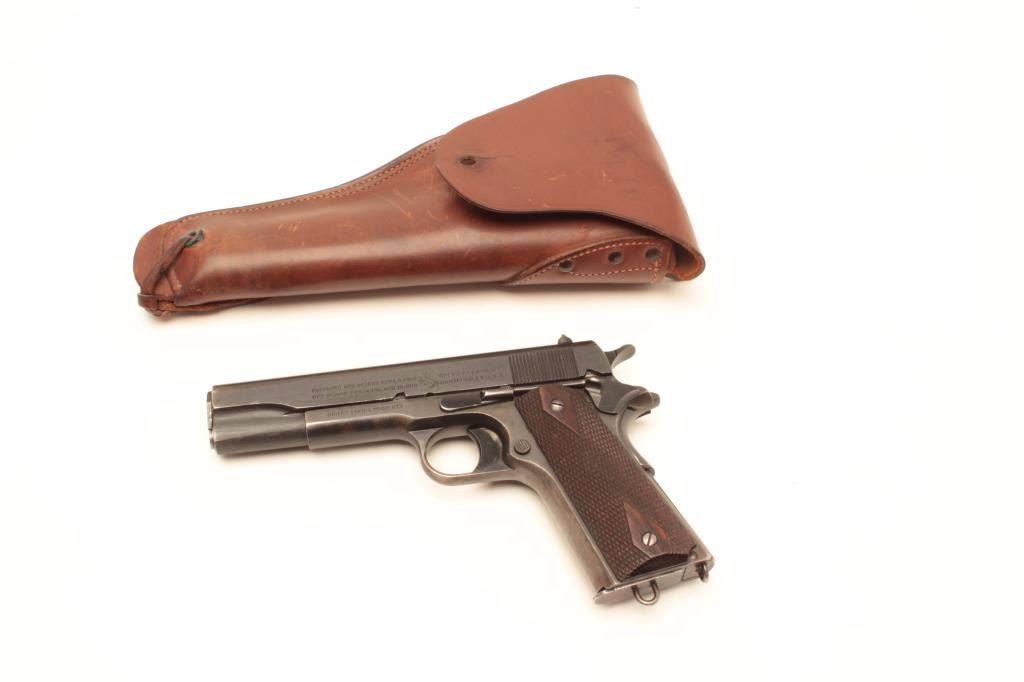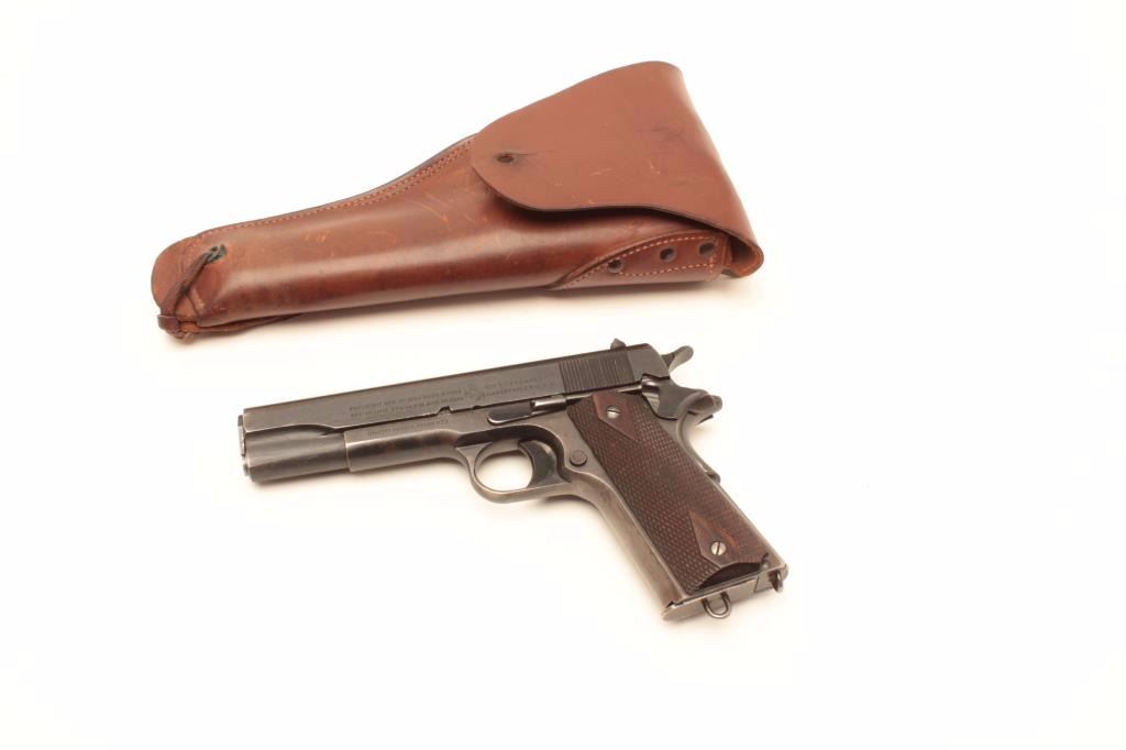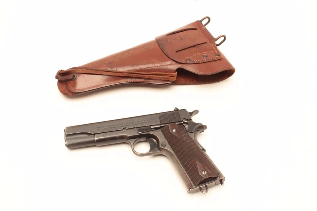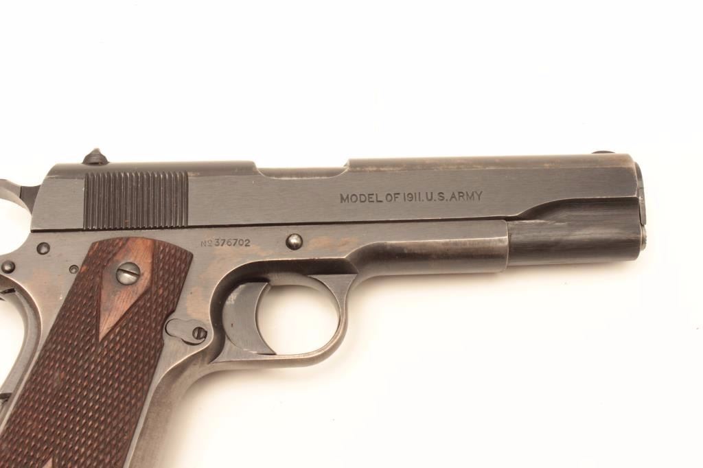 United States Property marked Colt Model 1911 semi-automatic pistol, .45 caliber, 5” barrel, blued finish, checkered wood grips, lanyard ring magazine, S/N 376702, in overall very good to fine condition showing themajority of its military finish with some areas of wear and flaking, crisp action and markings, very good + bore and grips. Accompanied by a military style leather flap holster. (C&R/PPT). Est.:$1,500-$3,000.