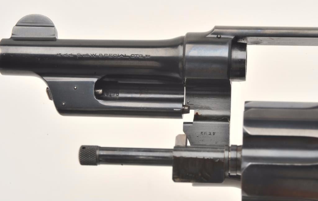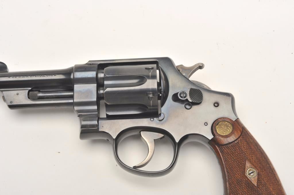 Smith and Wesson 1st Model Hand Ejector revolver, .44 S&W Special caliber, Serial #14480. The pistol is in fine overall condition with a 4” barrel. The pistol retains approximately 95% of its blue finishwith wear at the muzzle and a drag line on the cylinder noted. The pistol features a five screw frame and vivid case coloring of the hammer and trigger. The checkered wood medallion grips are in very good condition.The bore is very good, the action crisp and markings are sharp. The pistol includes a Smith and Wesson factory letter confirming all features and indicating the pistol was shipped to Herreshoff Manufacturing Co., noaddress given, on April 3, 1917. Also known as the .44 New Century Triple Lock, 1st Model Hand Ejectors were introduced in 1908 and manufactured until 1915. A great World War I era Triple lock with a 4” barrel. From the estate of Larry Gaertner. Est.: $1,400-$2,800. (C+R)