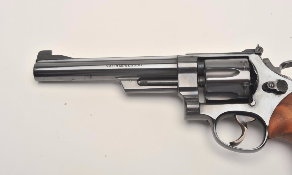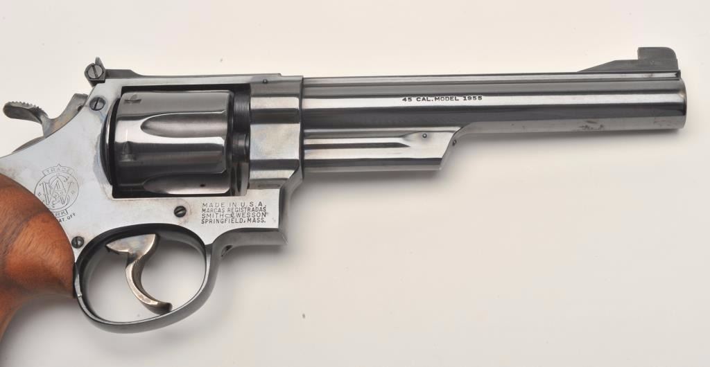 Smith and Wesson Pre-Model 25 1955 Target revolver, .45 ACP caliber, Serial #S161675. The pistol is in nearly excellent condition with a 6 ½” barrel with a ramp front and adjustable rear sights. The pistol retainsapproximately 95% of its blue finish with some small marks on the underside of the barrel and a faint drag line on the cylinder. The pistol features vivid case color on the hammer and trigger. The checkered woodmedallion target grips are in nearly excellent condition showing little use and only light handling marks. The bore is very good, the action is crisp and the marks are sharp. The pistol includes a Smith andWesson factory letter which confirms the features and indicates the pistol was shipped to Morey Mercantile Co., Denver, CO., on March 30, 1955. From the estate of Larry Gaertner. Est.: $1,000-$2,000. (C+R)