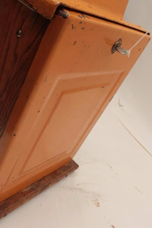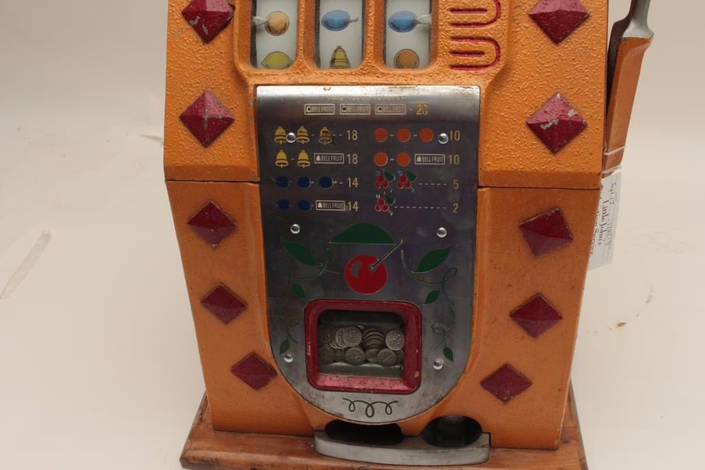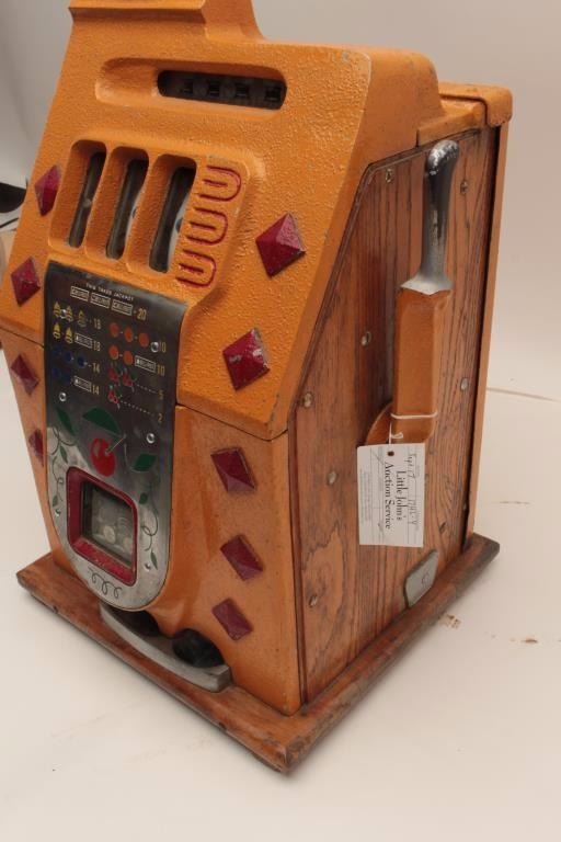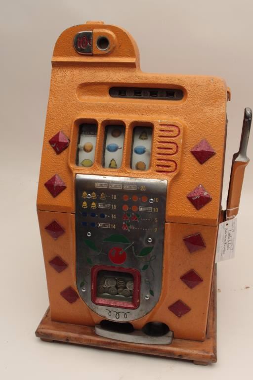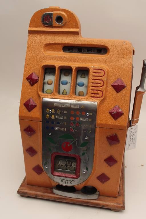 Lot 195 Mills .10 cent vendor slot machine. Re-vamp with key, cash box and jackpot counter. Original good.