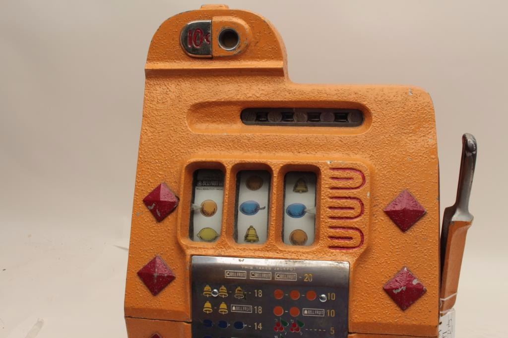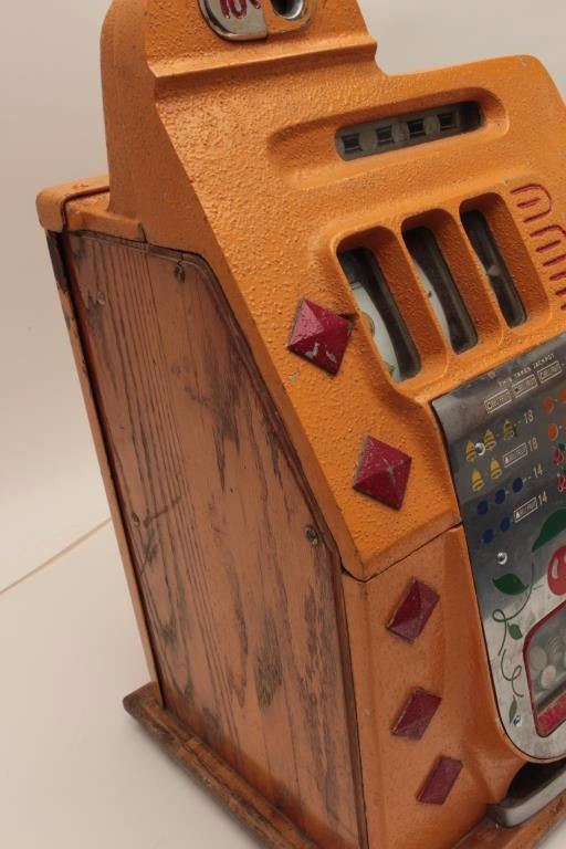 Mills .10 cent vendor slot machine. Re-vamp with key, cash box and jackpot counter. Original good. Est.: $900-$1800