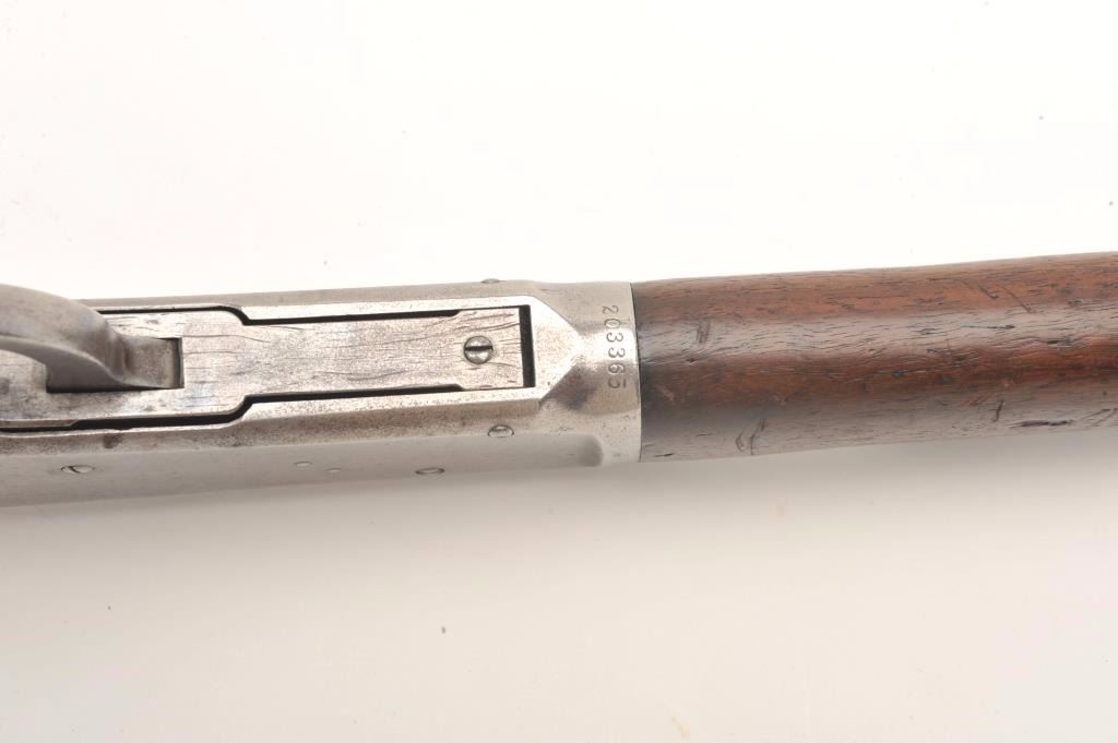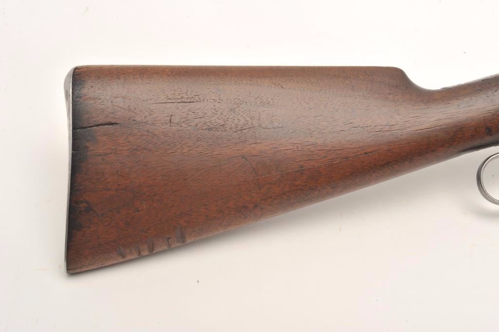 Winchester Model 1894 Special Order lever action rifle, .30 W.C.F. caliber, 24” half round/half octagon barrel, half magazine, shotgun butt, wood stocks, S/N 203365, in overall good condition with gray patina onmetal surfaces and traces of original blue in protected areas, crisp action, good markings and fair bore; butt stock shows old hash marks on bottom near butt plate and some scattered mars, scratches and a couple oldsmall cracks from age; desirable with the special features. (C&R). Est.: $900-$1,800.