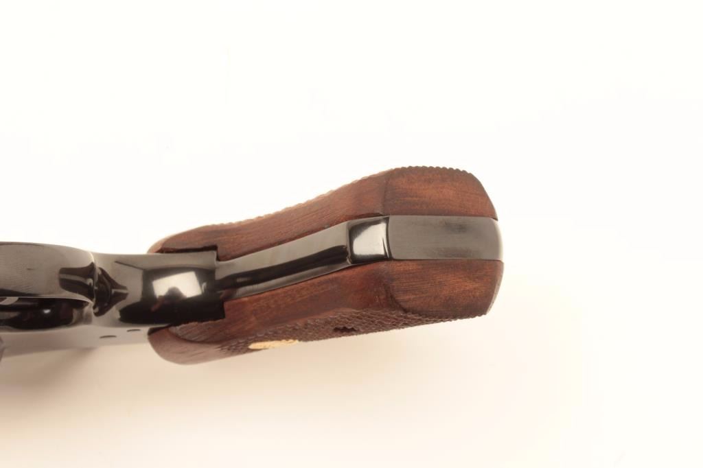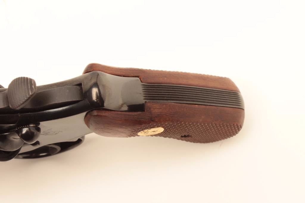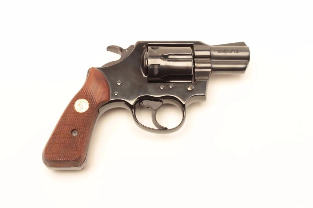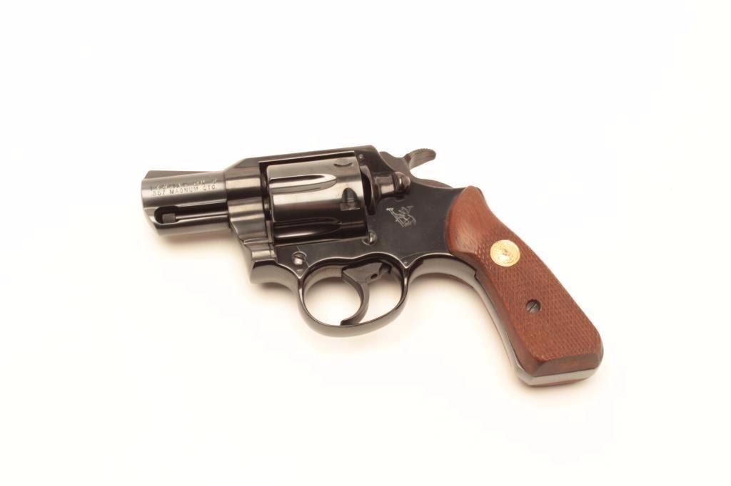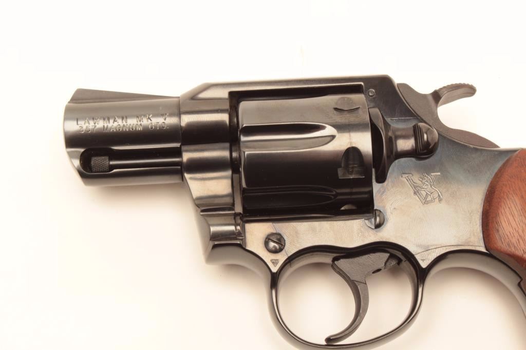 Colt Lawman MK. V revolver, .357 Magnum caliber, Serial #34941V. The pistol is as new in the factory wood grain box with a 2” barrel. The pistol retains approximately 98% of its blued finish with a faint drag lineon the cylinder. The checkered wood gold medallion grips are in fine condition with sharp checkering. The bore is very good, the action crisp and markings are sharp on this lightly used Colt. The box is in goodcondition with losses at the corners and all packaging material included. From the Gil Newton collection. $900-$1,800. (Modern).