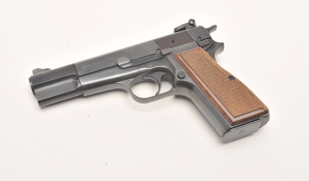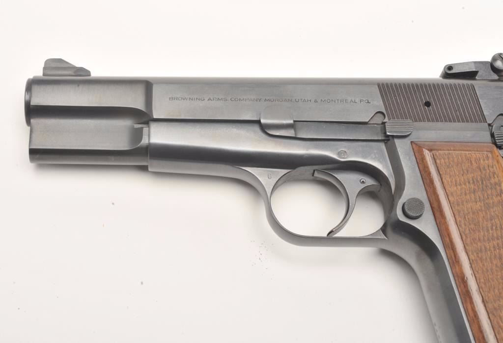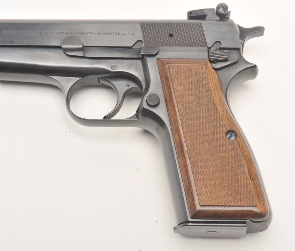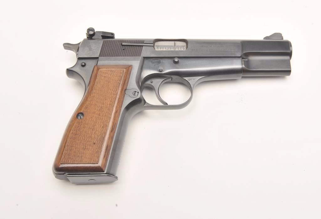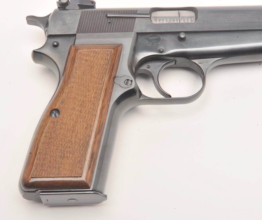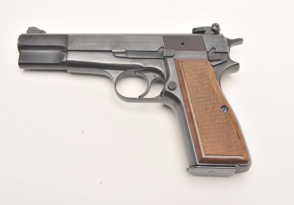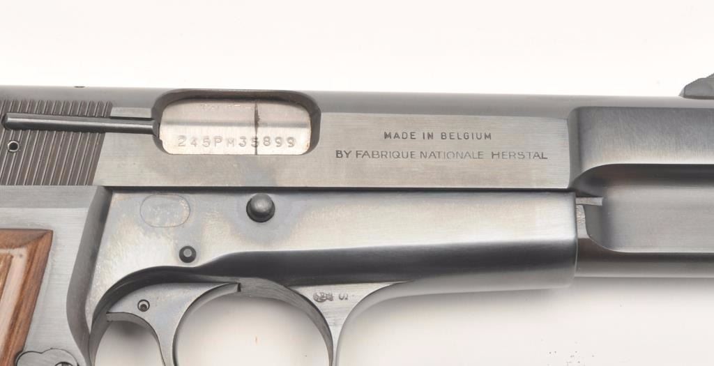 Browning Hi-Power semi-automatic pistol, 9mm caliber, 4.75” barrel, blued finish, adjustable rear sight, checkered wood grips, S/N 245PM35899, NO CALIFORNIA SALE/HI CAPACITY MAGAZINE; in overall fine conditionwith majority of its original finish, fine bore, action, markings and grips. (Modern/PPT). Est.: $800-$1,600.