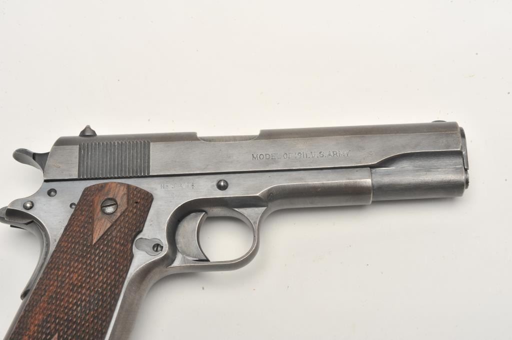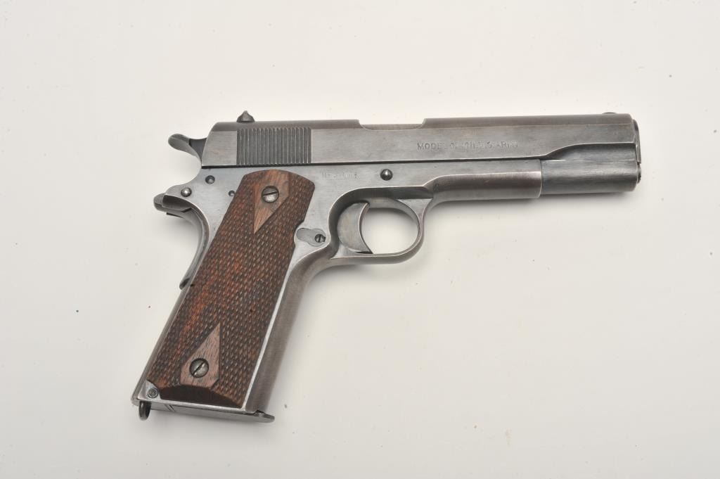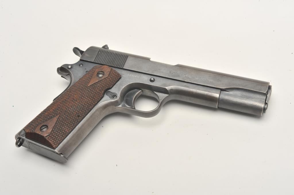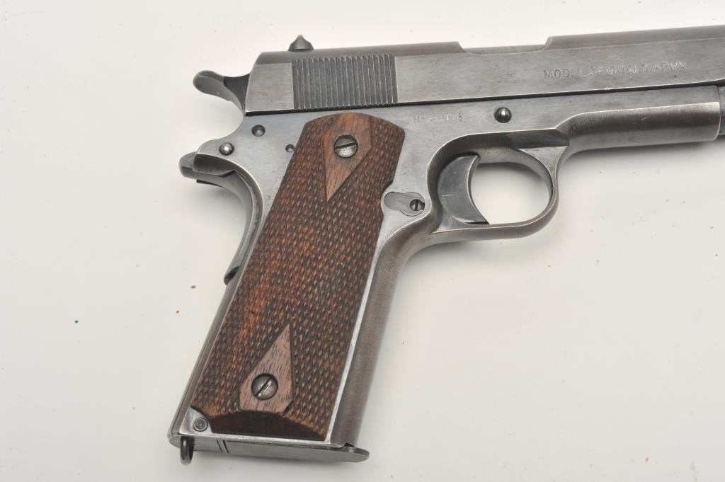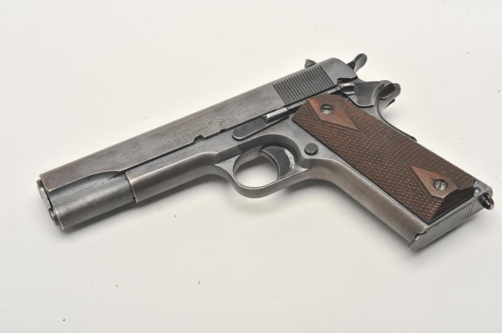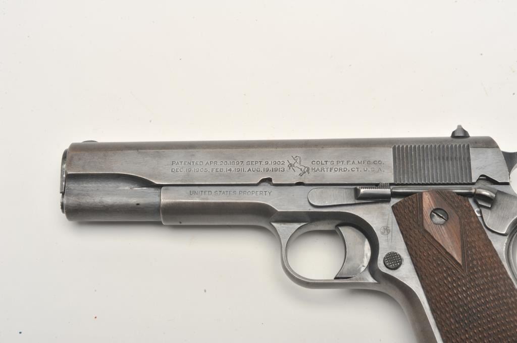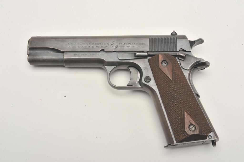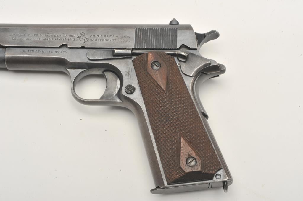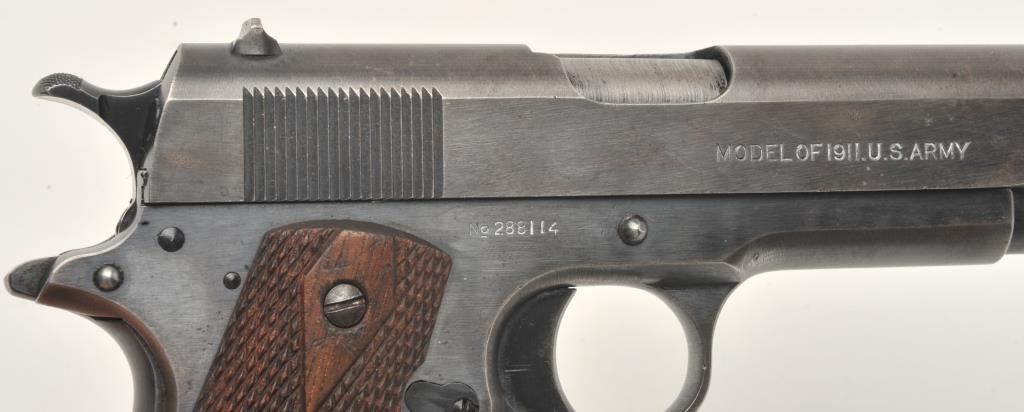 United States Property marked Colt Model 1911 semi-automatic pistol, .45 caliber, blued finish, checkered wood grips, two-tone magazine, S/N 288114, in overall very good to near fine condition showing the majority ofits military finish, some high point wear and wear on the grip straps; good bore, crisp action and markings; fine grips. (C&R/PPT). Est.: $1,800-$3,600.