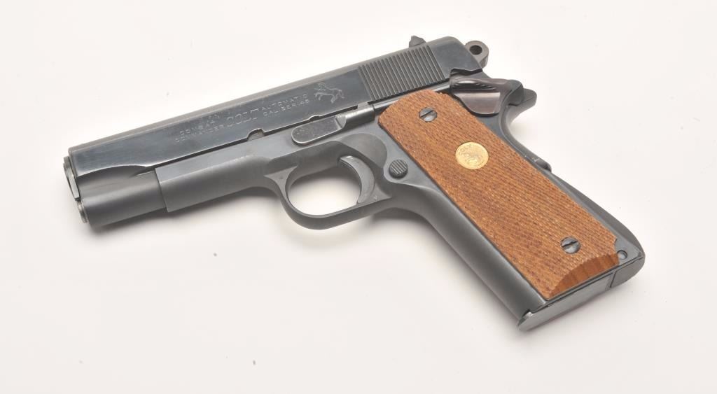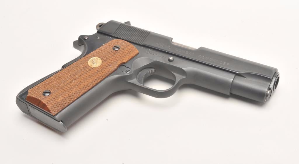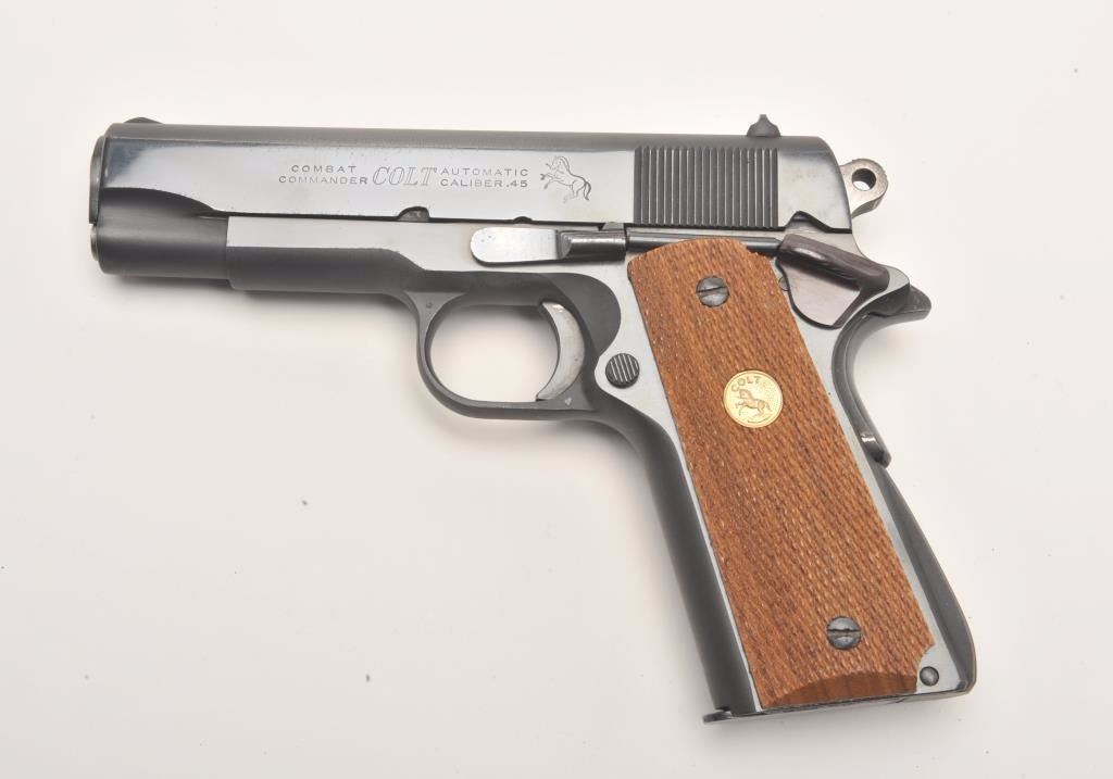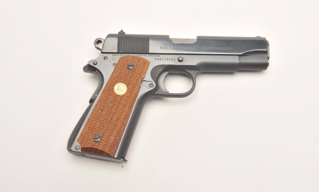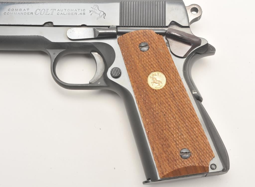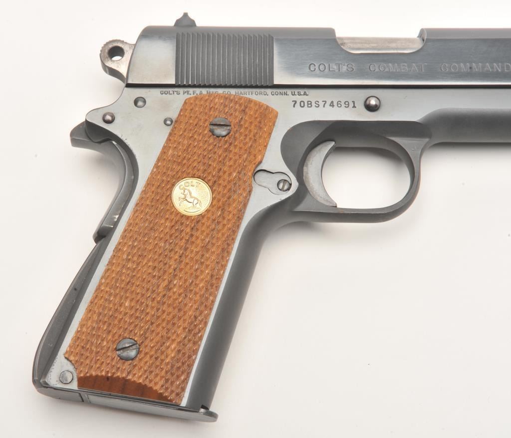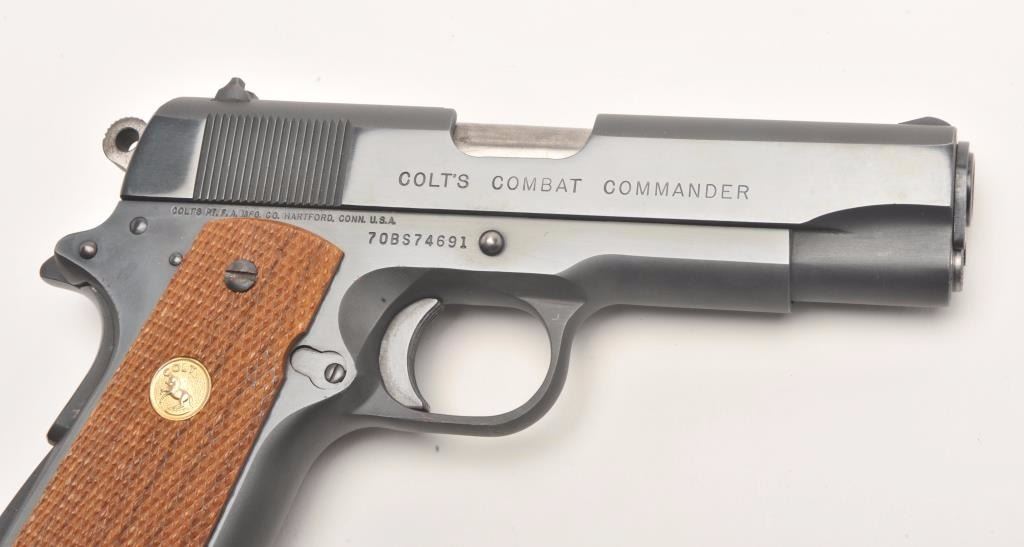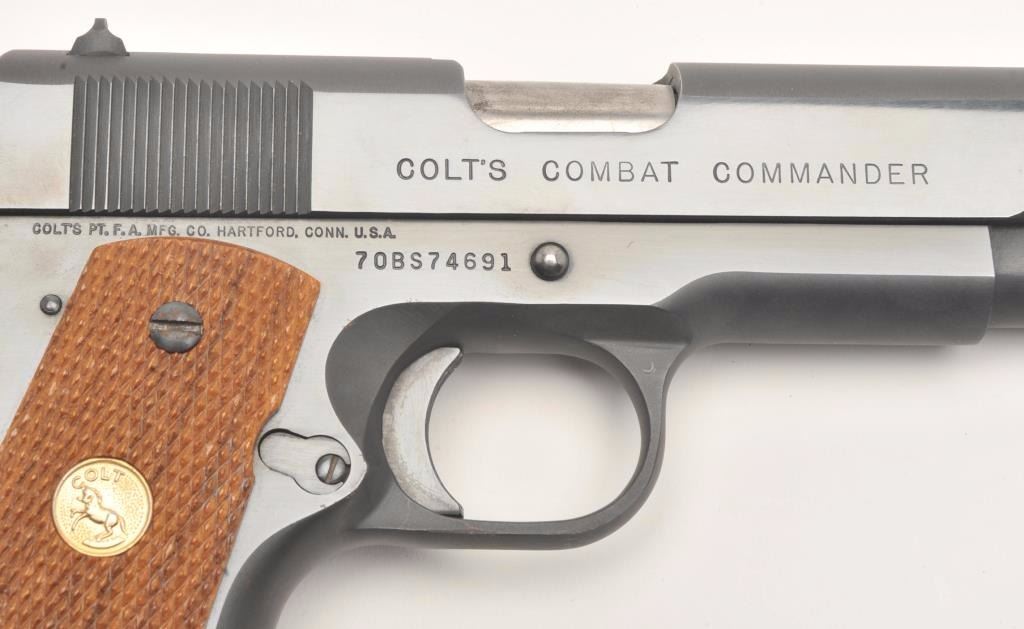 Colt Combat Commander semi-automatic pistol, .45 caliber, 4.25” barrel, blued finish, checkered wood medallion grips, S/N 70BS74691, in overall fine condition displaying the majority of its bright bluefinish with some scattered light pitting along the left top edge of the slide, apparently from long storage; otherwise fine as stated; fine bore, crisp action, sharp markings and fine grips. (Modern/PPT). Est.: $1,200-$1,800.